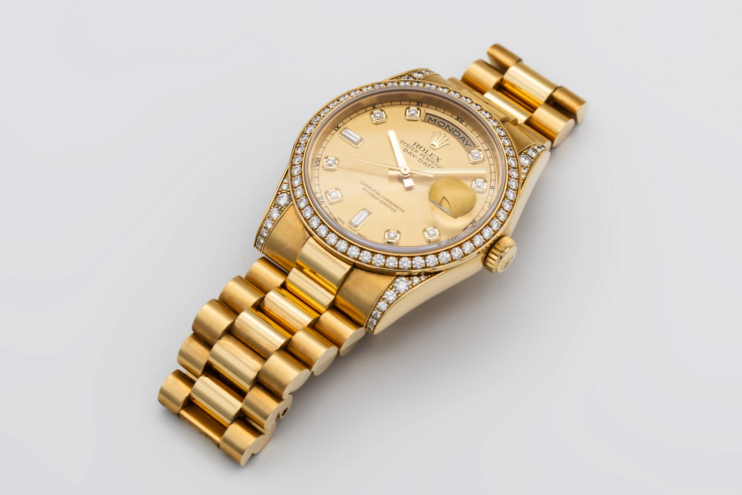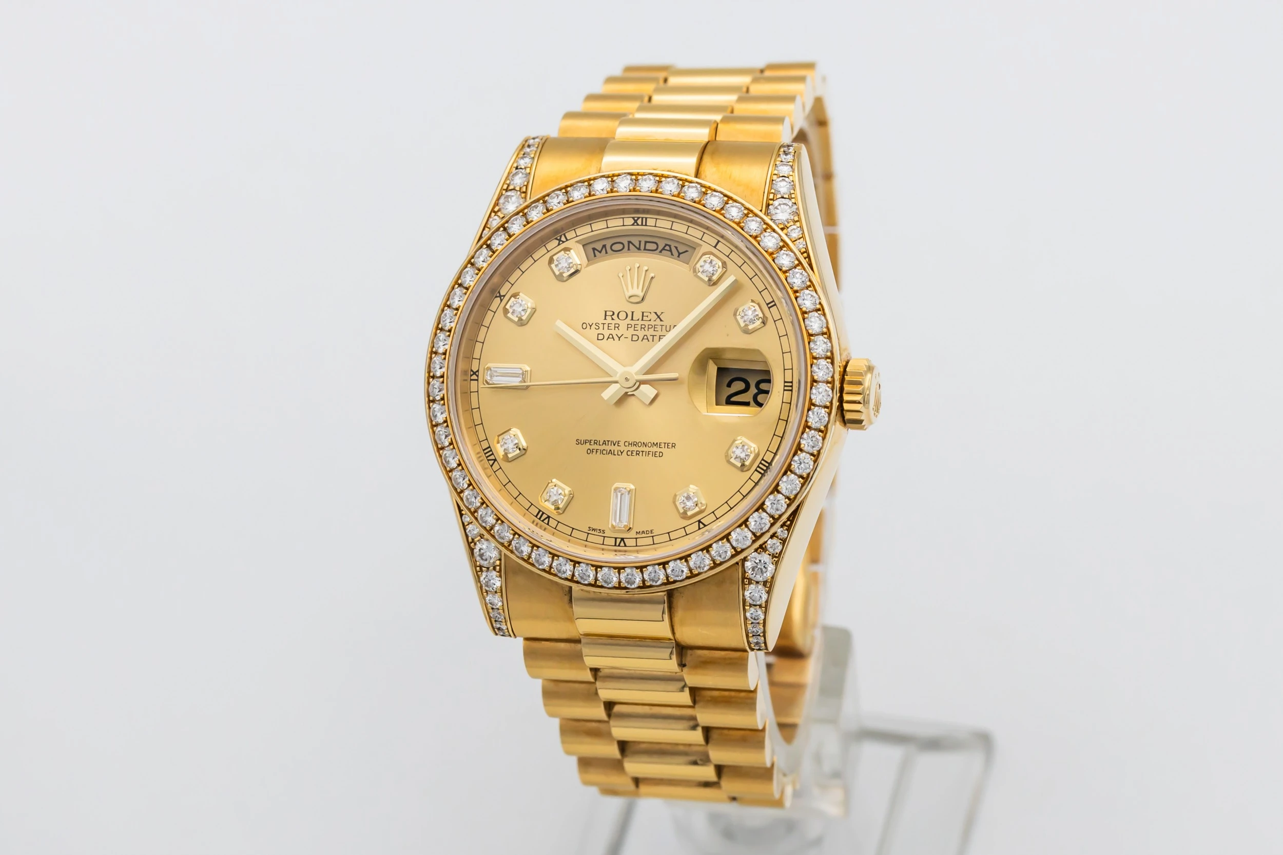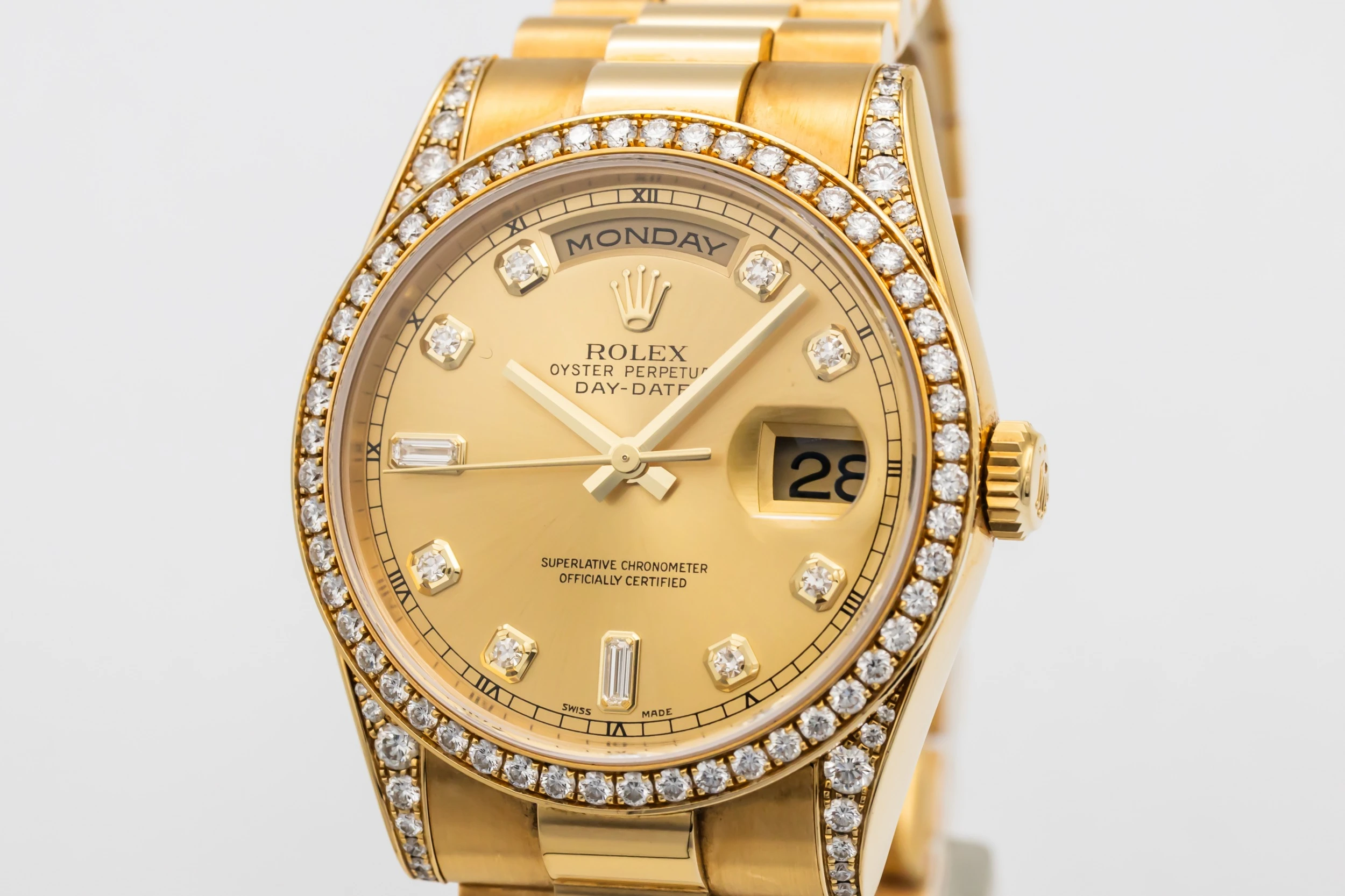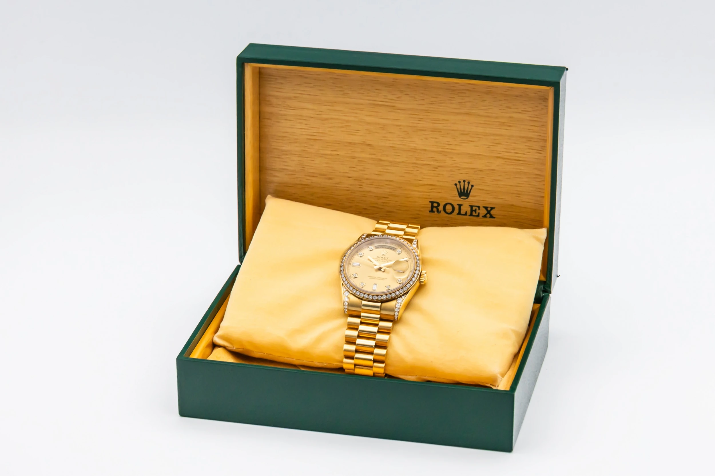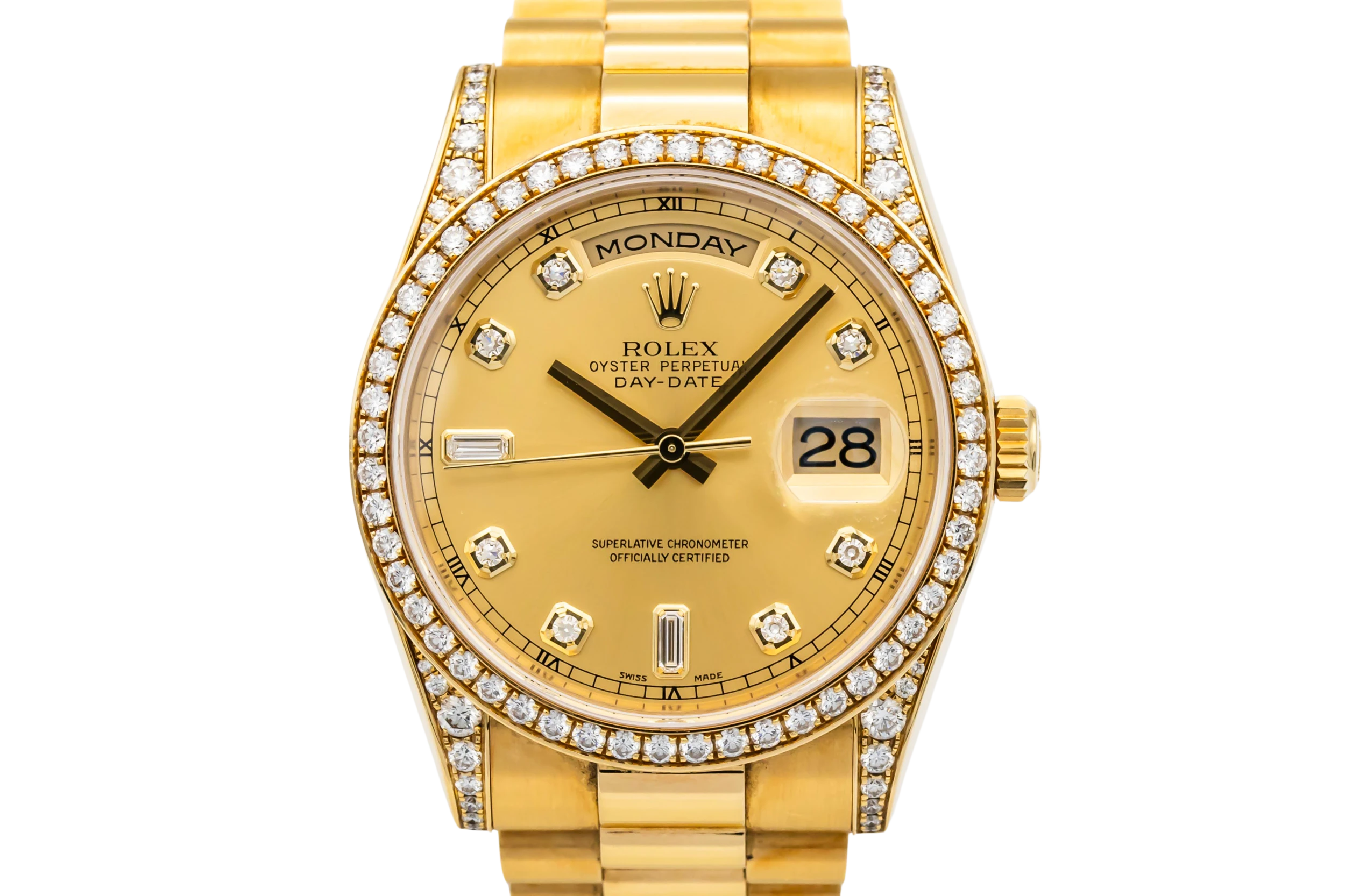 This 2001 Rolex Day-Date 36mm features a champagne dial with factory diamond dial, complete with applied hour markers and refined hands. The day of the week is displayed fully at 12 o’clock, and the date at 3 o’clock is magnified by Rolex’s signature Cyclops lens. The radiant gold case and bracelet capture light and presence, creating a timeless and luxurious wrist statement.