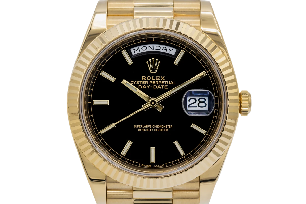 This 2016 Rolex Day-Date 40mm features a black motif dial with 18ct yellow gold baton markers. The dial is the distinctive face of a Rolex watch, the feature most responsible for its identity and readability. Also featuring a 18ct yellow gold president bracelet and a fluted bezel.