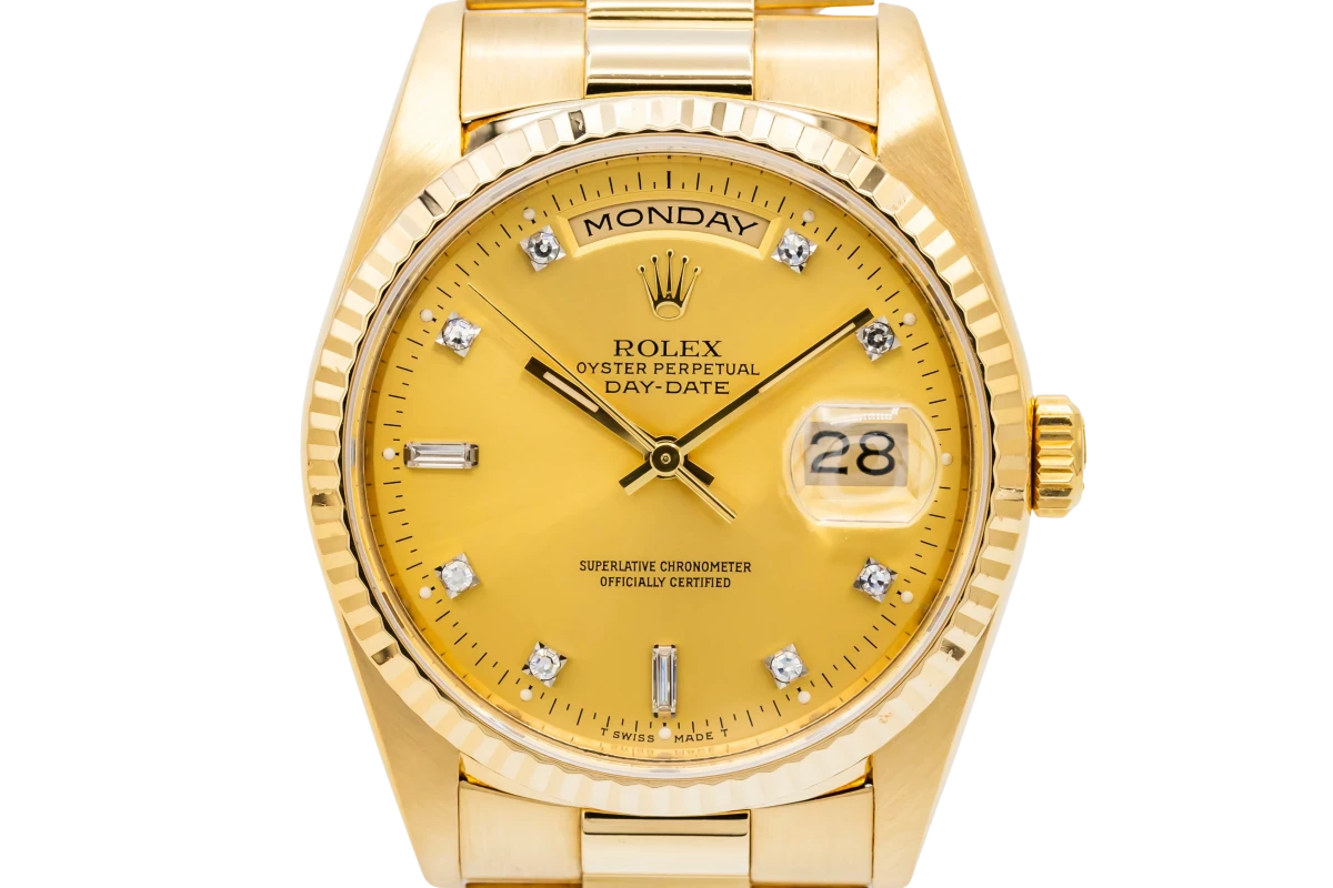 This 1993 Rolex Day-Date 36mm features a champagne dial with factory diamond. The dial is the distinctive face of a Rolex watch, the feature most responsible for its identity and readability. Also featuring a 18ct yellow gold president bracelet and a fluted bezel.