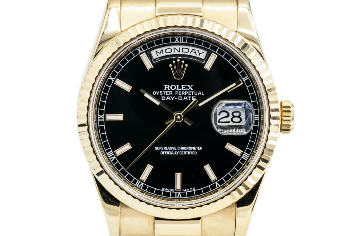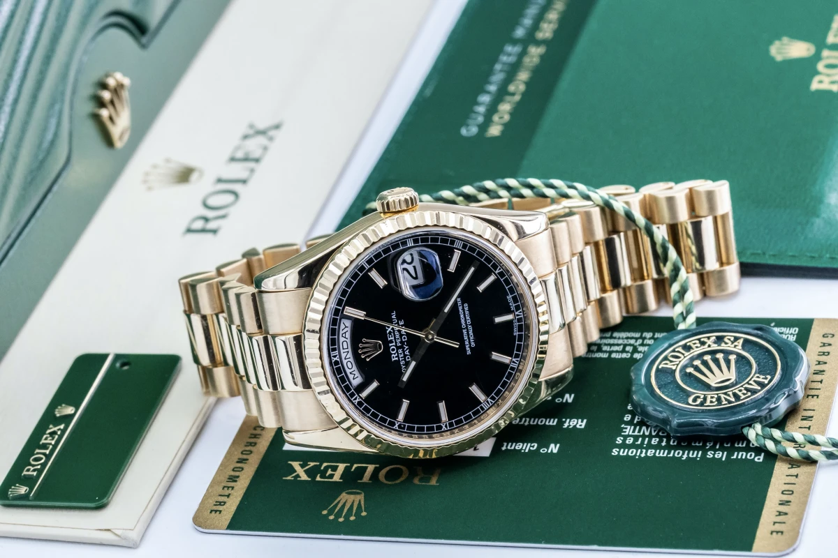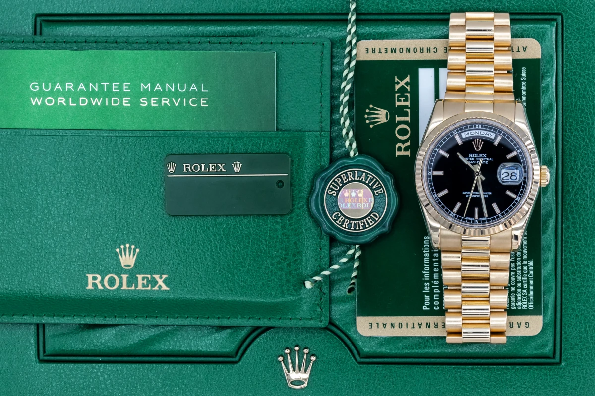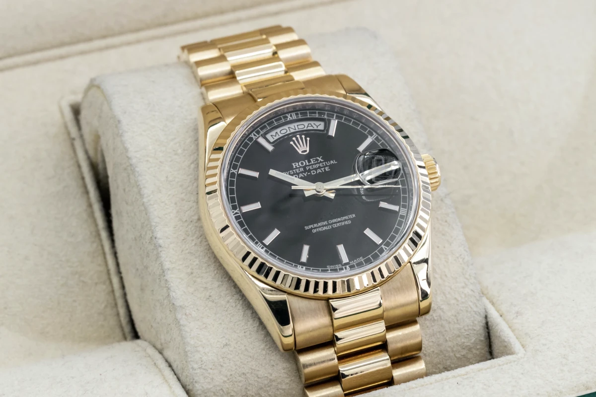 This 2010 Rolex Day-Date Features A 36mm Black Baton Dial, A Full 18ct Yellow Gold Presidential Bracelet And A Full 18ct Yellow Gold Fluted Bezel.