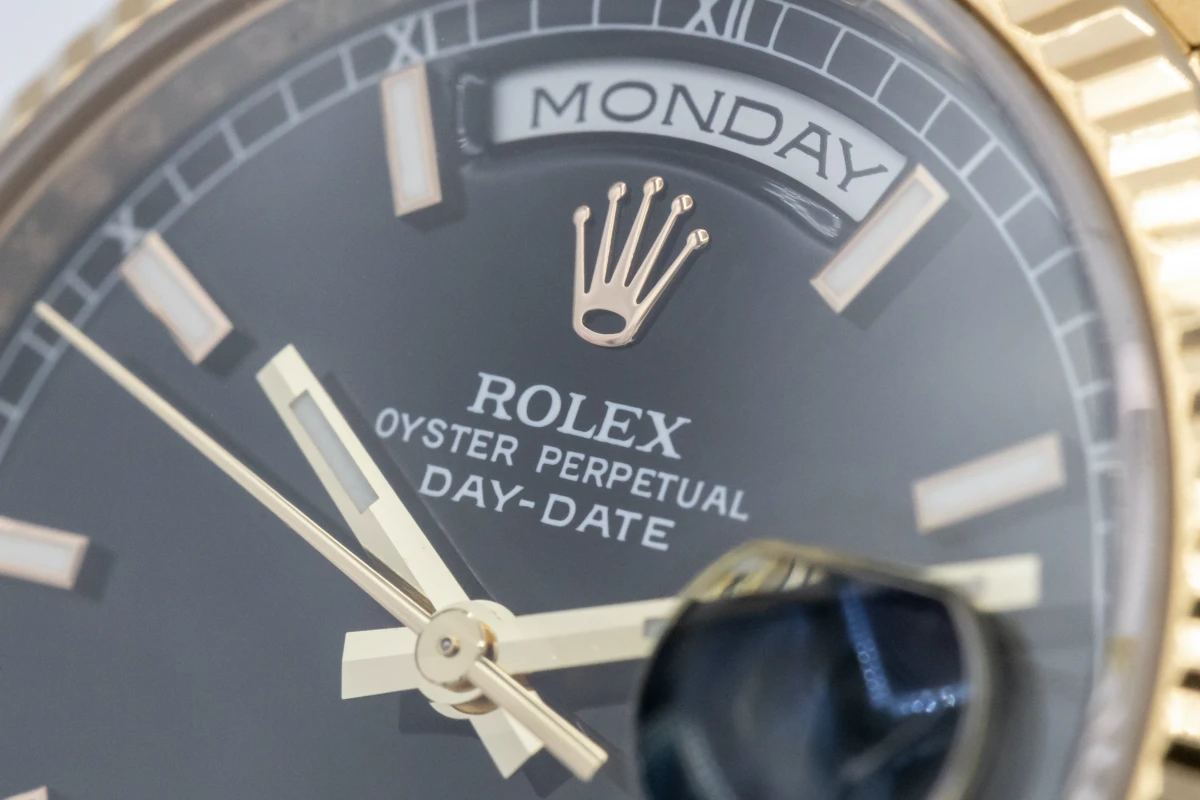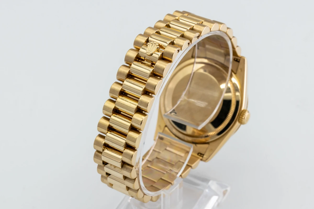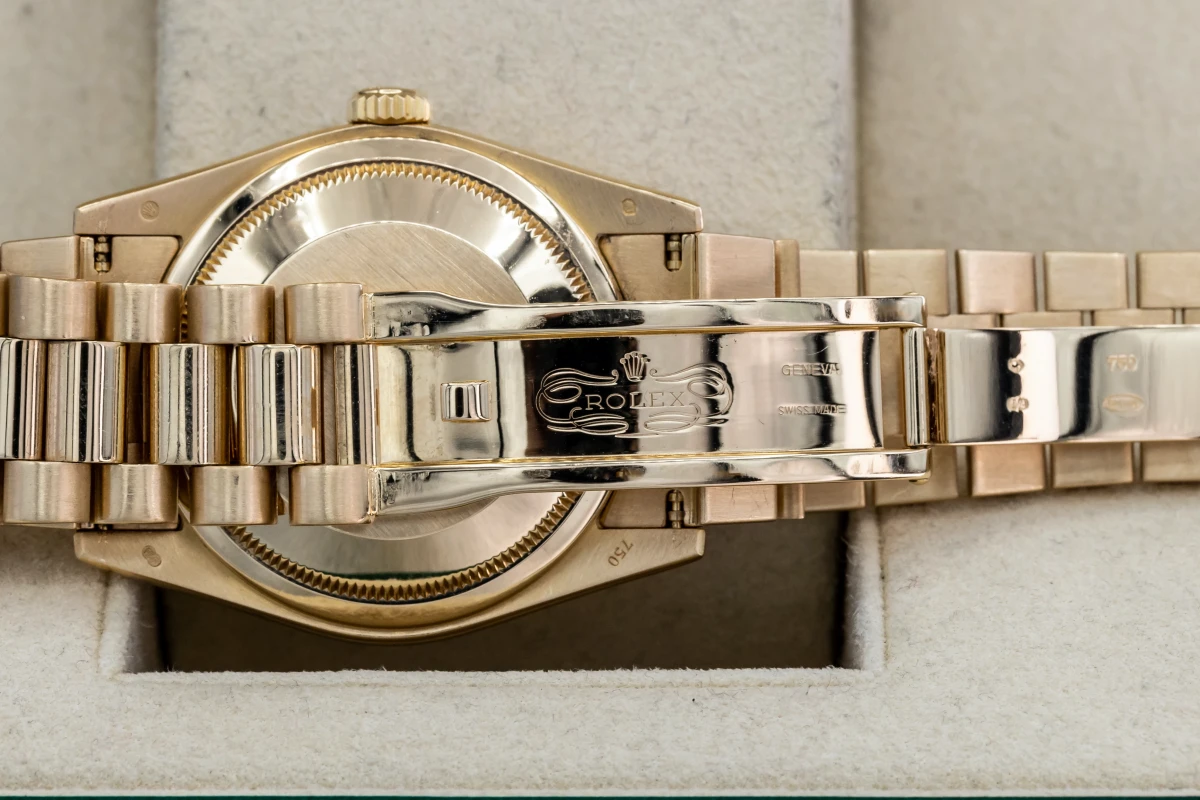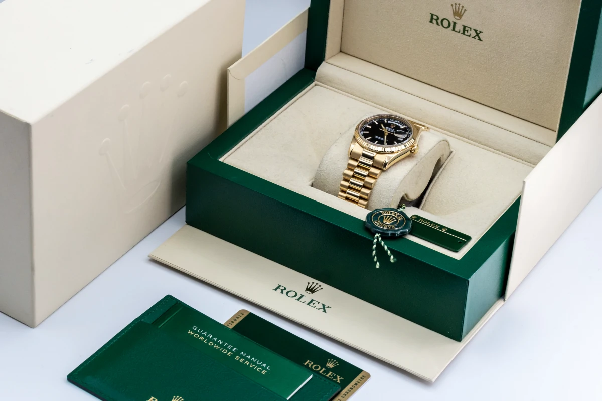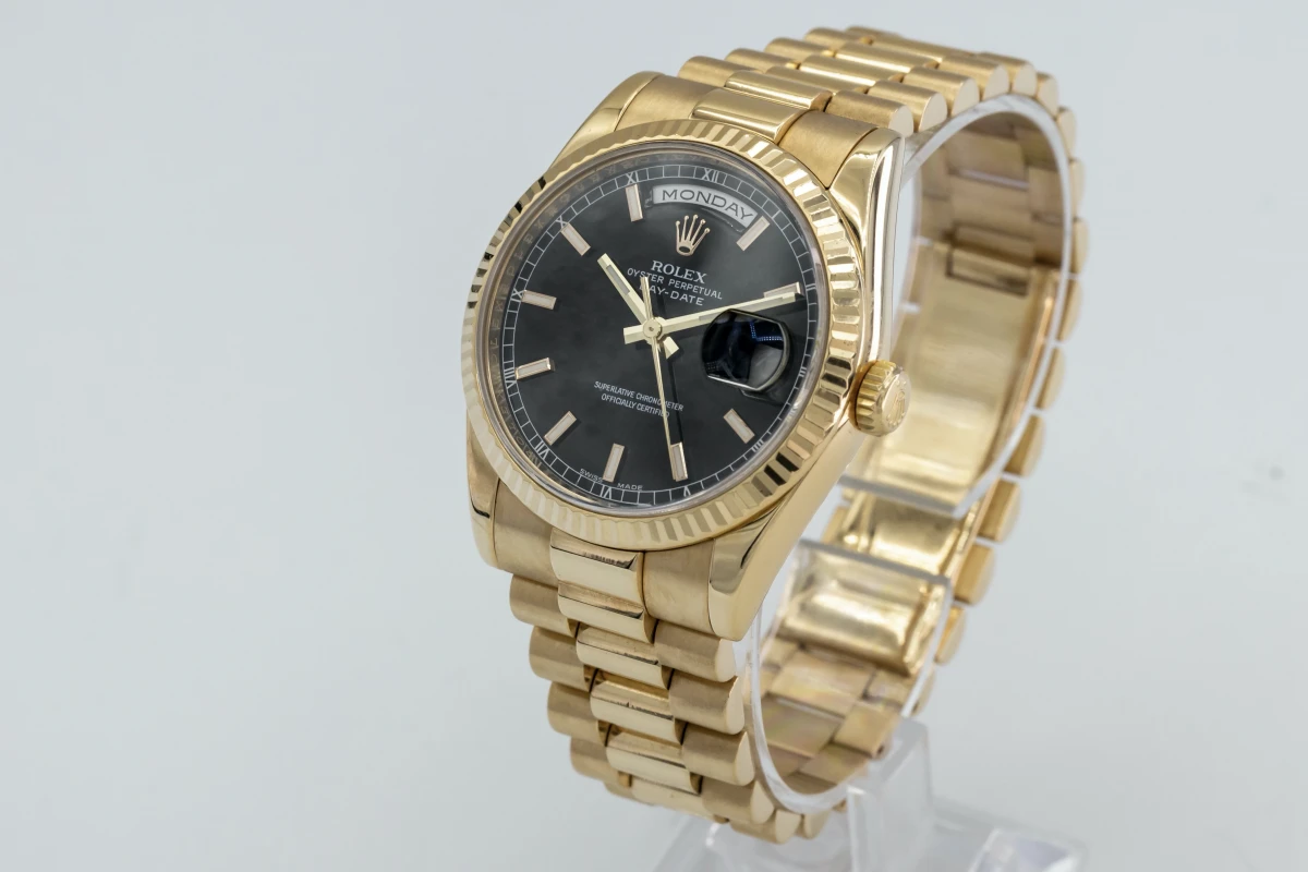 This 2010 Rolex Day-Date Features A 36mm Black Baton Dial, A Full 18ct Yellow Gold Presidential Bracelet And A Full 18ct Yellow Gold Fluted Bezel.