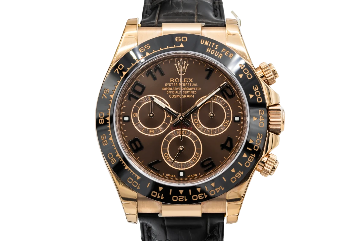 This 2017 Rolex Cosmograph Daytona 40mm features a chocolate dial with arabic numerals and a black leather bracelet. It is also fitted with a black bezel with engraved tachymetric scale, in a 18ct rose gold case.