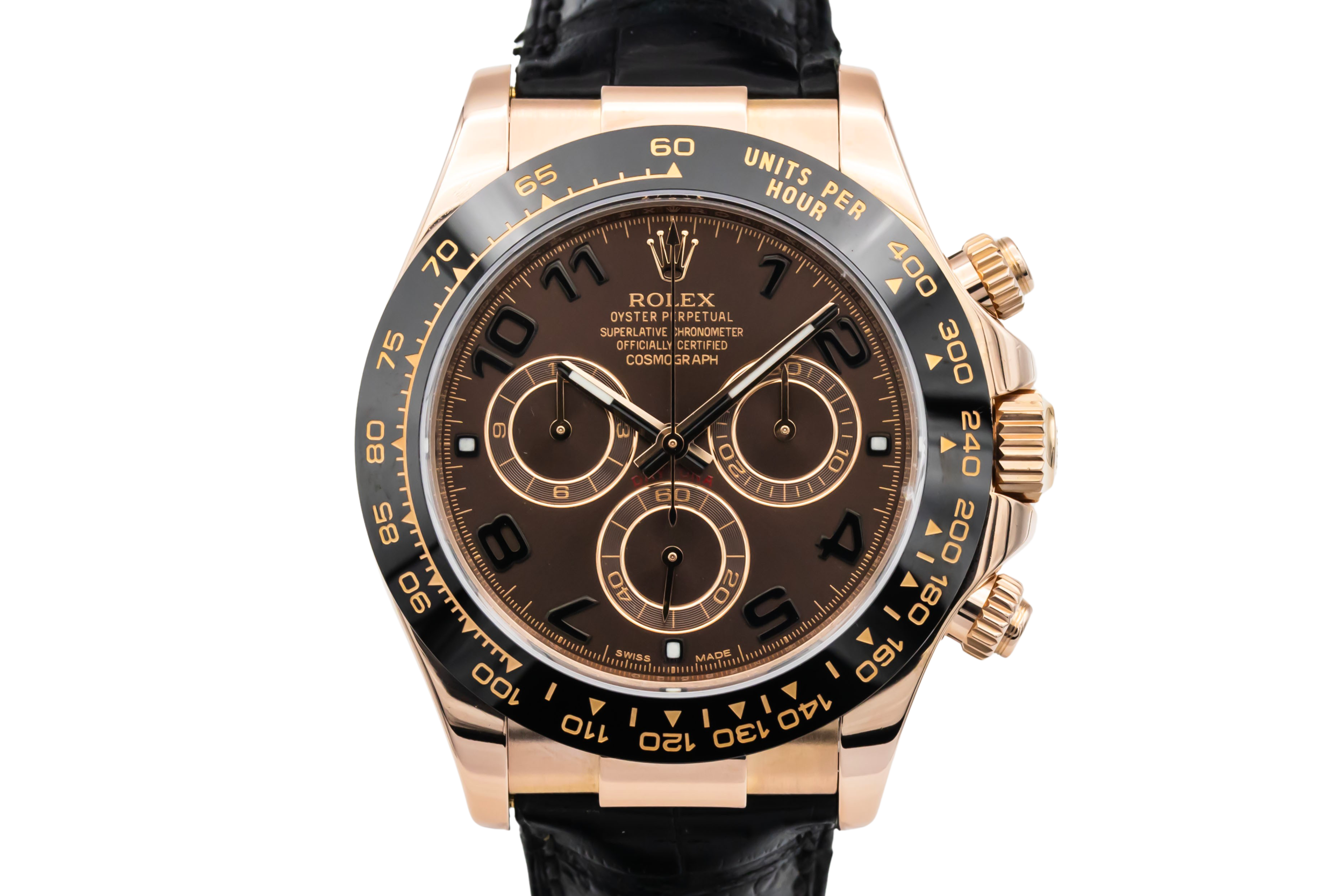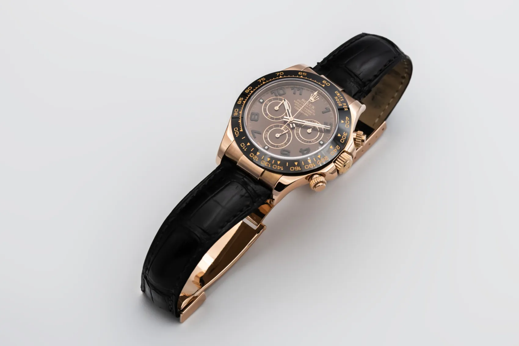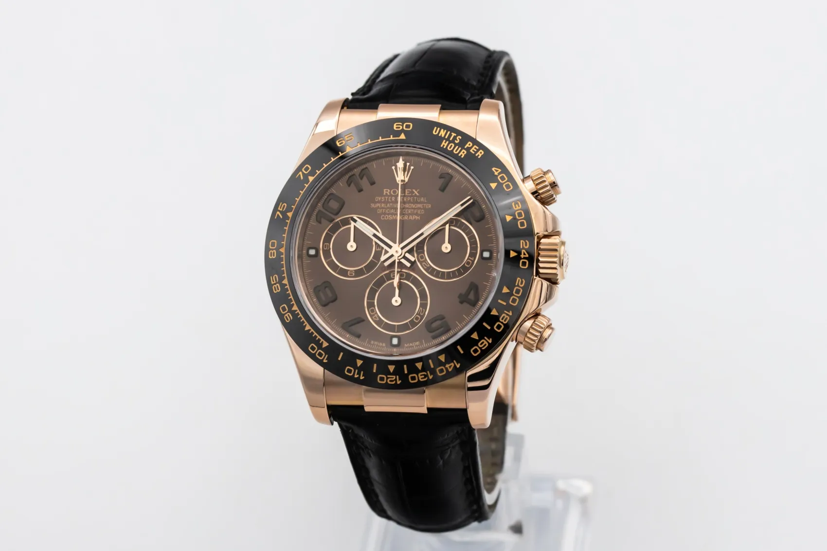 finance this from £419.06 p/m call the shop Read about our Limited Lifetime WarrantyThis 2021 Rolex Cosmograph Daytona 40mm is a striking luxury chronograph crafted in 18ct Everose gold. The chocolate dial features arabic numeral markers with contrasting chronograph sub-dials and the iconic tachymeter bezel for precise timing and motorsport-inspired functionality. Finished on the sporty black Oysterflex bracelet.