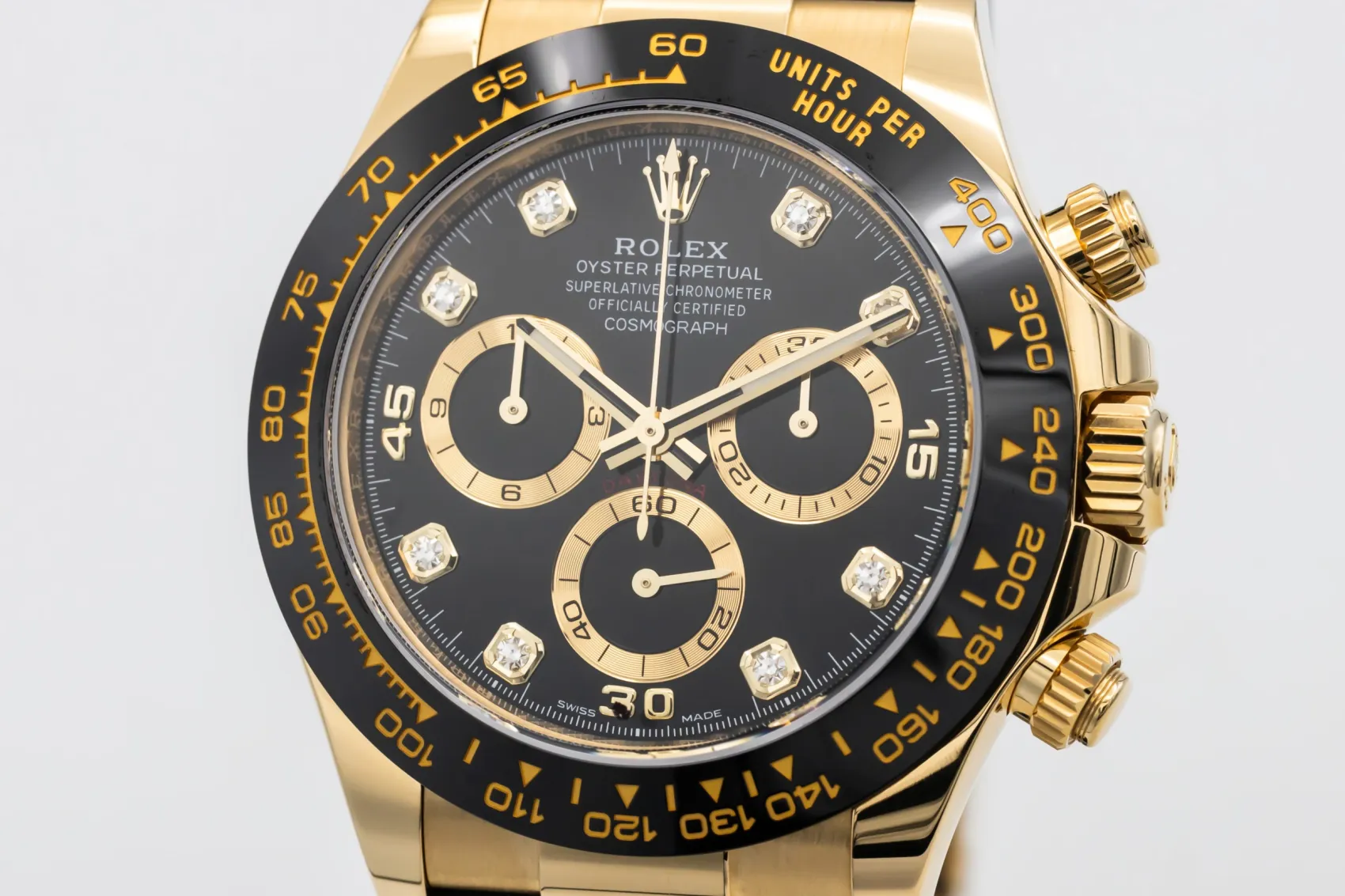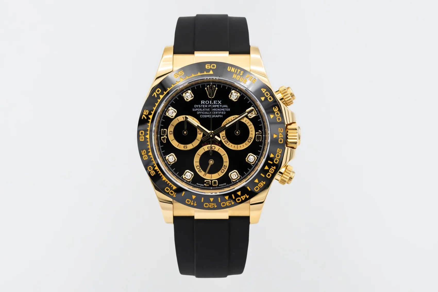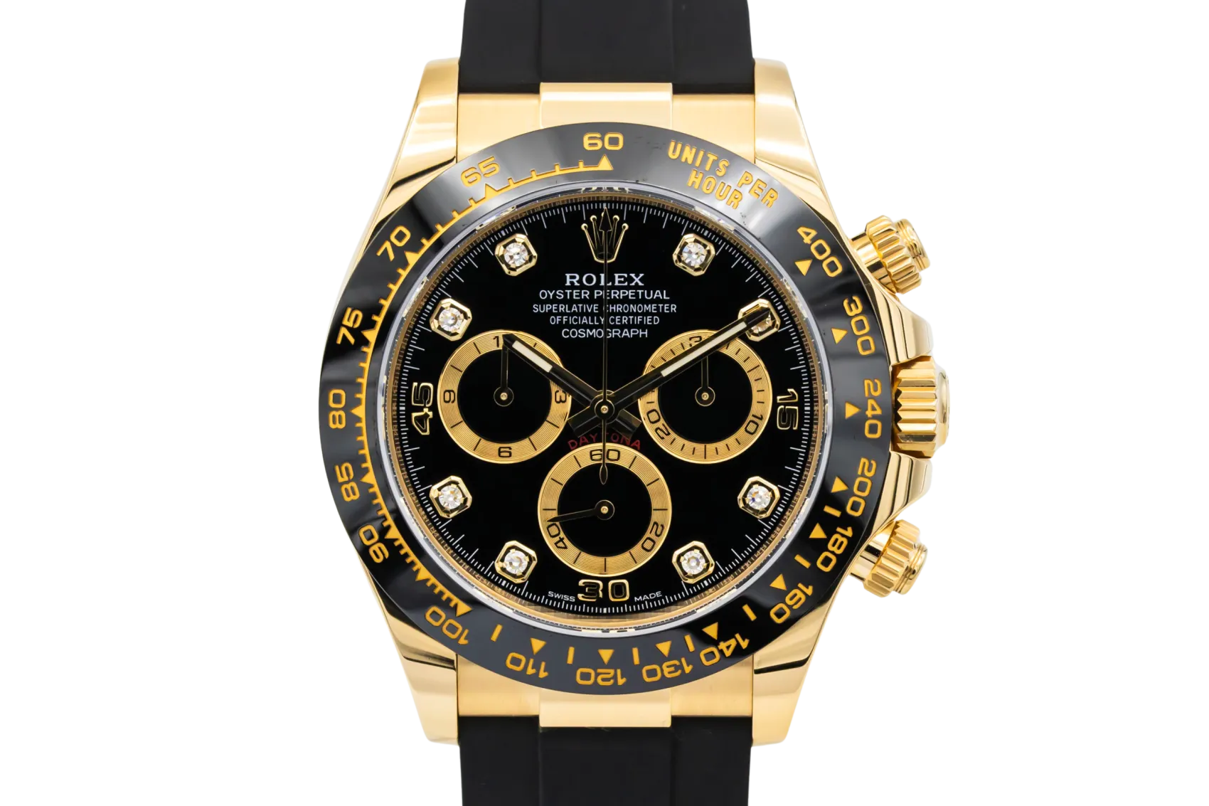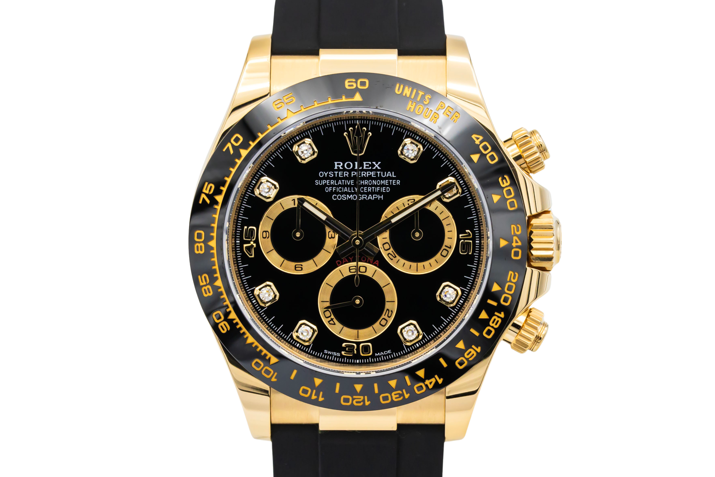 finance this from £442.3 p/m call the shop Read about our Limited Lifetime WarrantyThis 2023 Rolex Cosmograph Daytona 40mm is a striking luxury chronograph crafted in 18ct yellow gold. The black dial features contrasting chronograph sub-dials with diamond hour markers and the iconic tachymeter bezel for measuring speed and precision timing. Finished on the sporty black Oysterflex bracelet.