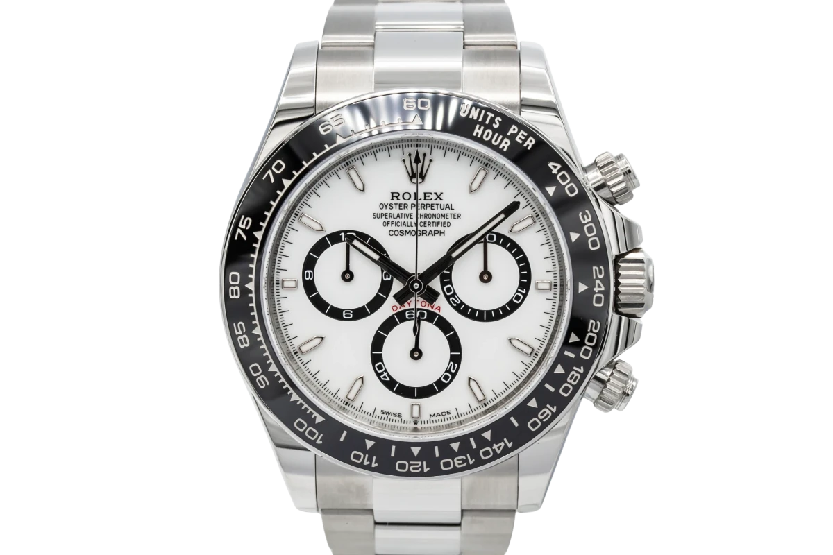 This unworn 2024 Rolex Daytona 40mm features a white dial with baton markers and a stainless steel oyster bracelet. It is also fitted with a black bezel with engraved tachymetric scale.