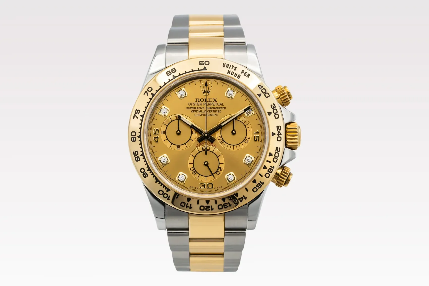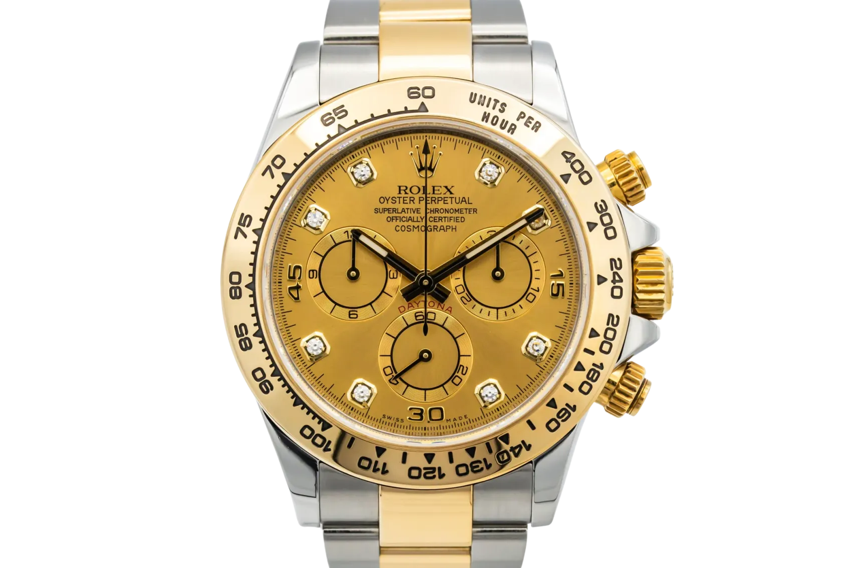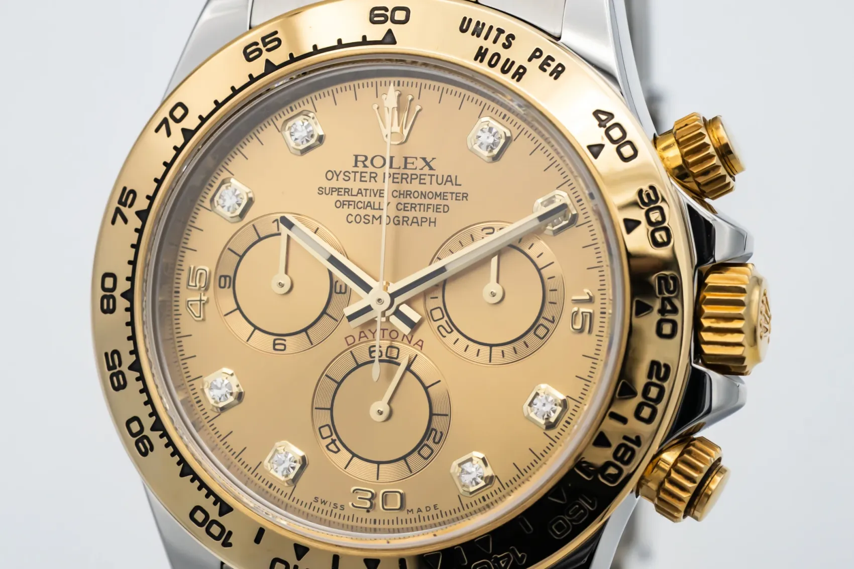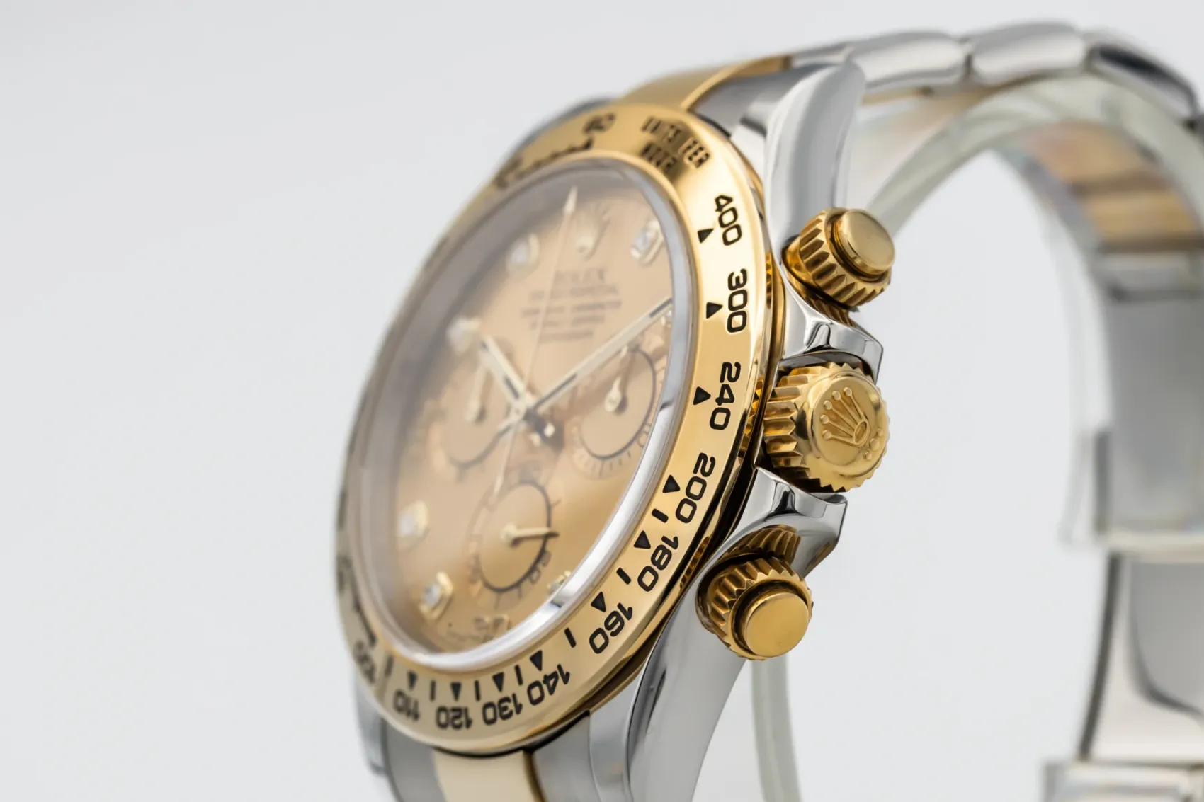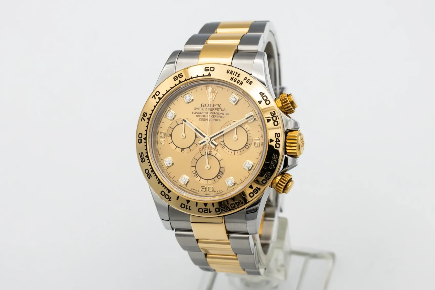 finance this from £331.68 p/m call the shop Read about our Limited Lifetime WarrantyThis 2017 Rolex Cosmograph Daytona 40mm features a champagne dial with diamond markers and a stainless steel & 18ct yellow gold Oyster bracelet. It is also fitted with an 18ct yellow gold bezel with an engraved tachymetric scale.