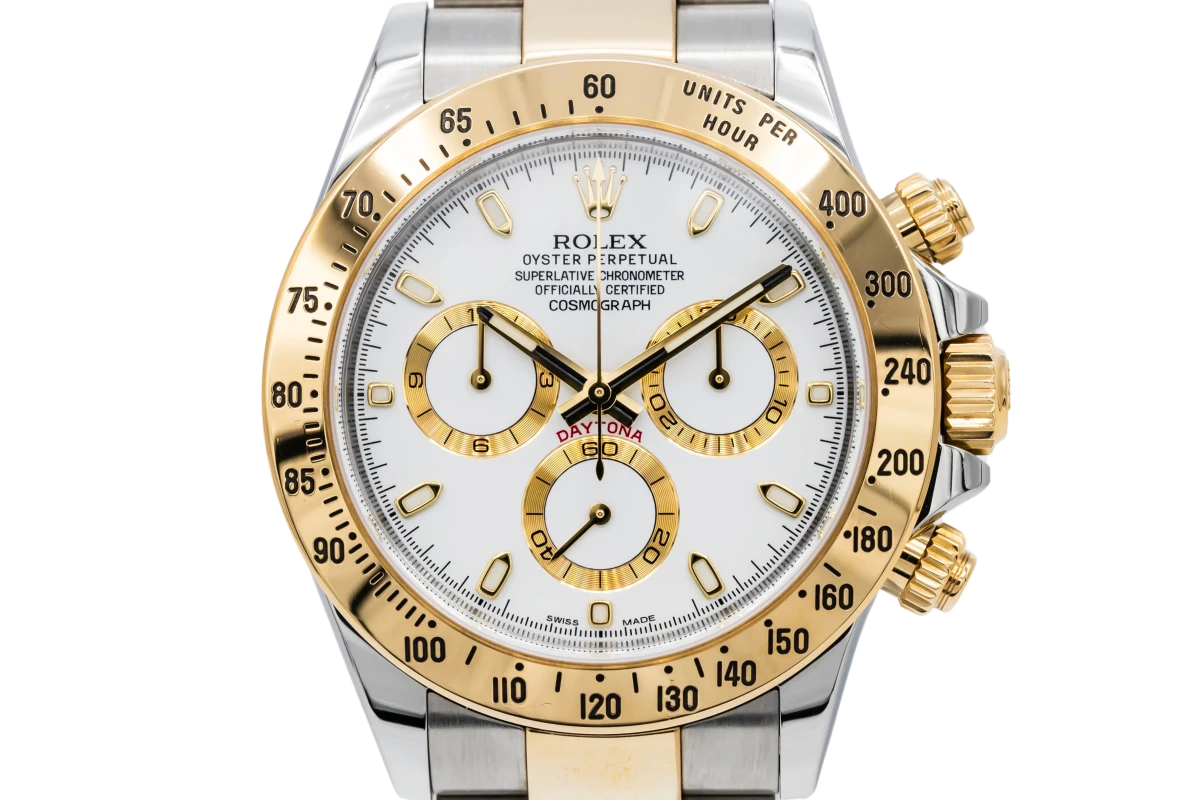 This 2014 Rolex Daytona features a 40mm white APH dial with baton markers and a stainless steel and 18ct yellow gold oyster bracelet. It is also fitted with a 18ct yellow gold bezel with engraved tachymetric scale.