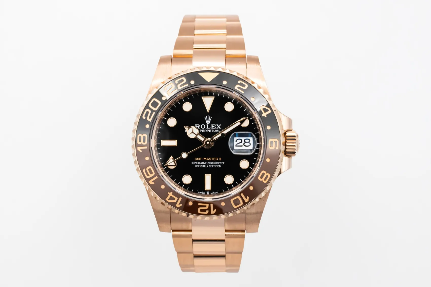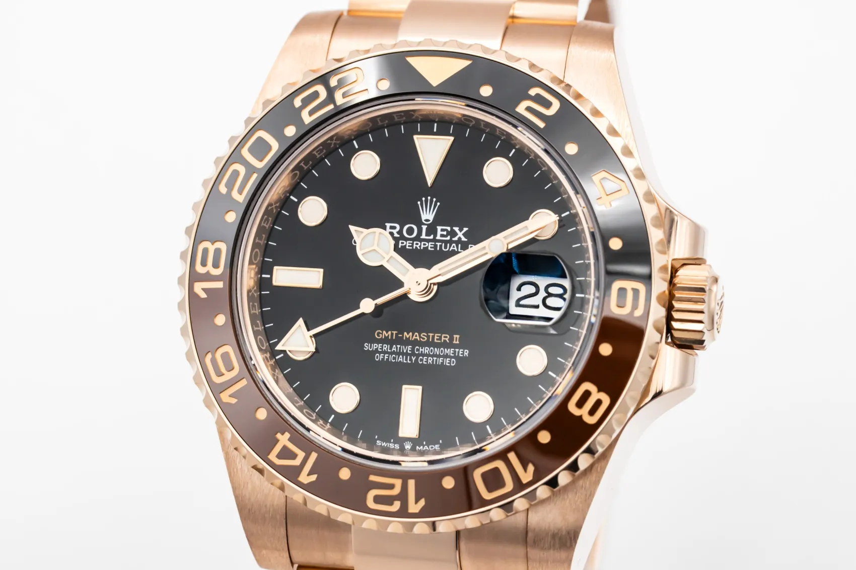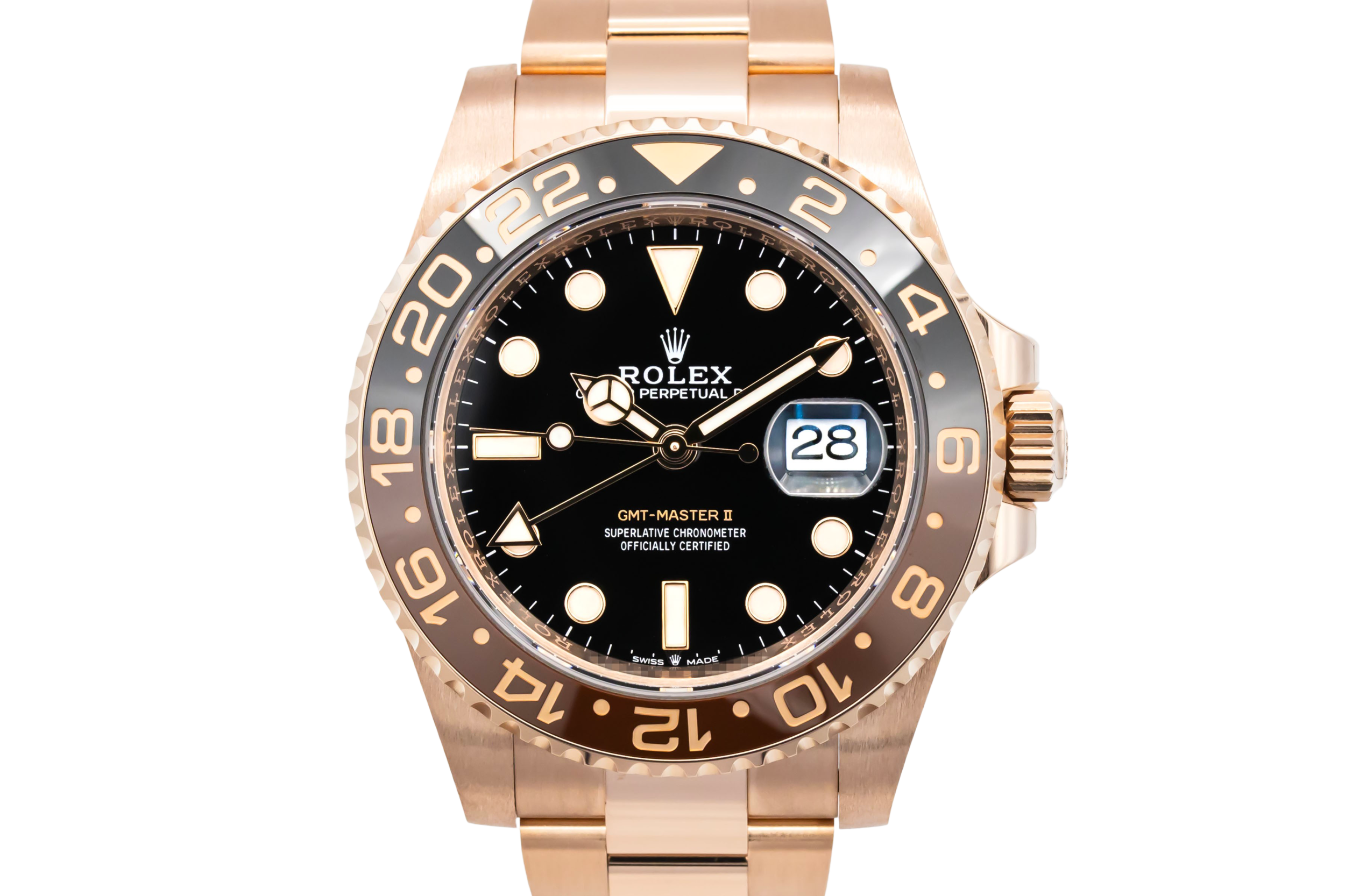finance this from £422.2 p/m call the shop Read about our Limited Lifetime WarrantyThis 2022 Rolex GMT-Master II 40mm ‘Rootbeer’ is a luxurious timepiece crafted entirely in 18ct Everose gold, featuring a black dial with luminous hour markers, Mercedes hands and a distinctive black and brown ceramic bezel. Finished on the Oyster bracelet.