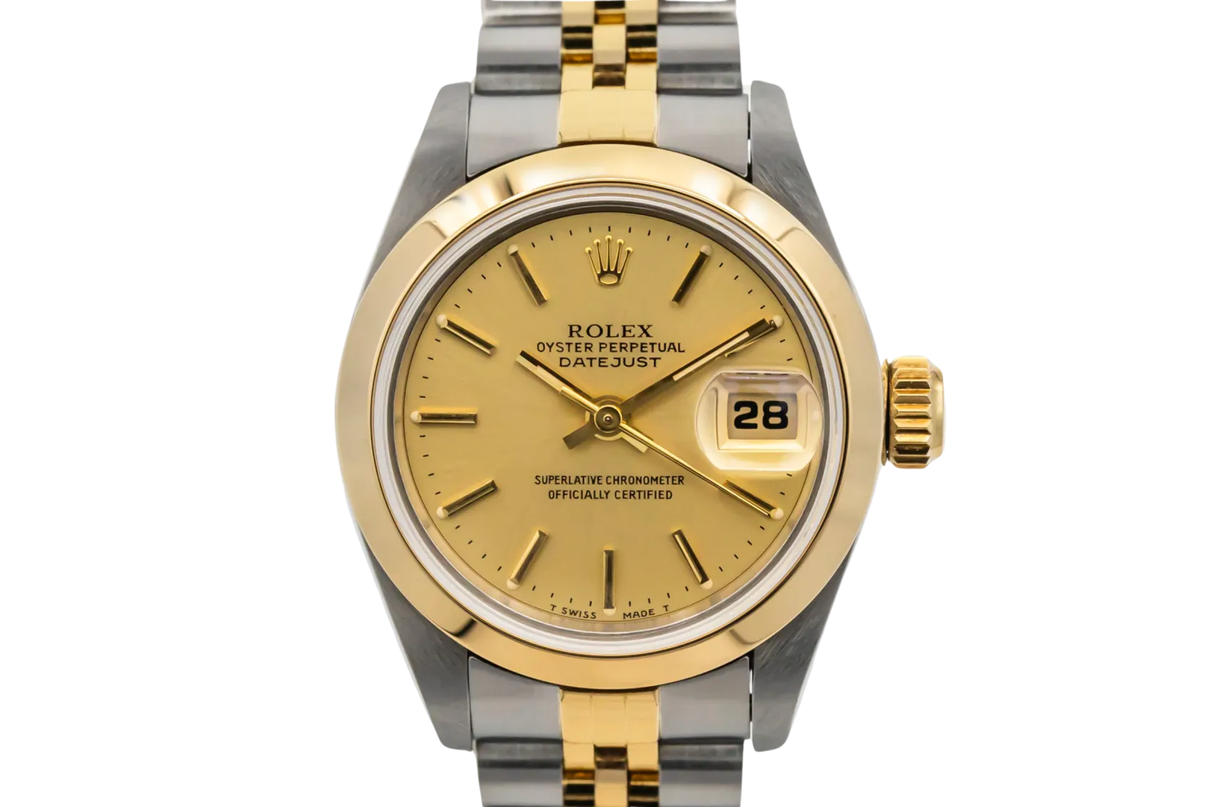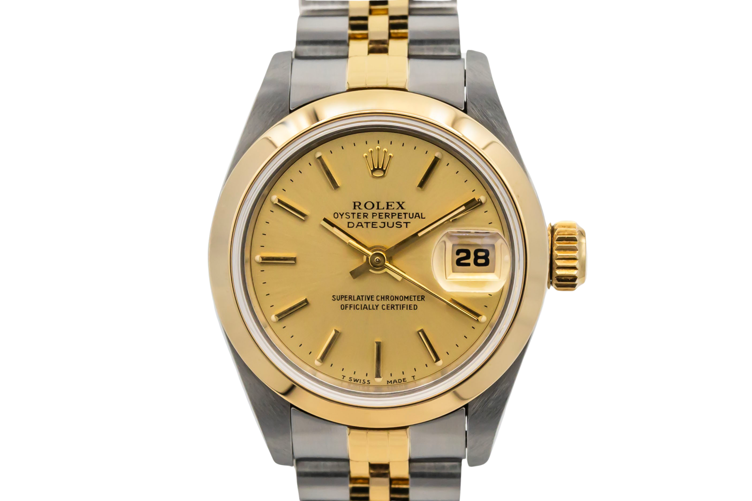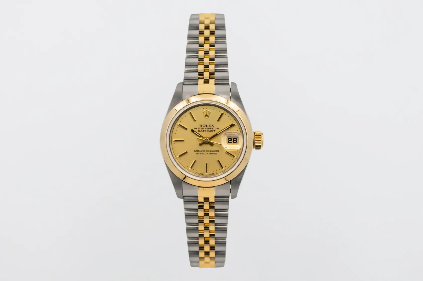 finance this from £65.61 p/m call the shop Read about our Limited Lifetime WarrantyThis 1995 Rolex Lady DateJust 26mm is a classic two-tone timepiece crafted in stainless steel and 18ct yellow gold, featuring a champagne dial with baton hour markers and the signature date display at 3 o’clock. Finished with a fluted yellow gold bezel and Jubilee bracelet.