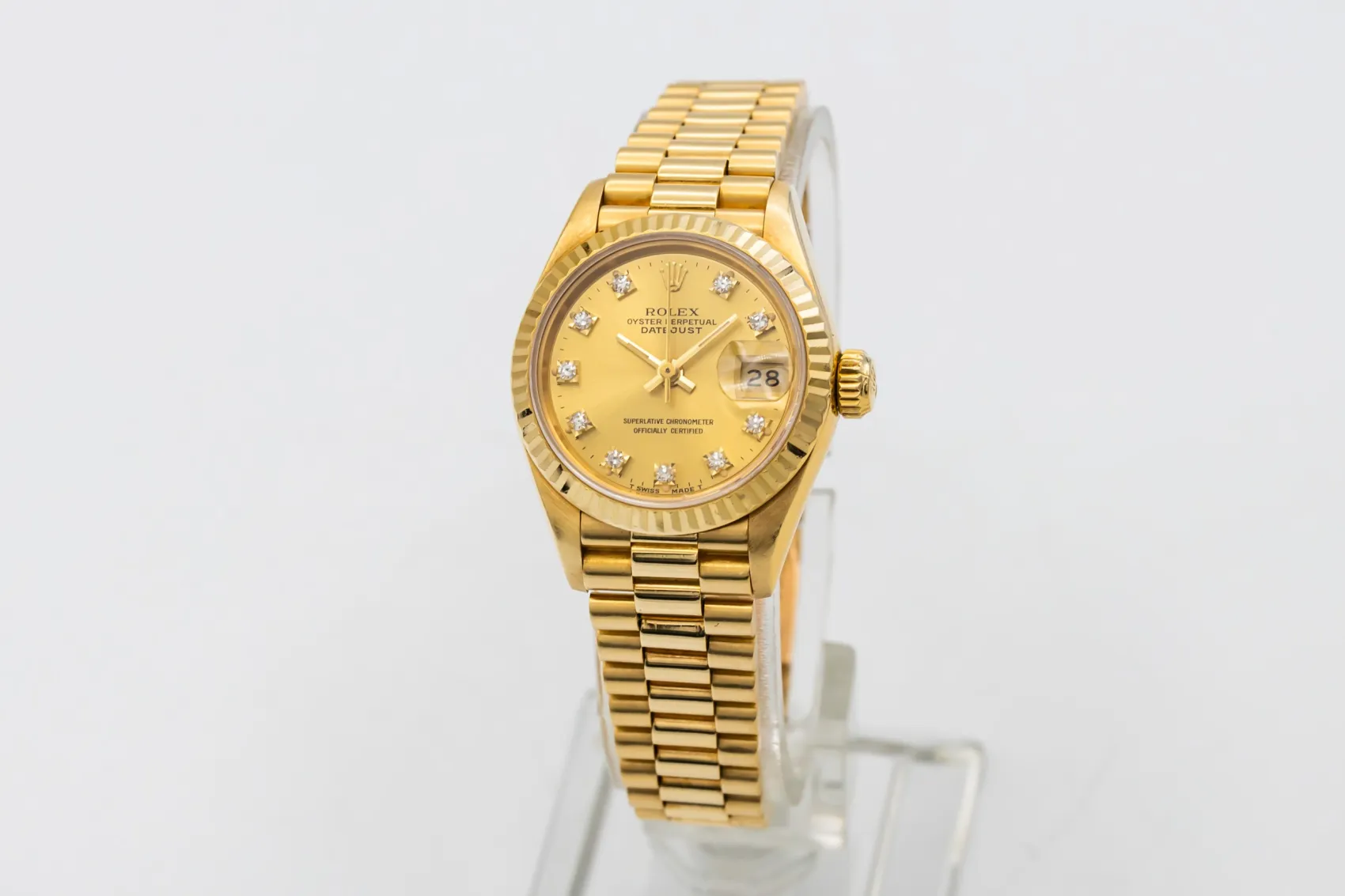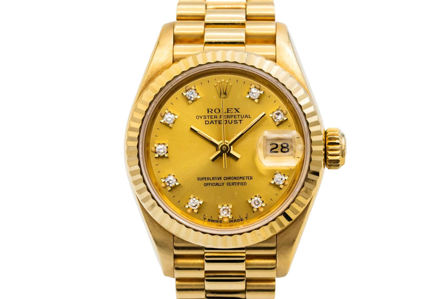 finance this from £135.98 p/m call the shop Read about our Limited Lifetime WarrantyThis 1988 Rolex Lady DateJust 26mm is a luxurious timepiece crafted entirely in 18ct yellow gold, featuring a classic champagne dial with diamond hour markers and the signature date display at 3 o’clock. Finished with a fluted bezel and the iconic Presidential bracelet.
