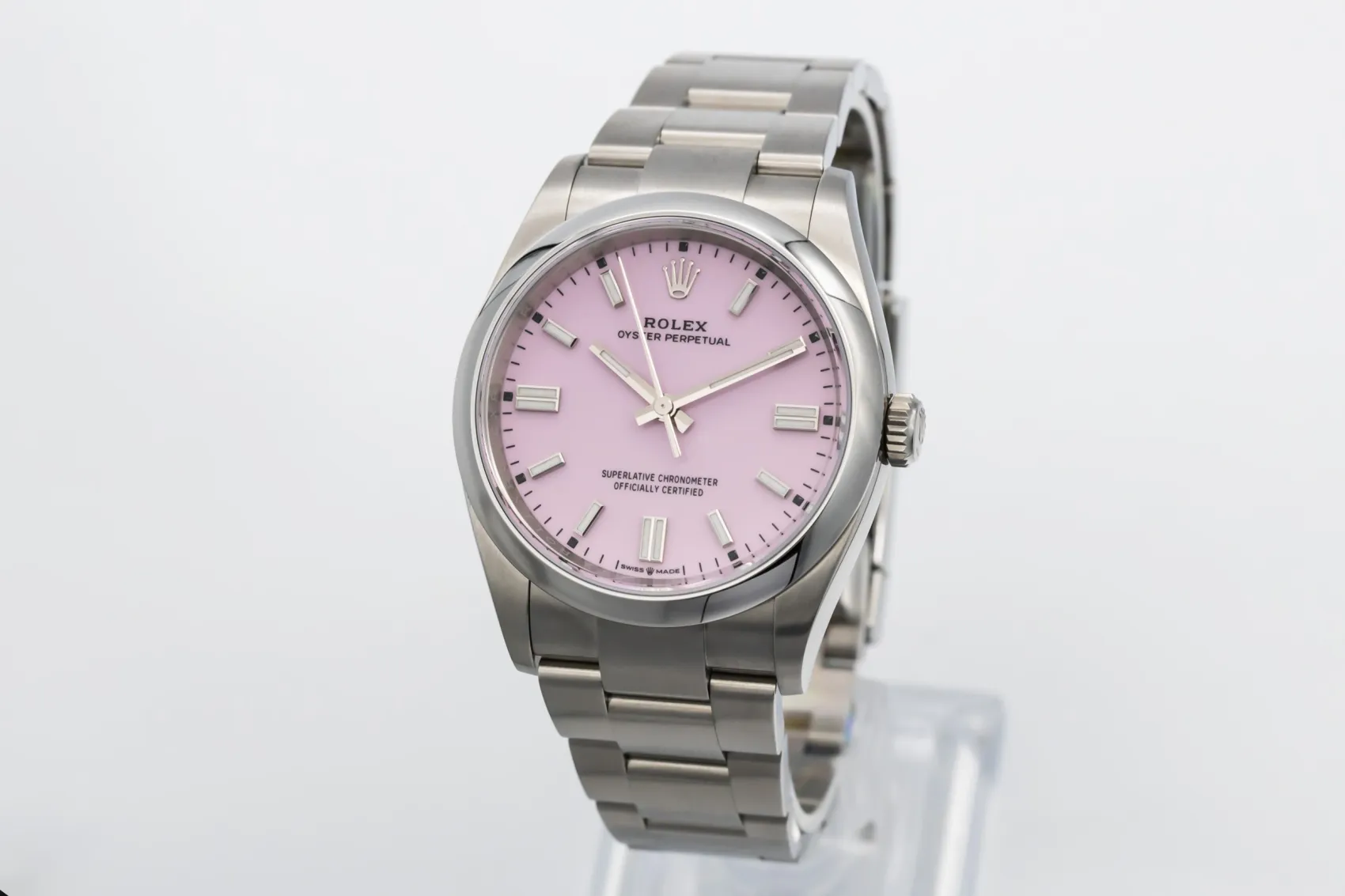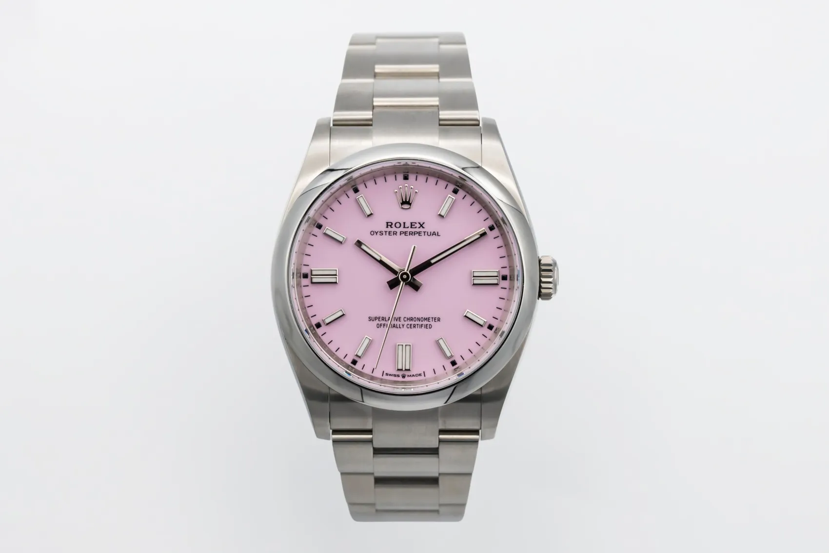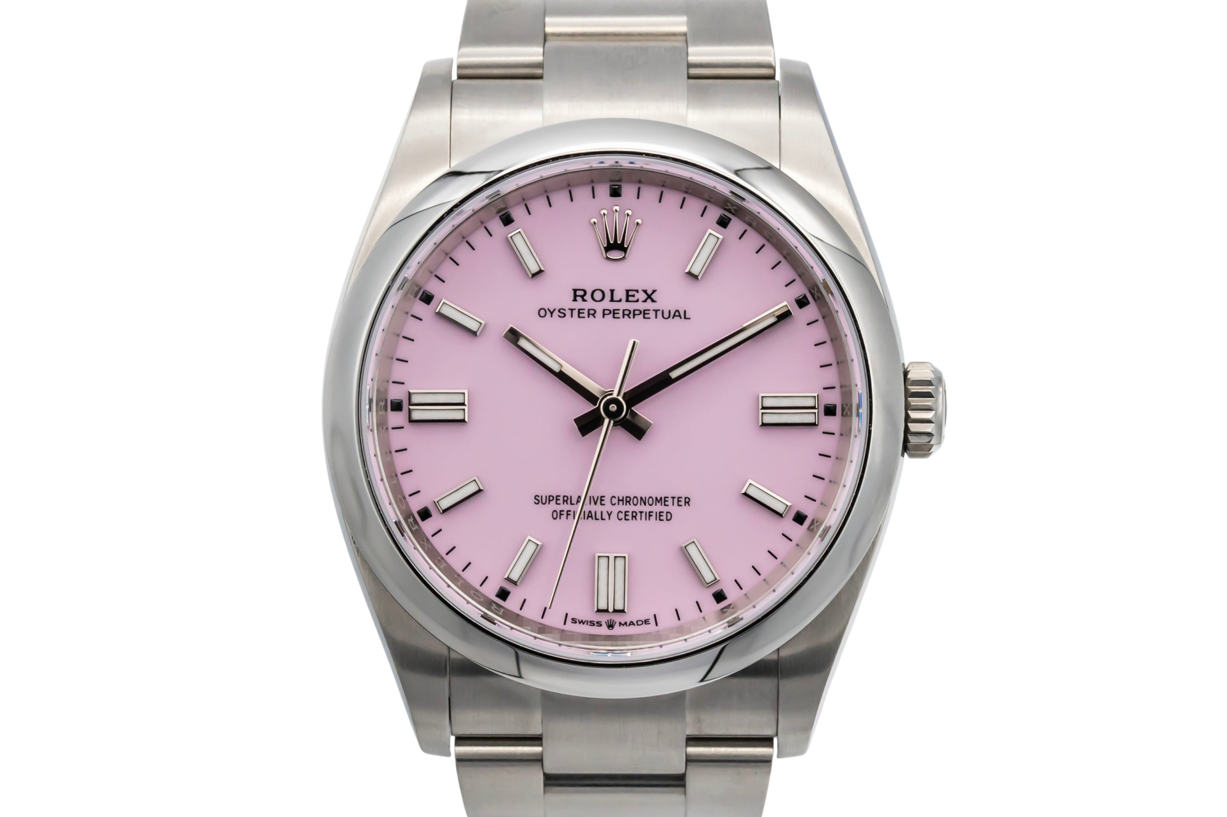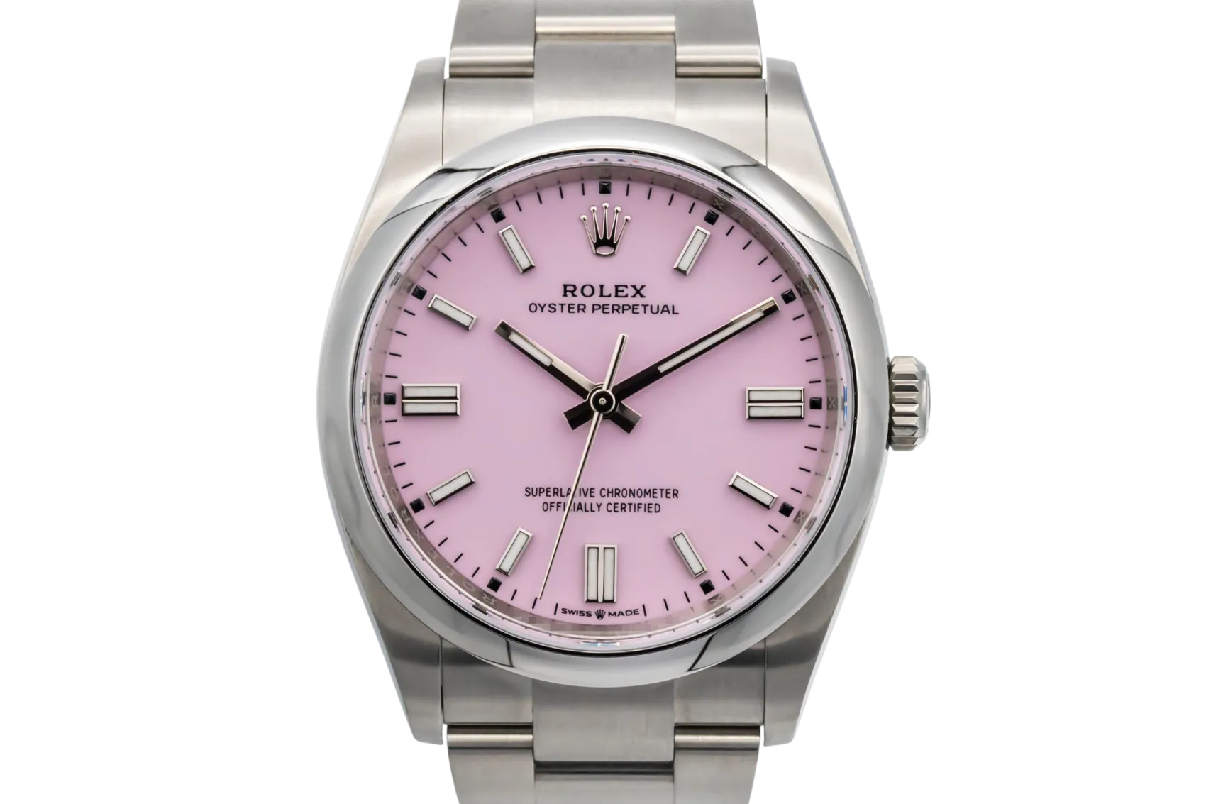 finance this from £132.86 p/m call the shop Read about our Limited Lifetime WarrantyThis 2025 Rolex Oyster Perpetual 36mm is a modern and vibrant timepiece crafted in stainless steel. Featuring a candy pink dial with baton hour markers and a clean, symmetrical layout. Finished with a smooth bezel and Oyster bracelet.