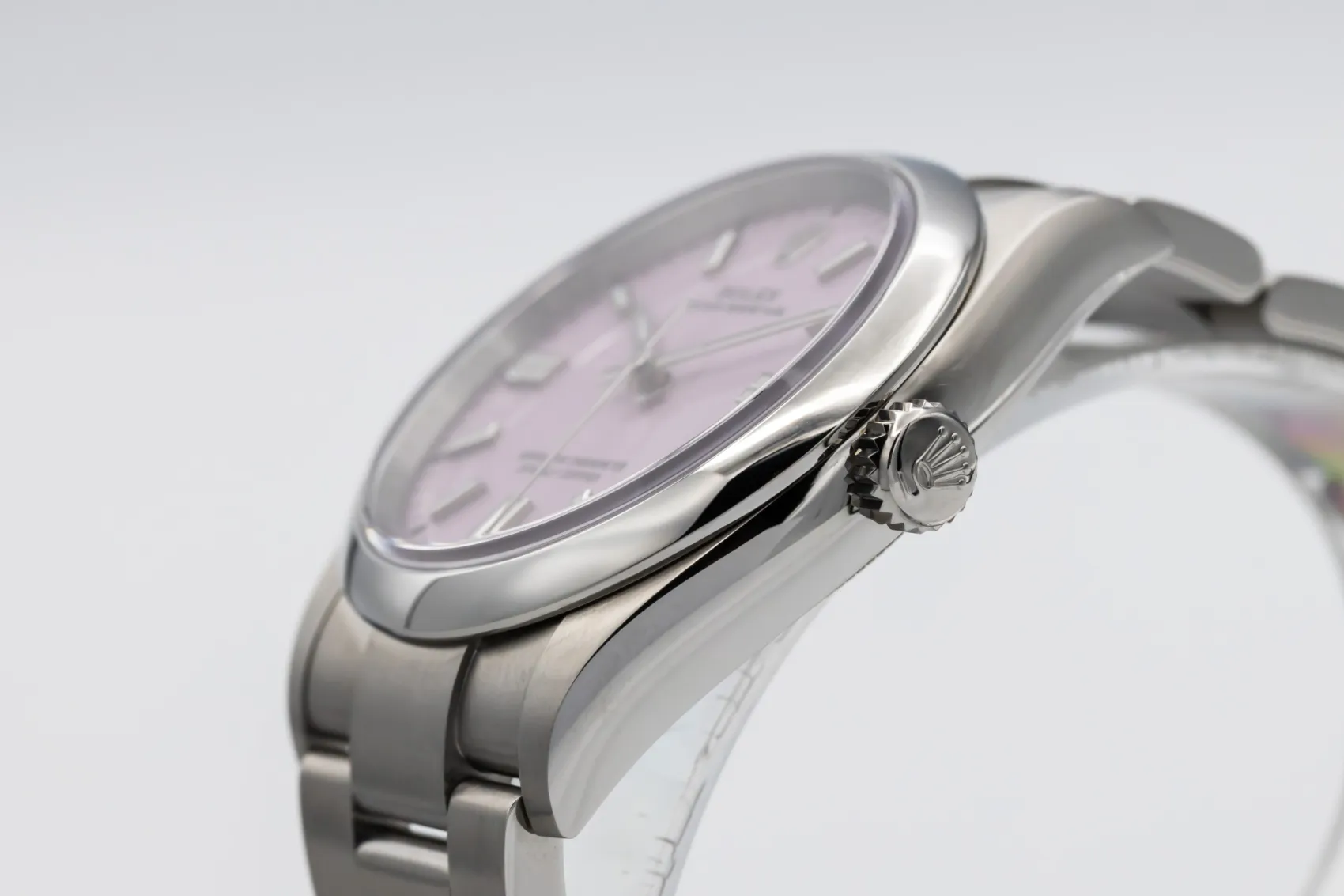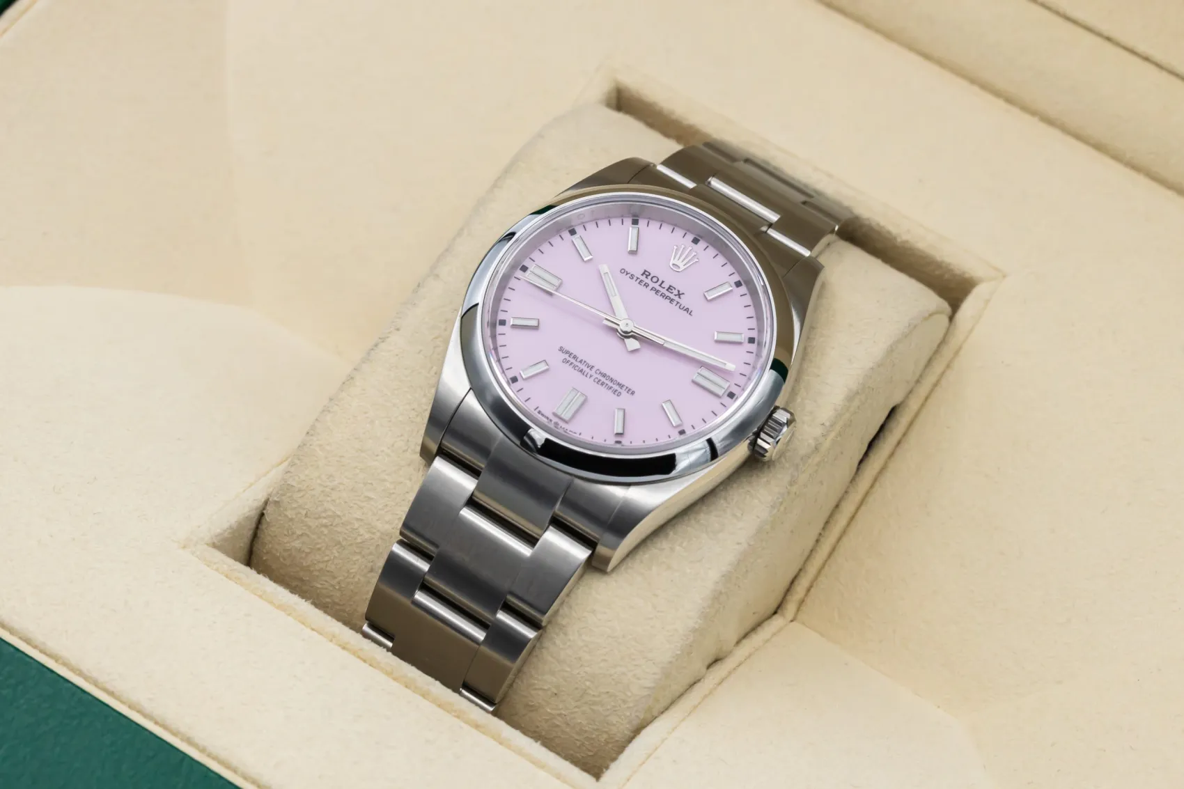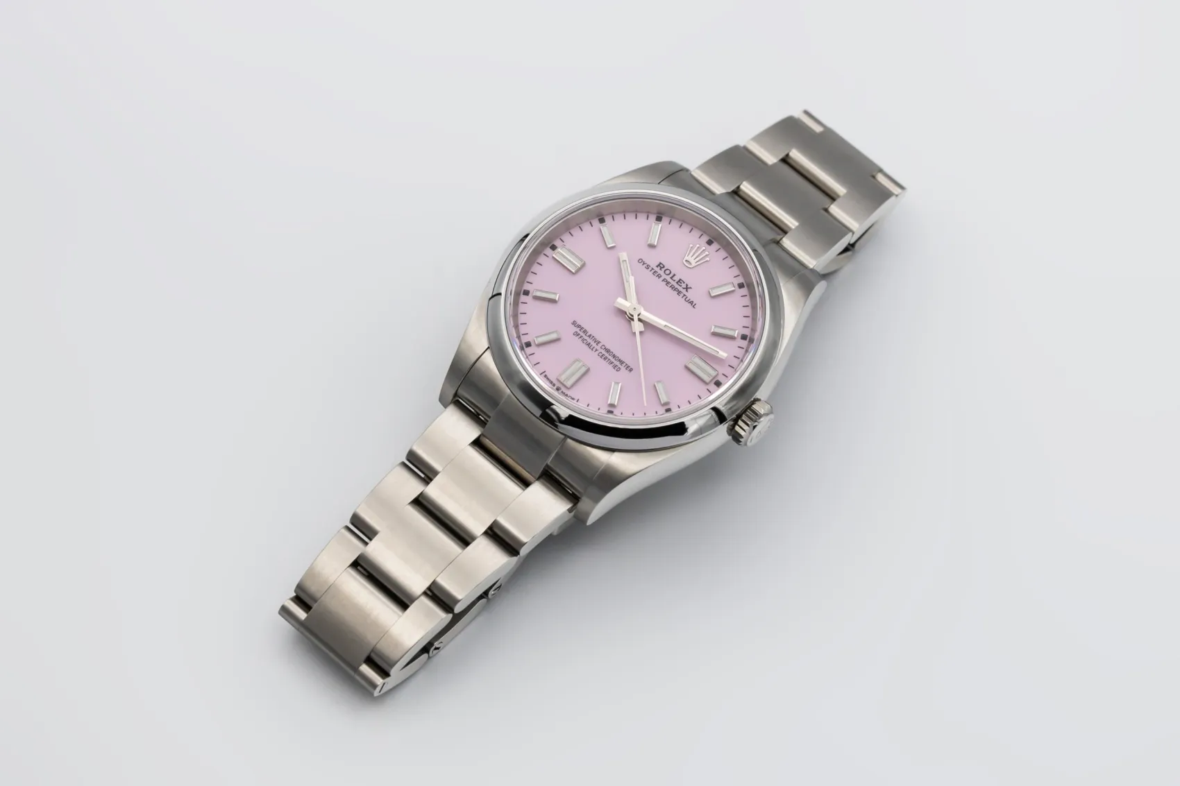 The Oyster Perpetual is one of Rolex’s purest designs, combining the brand’s waterproof Oyster case with reliable automatic movement. Modern dial colours like candy pink have become highly sought-after for their bold and contemporary appeal.