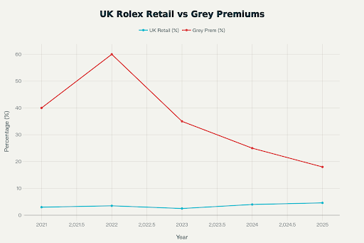 On the grey side, global data from Morgan Stanley and WatchCharts shows in‑production Rolex trading at roughly 15% above retail on average, with about half of references still at a premium, but with a clear downtrend in the share of models over list compared with the peak.
