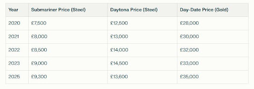 This table illustrates how Rolex's pricing has steadily increased, especially for steel models and precious-metal references, like the Day-Date.