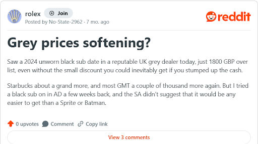 Real UK buyers on Reddit highlight grey prices “softening,” with examples of nearly new Subs at around £1,800 above list, seen as a significant reset from the speculative extremes.