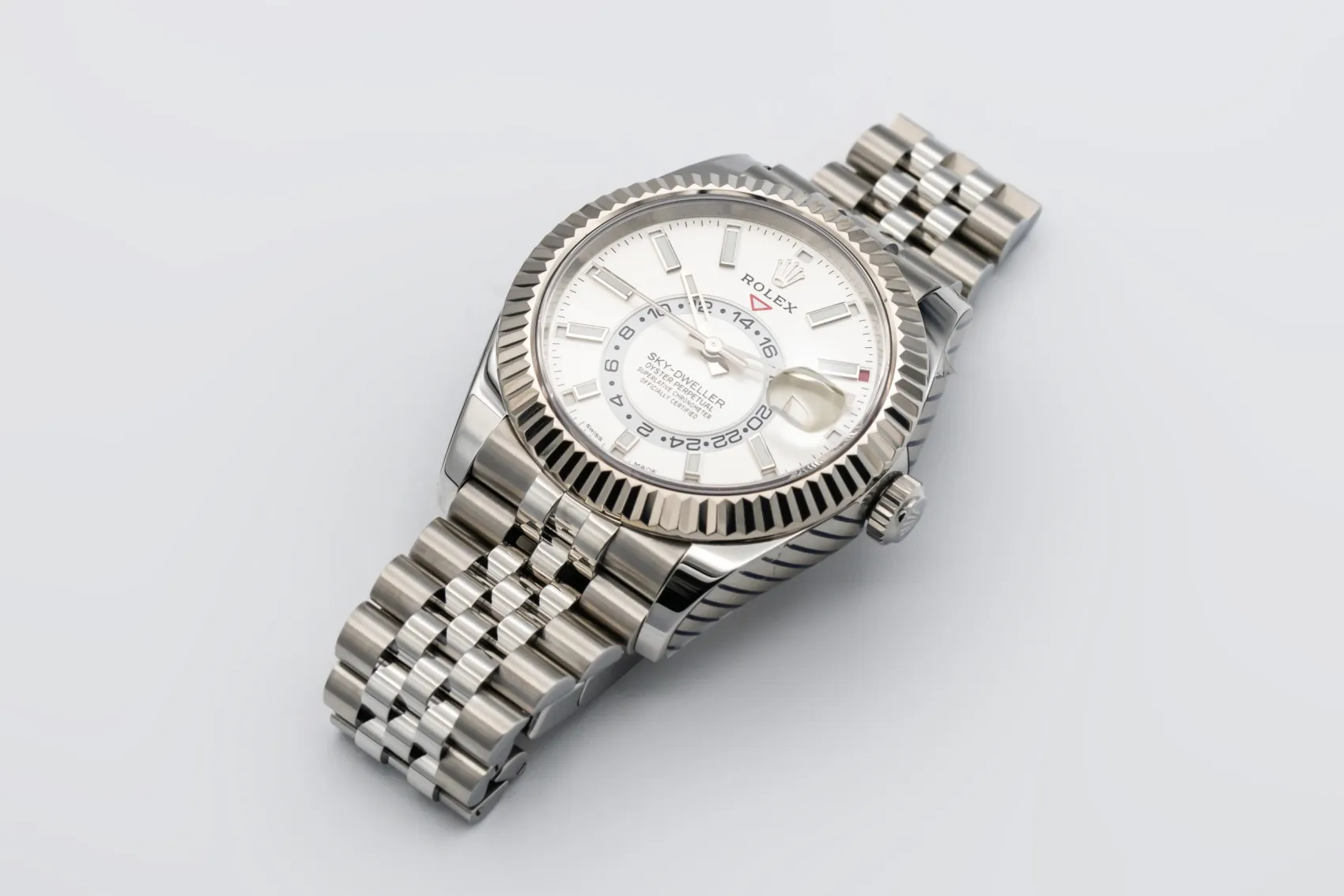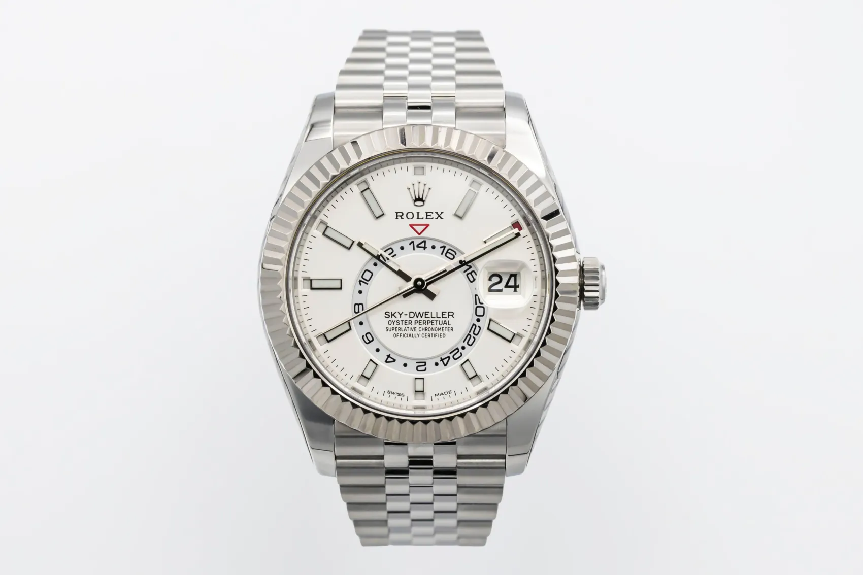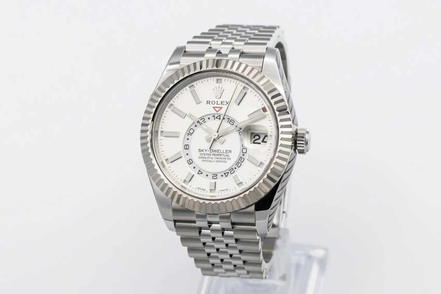 finance this from £234.51 p/m call the shop Read about our Limited Lifetime WarrantyThis 2022 Rolex Sky-Dweller 42mm is a sophisticated timepiece crafted in stainless steel with a white gold fluted bezel, featuring a clean dial with luminous hour markers, off-centre 24-hour display and annual calendar. Finished on the elegant Jubilee bracelet.