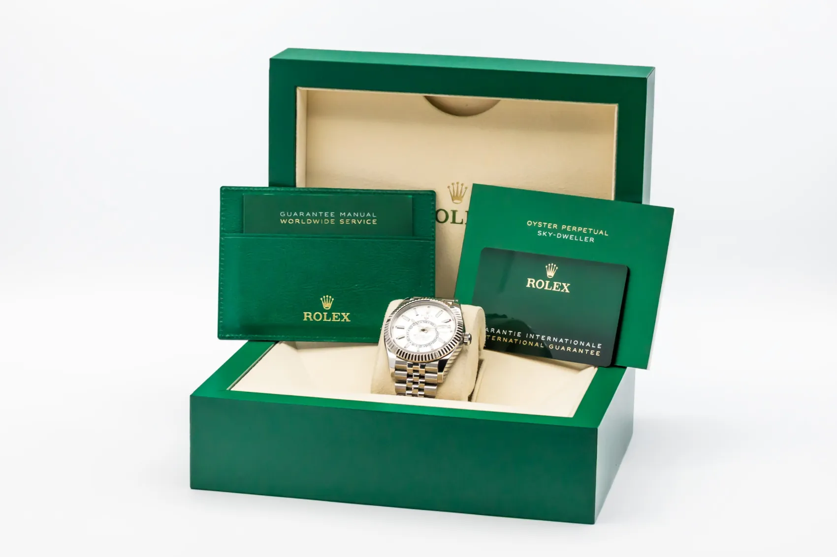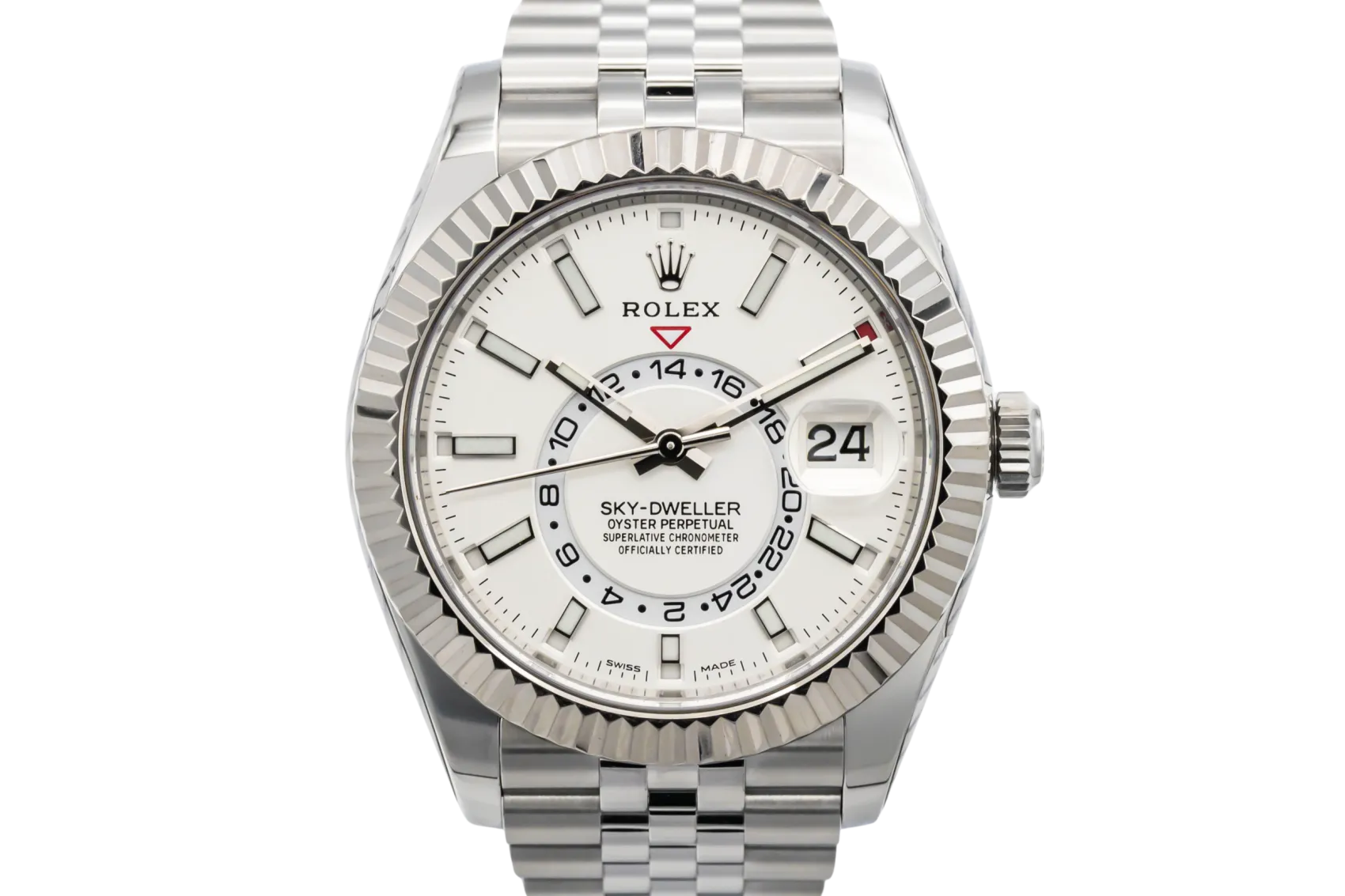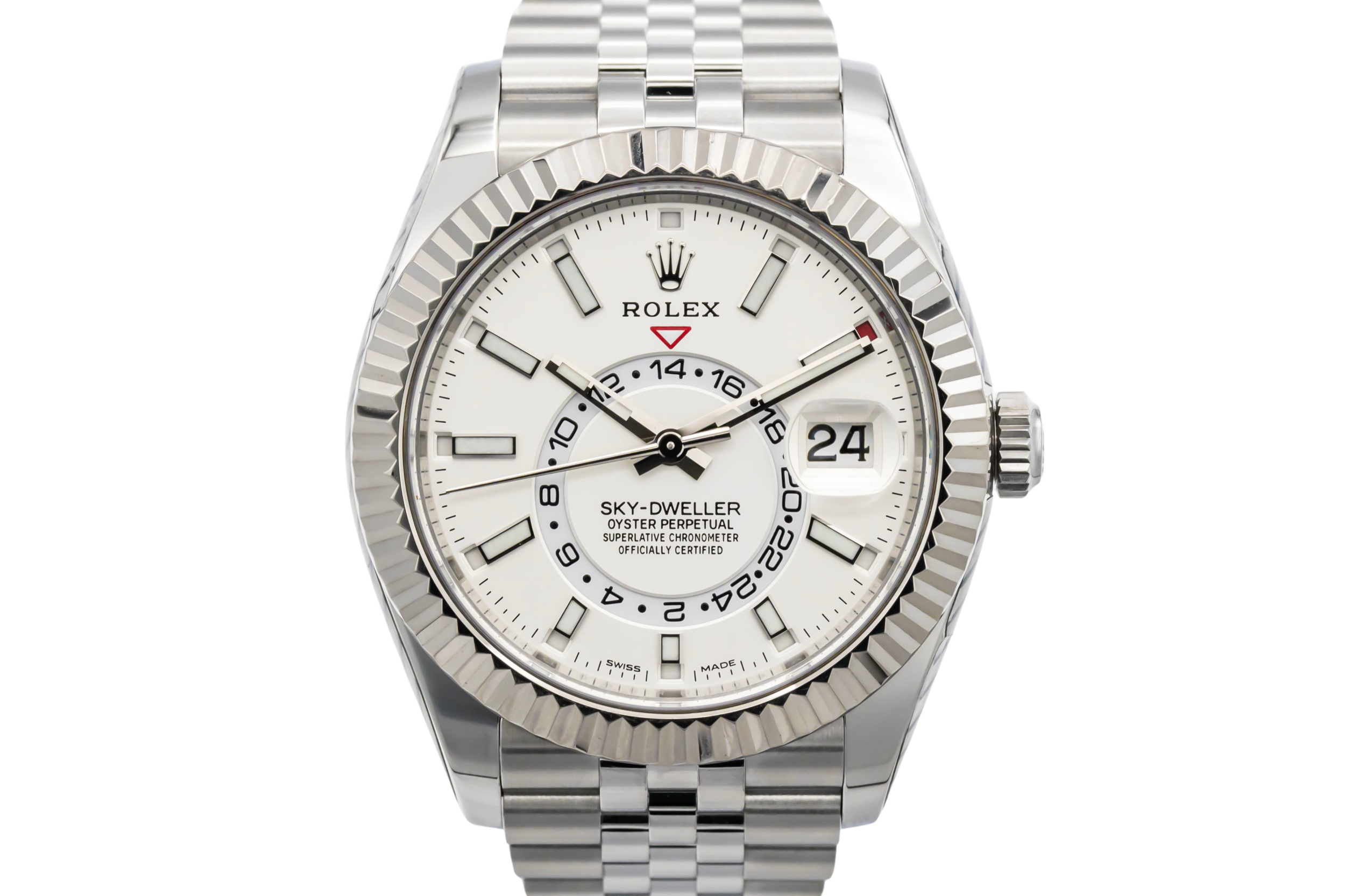 finance this from £234.51 p/m call the shop Read about our Limited Lifetime WarrantyThis 2022 Rolex Sky-Dweller 42mm is a sophisticated timepiece crafted in stainless steel with a white gold fluted bezel, featuring a clean dial with luminous hour markers, off-centre 24-hour display and annual calendar. Finished on the elegant Jubilee bracelet.