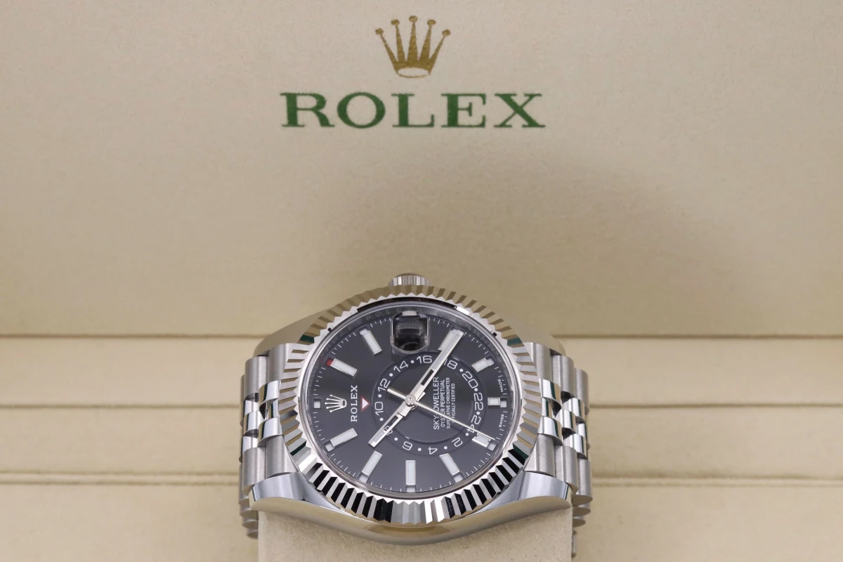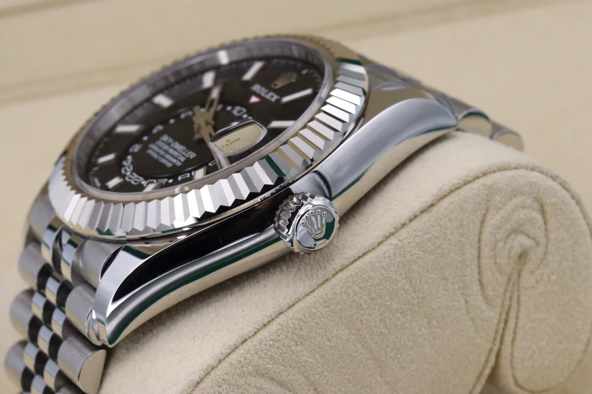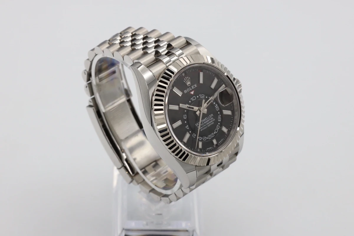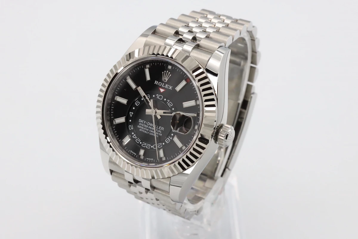 This Unworn 2021 Rolex Sky-Dweller features a 42mm black baton Dial, a Stainless Steel jubilee bracelet and a white gold fluted bezel.