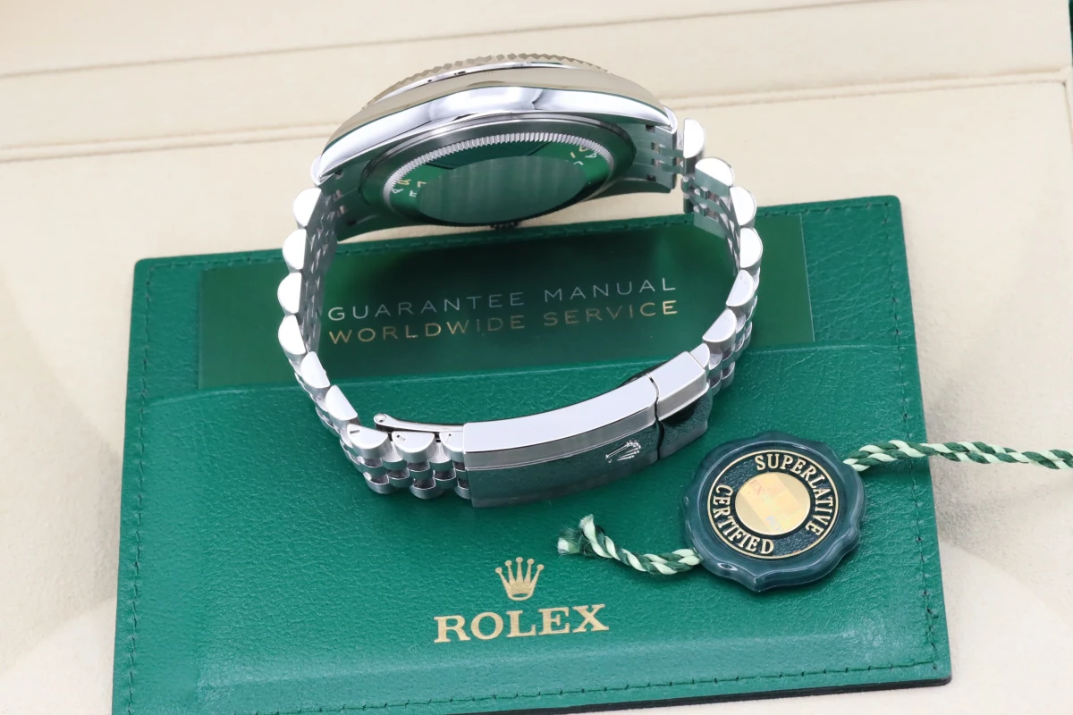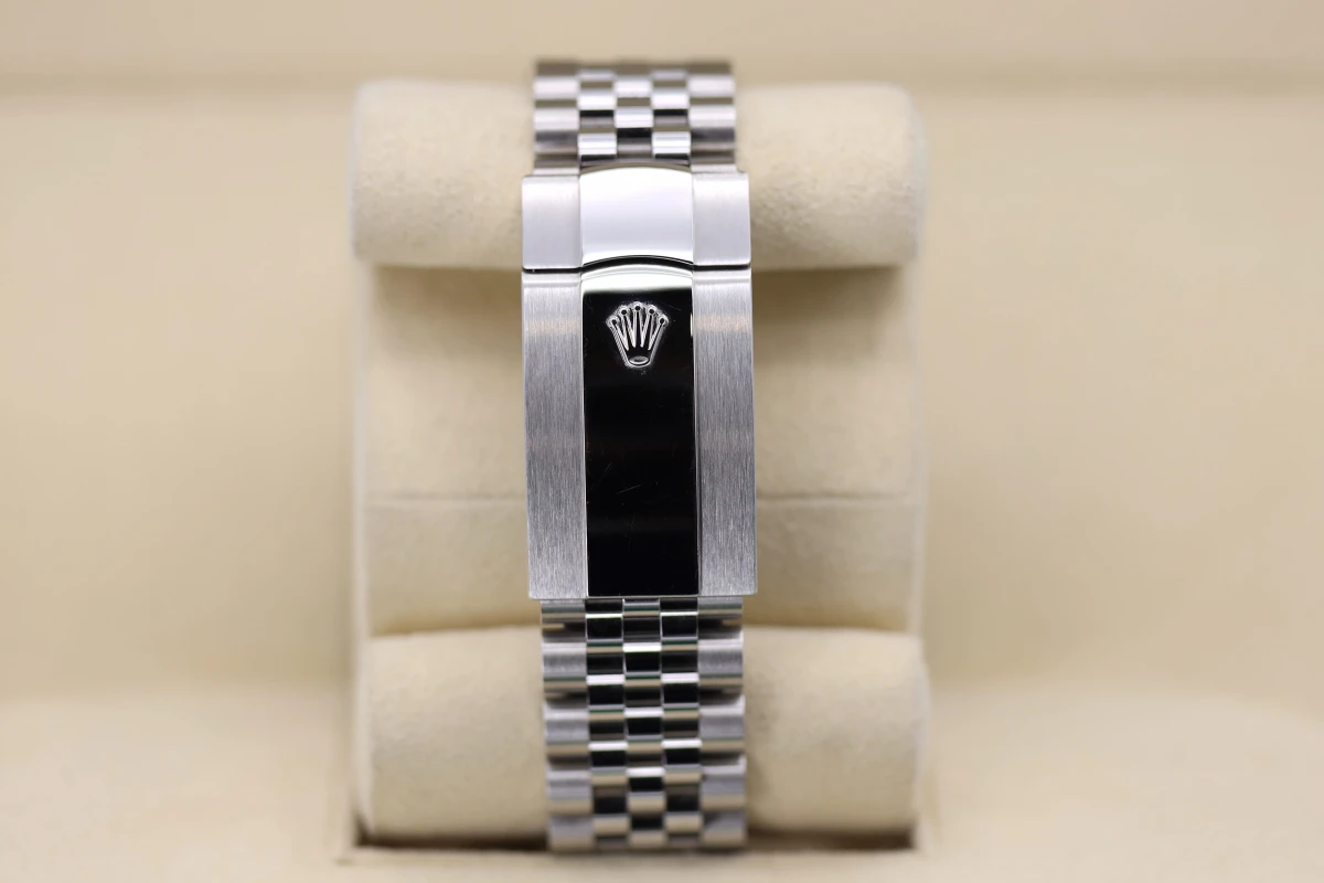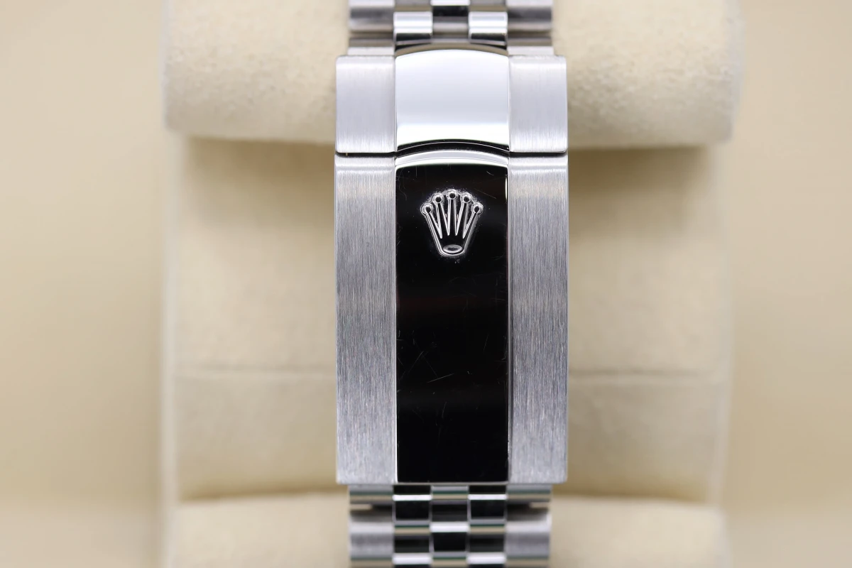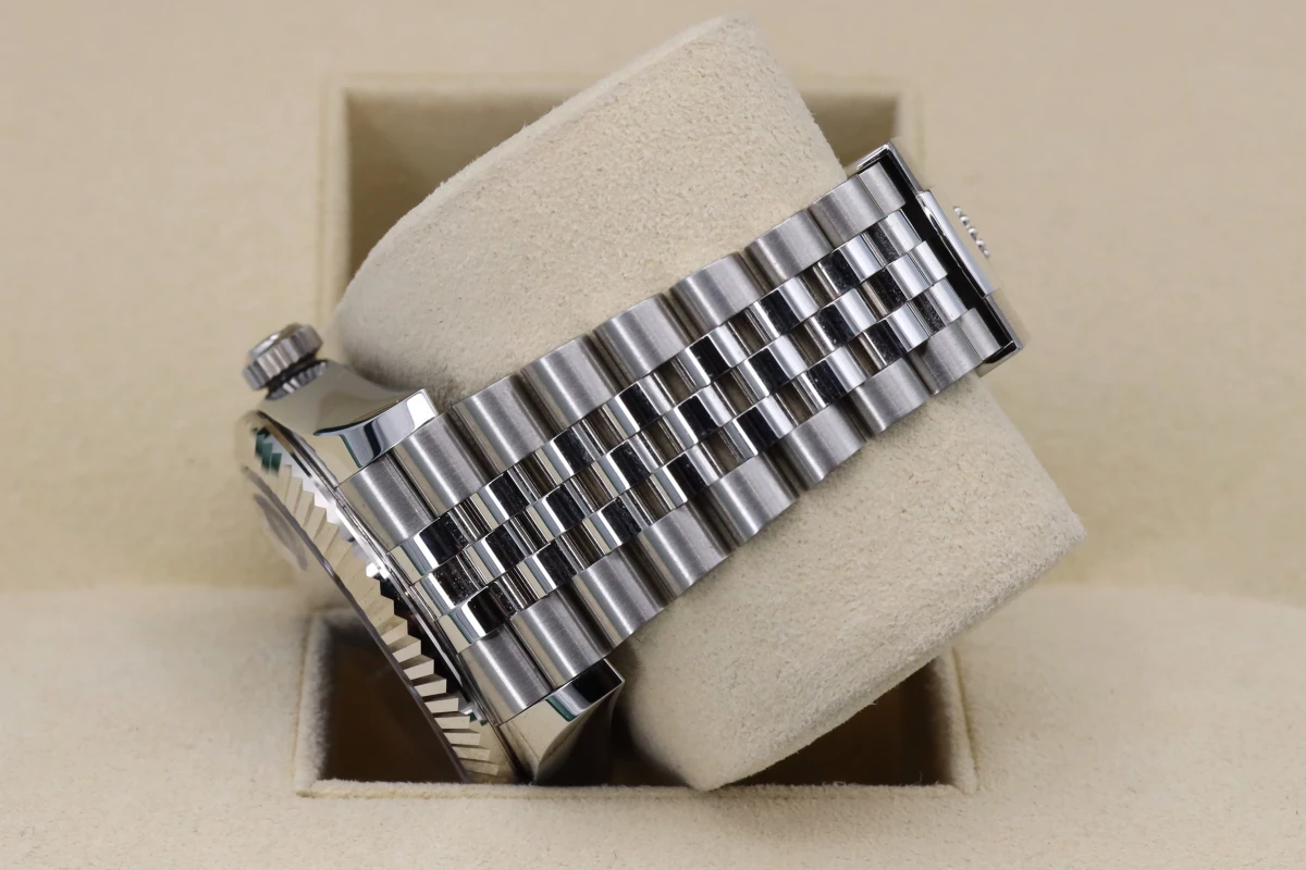 This Unworn 2021 Rolex Sky-Dweller features a 42mm black baton Dial, a Stainless Steel jubilee bracelet and a white gold fluted bezel.
