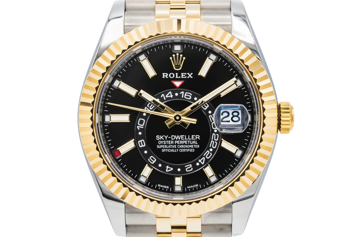 This 2023 Rolex Sky-Dweller 42mm features a black dial with baton markers and a stainless steel and 18ct yellow gold jubilee bracelet. It also features a 18ct yellow gold fluted bezel.