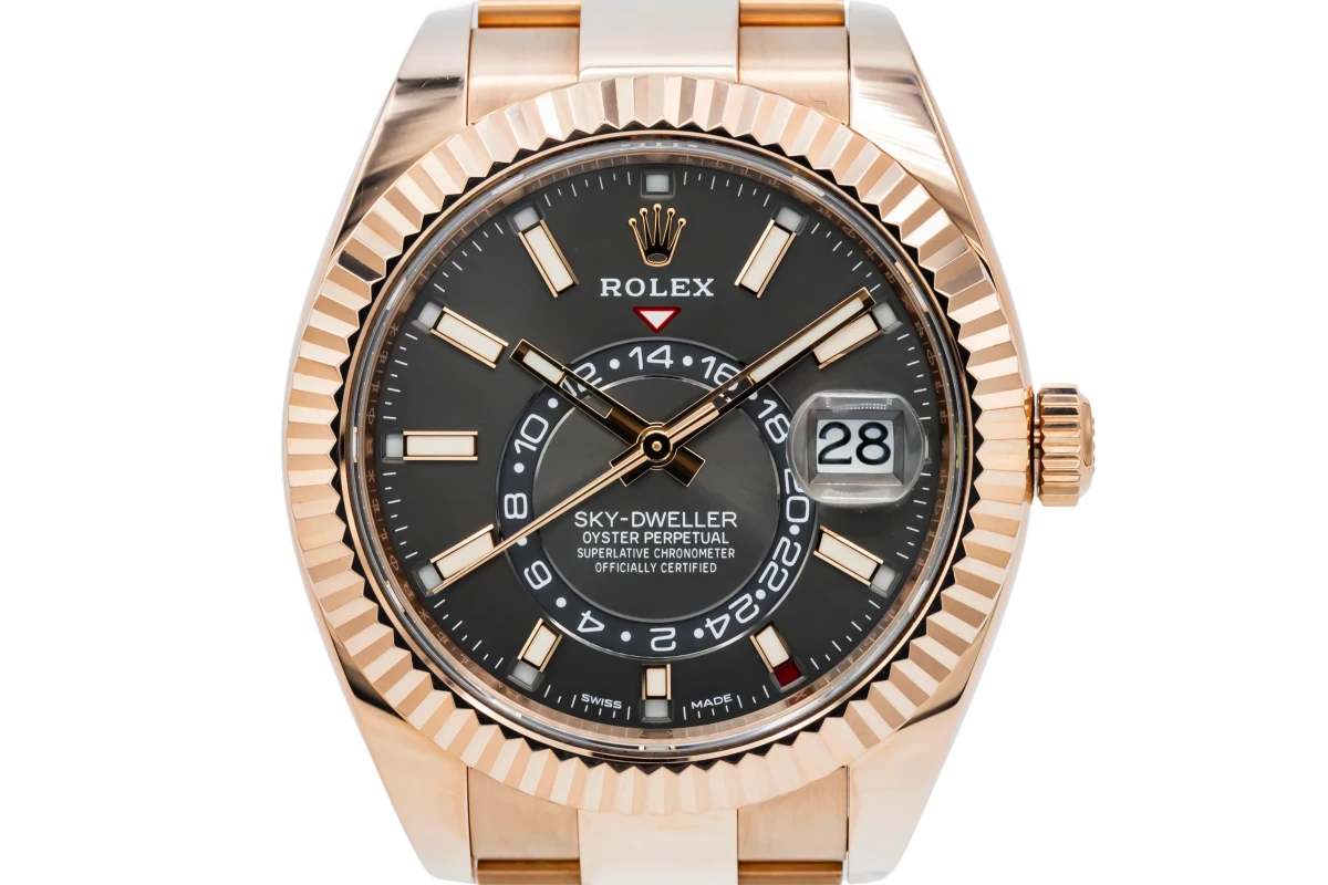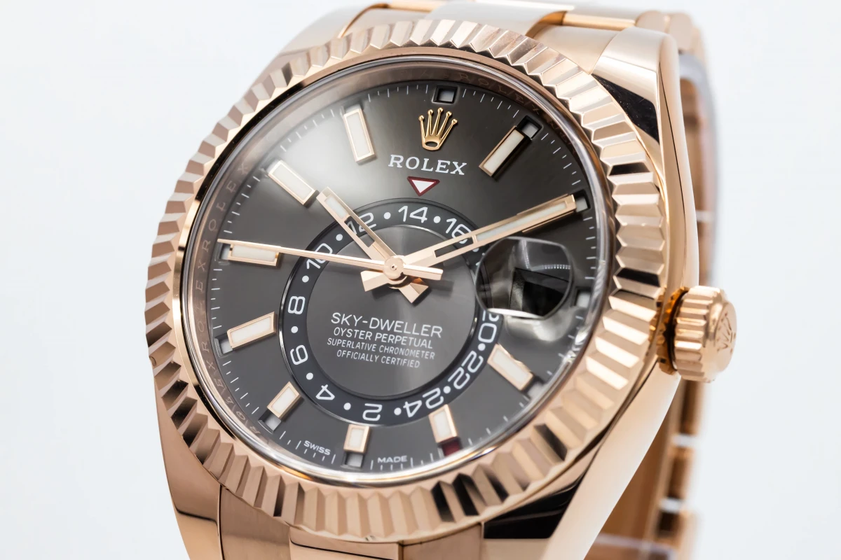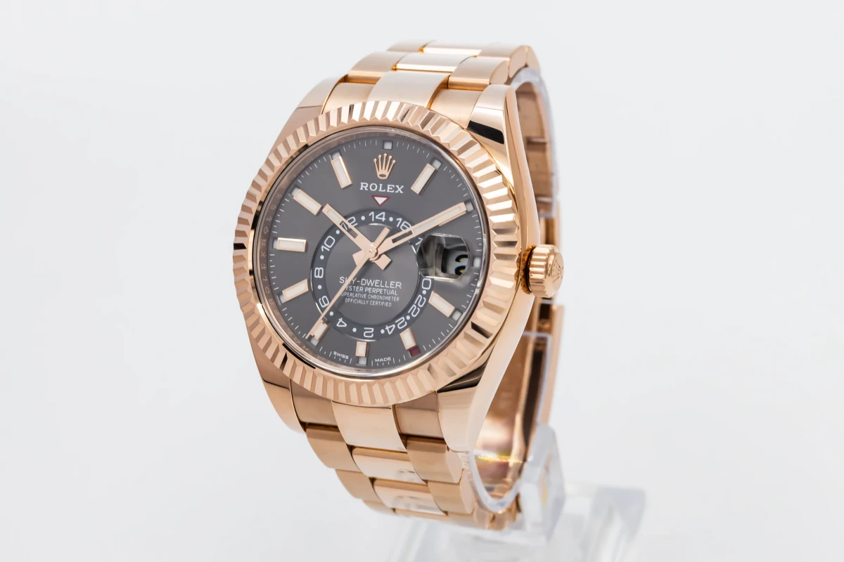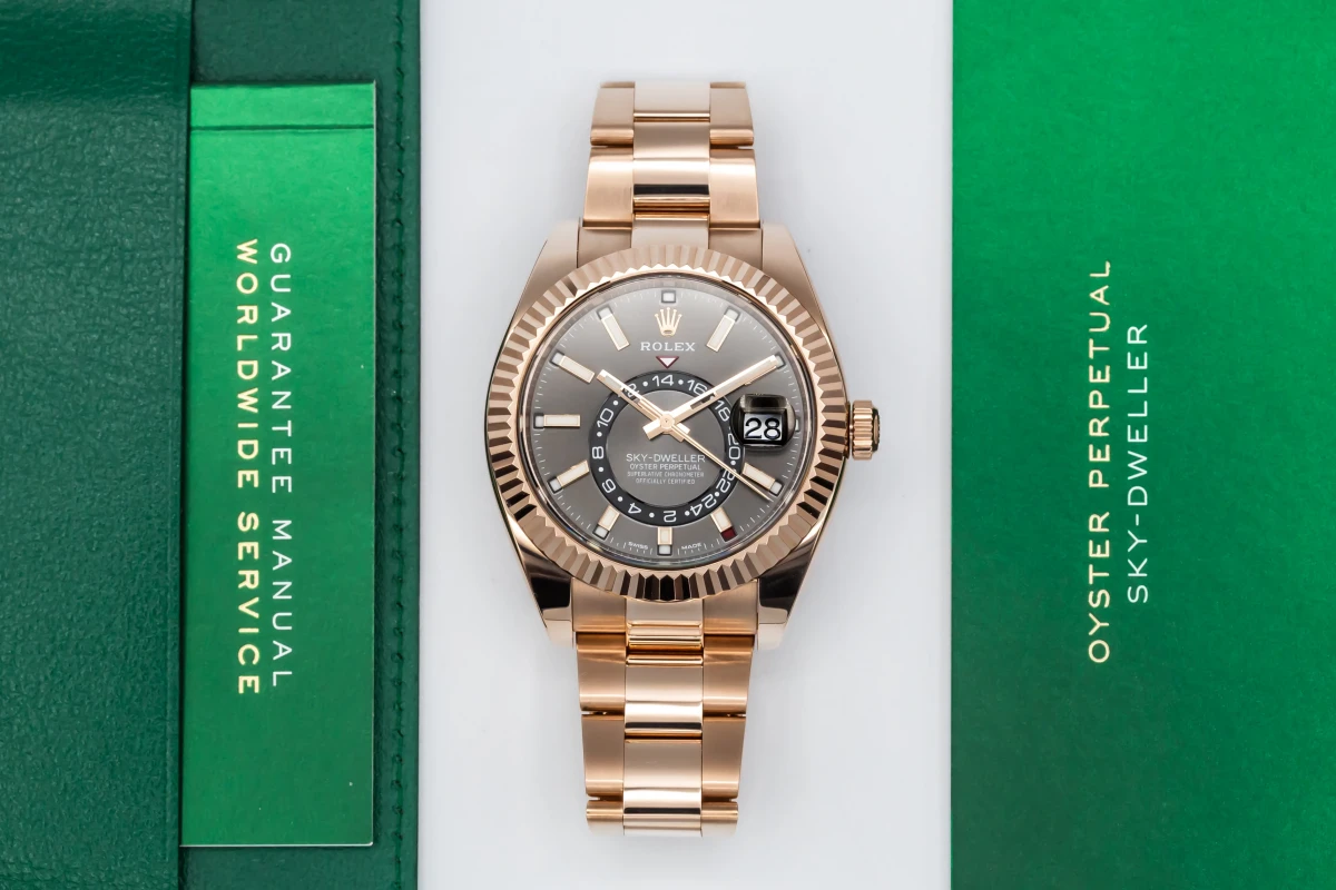 This 2019 Rolex Sky-Dweller 42mm features a rhodium dial with baton markers and a full 18ct rose gold oyster bracelet. It also features a full 18ct rose gold fluted bezel.