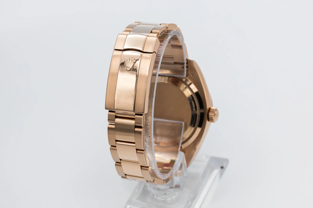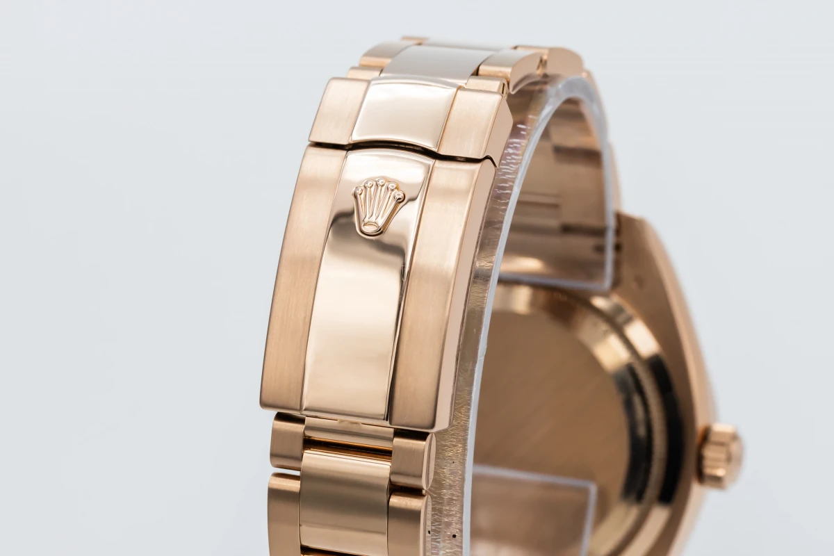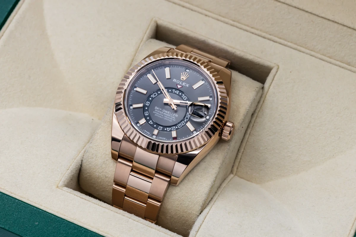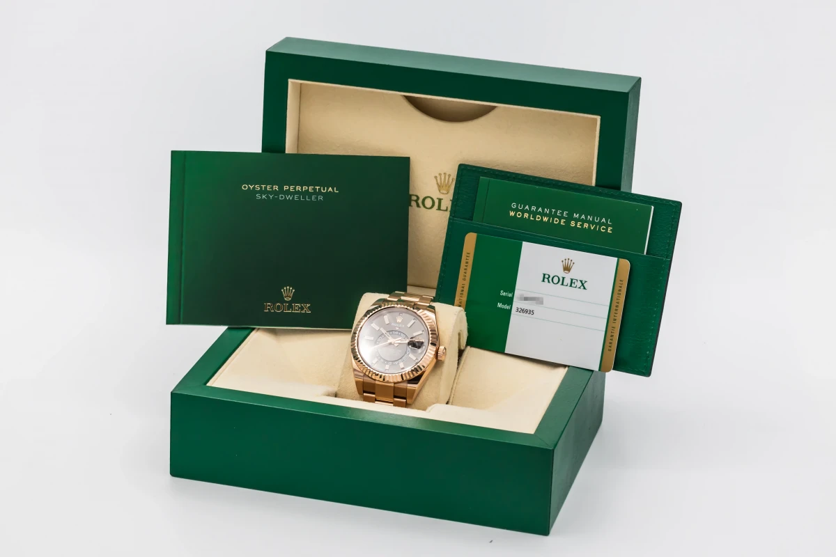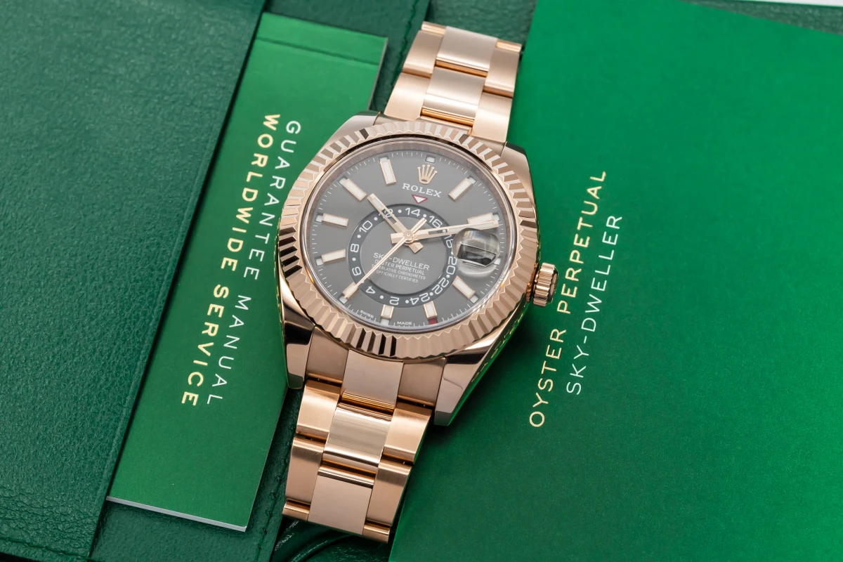 This 2019 Rolex Sky-Dweller 42mm features a rhodium dial with baton markers and a full 18ct rose gold oyster bracelet. It also features a full 18ct rose gold fluted bezel.