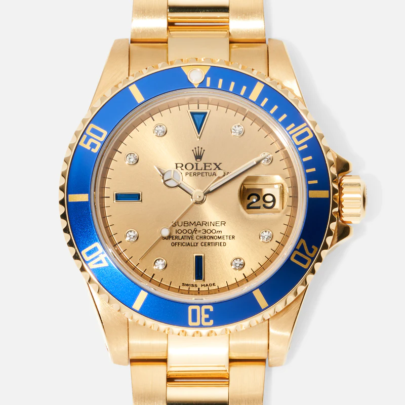 This 1992 Rolex Submariner 40mm features a Serti Blue Saphire Diamond and a solid-link oyster bracelet in 18ct yellow gold. It also features a blue aluminium unidirectional rotatable bezel.