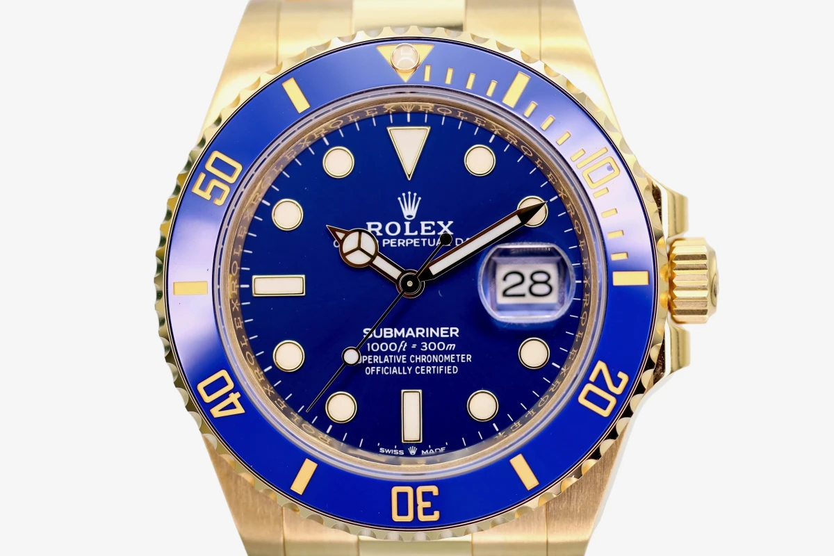 Full 18ct yellow gold Rolex Submariner with the blue dial. This stunning piece is a show stopper and a great addition to any Rolex collection. Crafted with solid gold links complete with the blue bezel and dial complimenting each other perfectly.