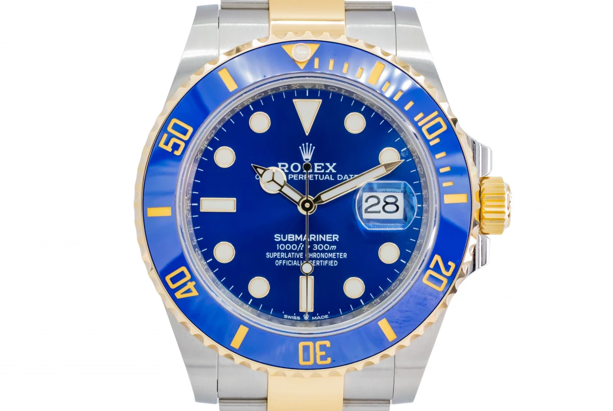 This unworn 2022 Rolex Submariner features a 40mm blue dial with large luminescent hour markers and a solid-link oyster bracelet in oystersteel and 18ct yellow gold. It features a blue cerachrom unidirectional rotatable bezel.