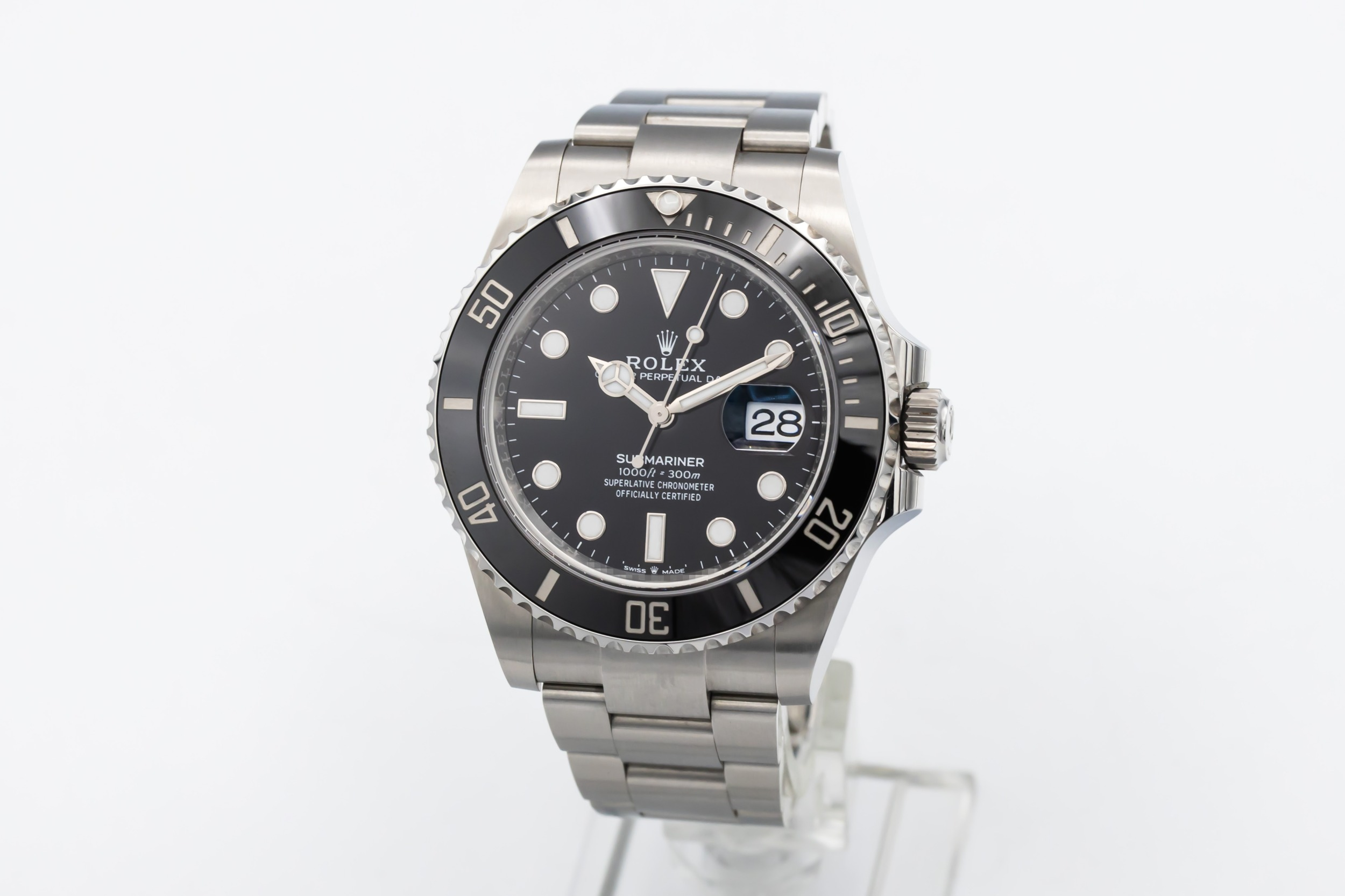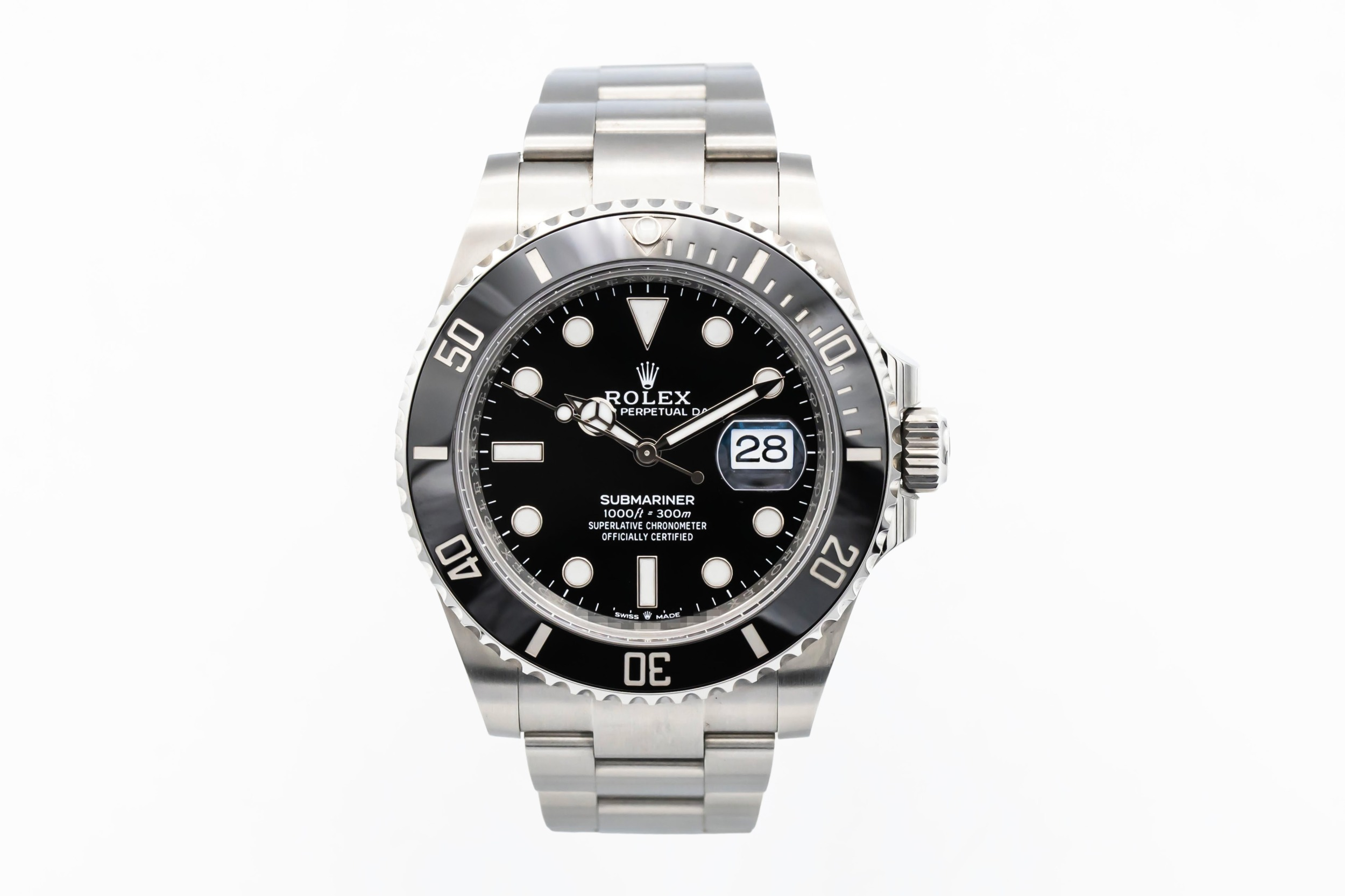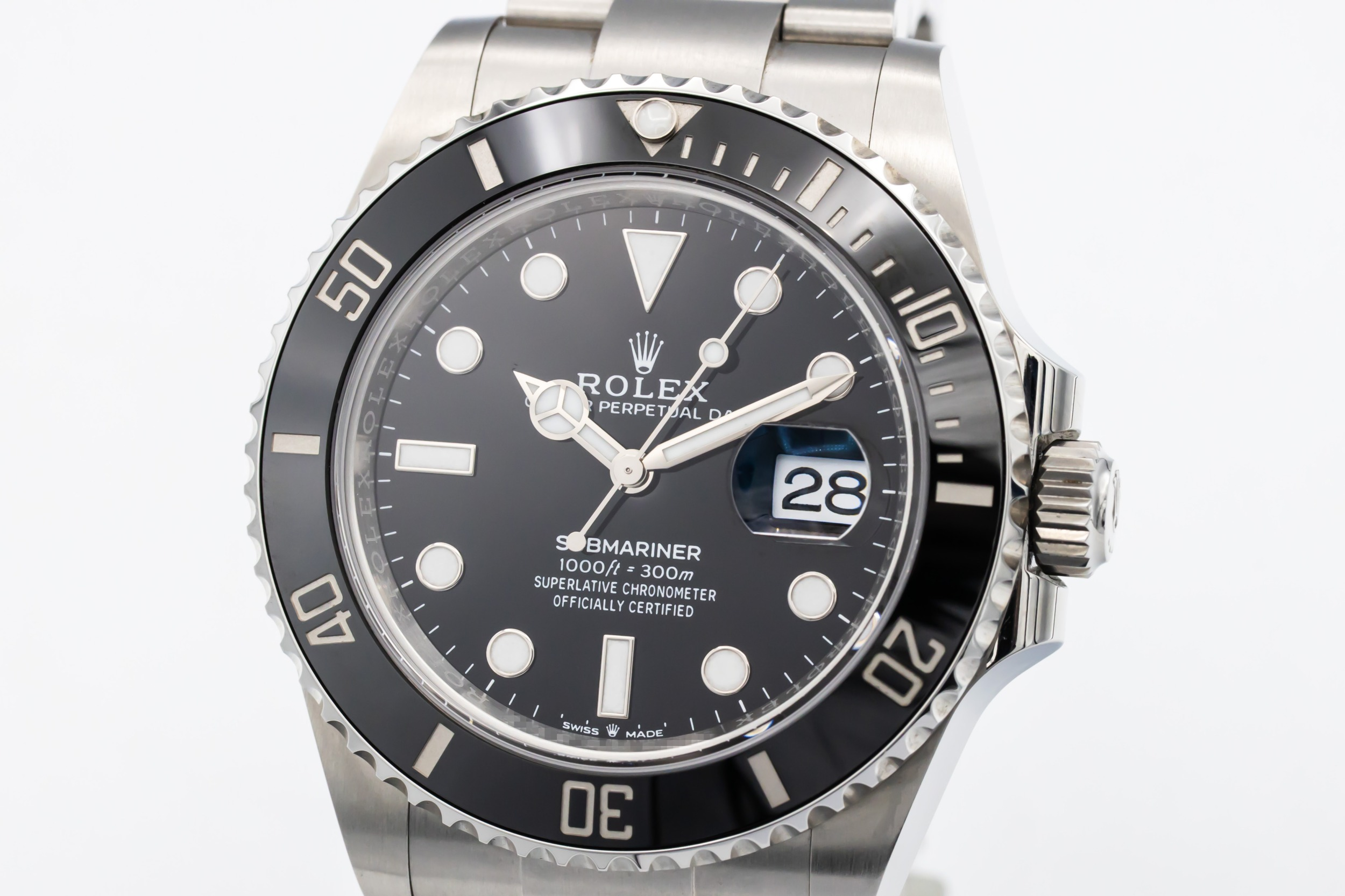 This 2023 Rolex Submariner Date 41mm is a modern luxury dive watch crafted entirely from stainless steel. The black dial features luminous hour markers and Mercedes hands for exceptional underwater legibility, complemented by the black Cerachrom ceramic bezel designed for precise dive timing. Finished on the robust stainless steel Oyster bracelet with a secure Oysterlock clasp.