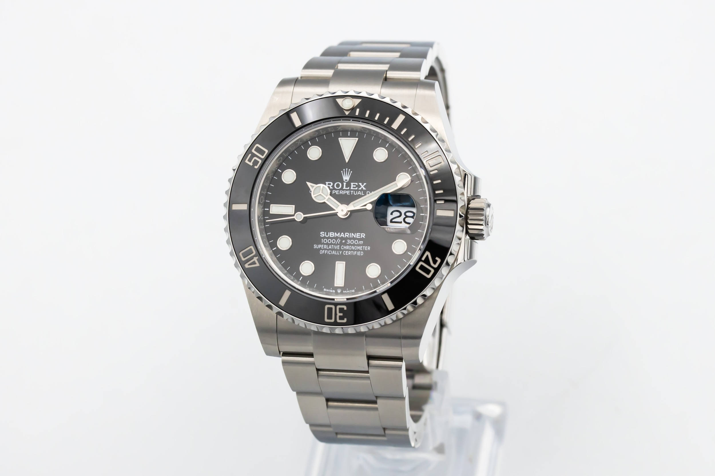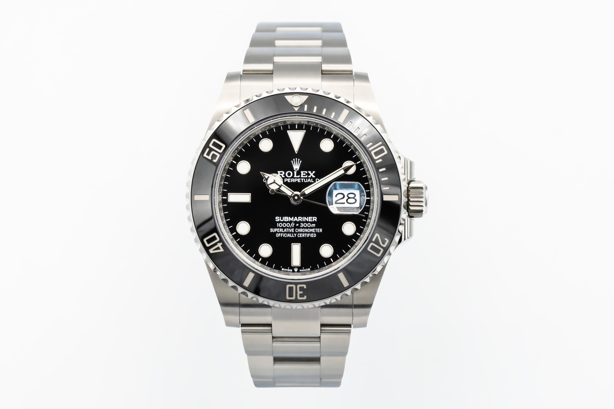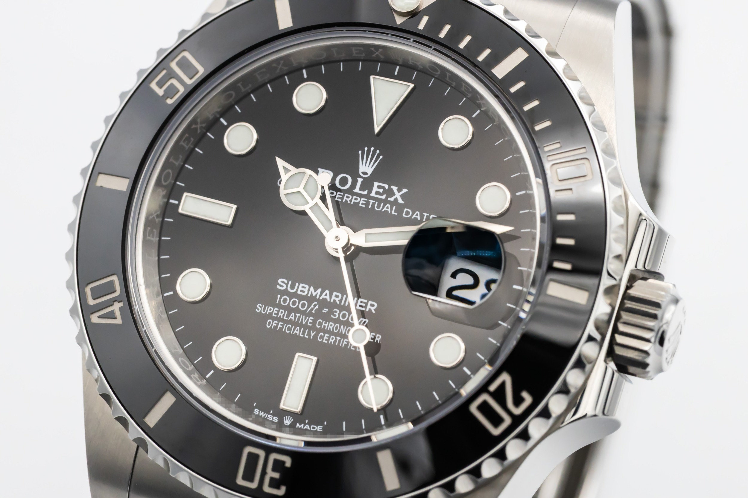 This unworn 2024 Rolex Submariner Date 41mm is a legendary luxury dive watch crafted entirely from stainless steel. The black dial features luminous hour markers and the iconic Mercedes hands for exceptional underwater legibility, paired with a black Cerachrom ceramic bezel designed for precise dive timing. Finished on the robust stainless steel Oyster bracelet with a secure Oysterlock clasp.