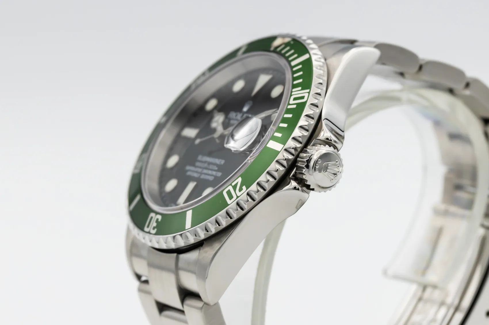 finance this from £168.83 p/m call the shop Read about our Limited Lifetime WarrantyThis 2006 Rolex Submariner Date 40mm ‘Kermit’ is a highly collectible luxury dive watch crafted entirely from stainless steel. The black dial features luminous hour markers and Mercedes hands for exceptional legibility, complemented by the iconic green aluminium bezel that defines the “Kermit” nickname. Finished on the robust stainless steel Oyster bracelet.