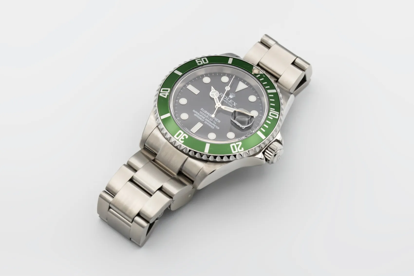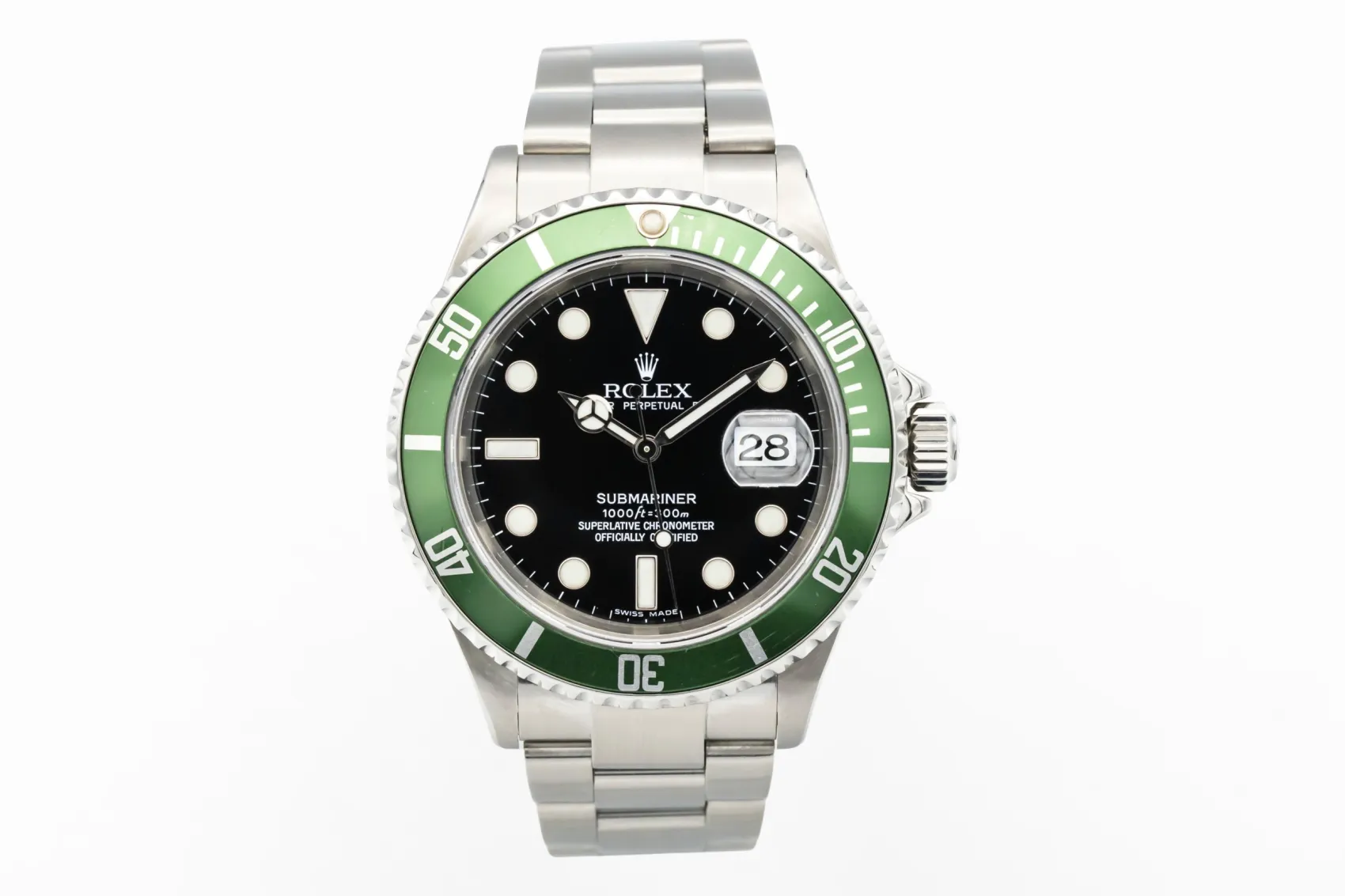 Introduced in 2003 to celebrate the 50th anniversary of the Submariner, the reference 16610LV became instantly recognisable for its green bezel. It remains one of the most sought-after transitional Submariner models.