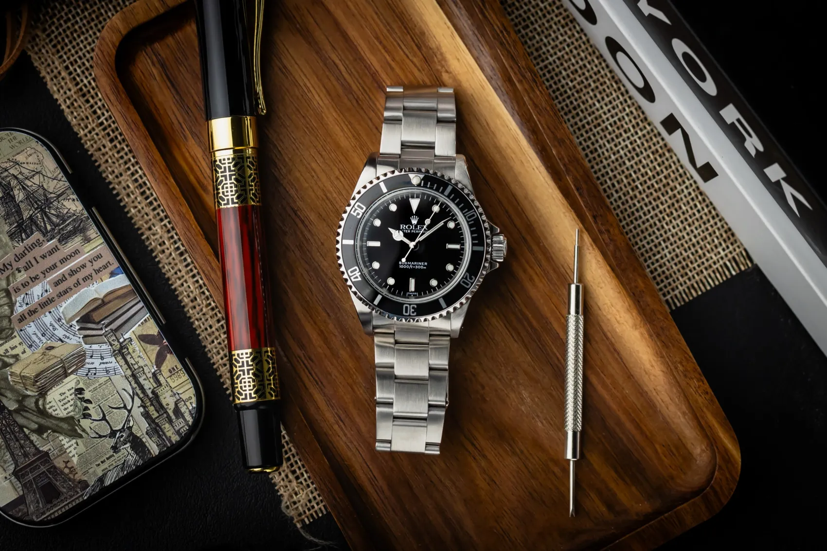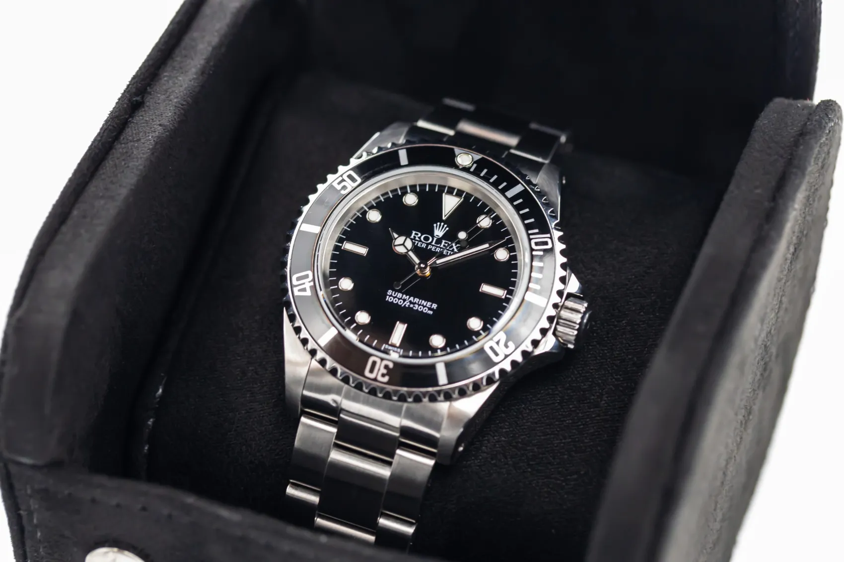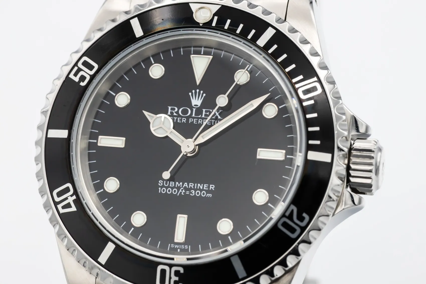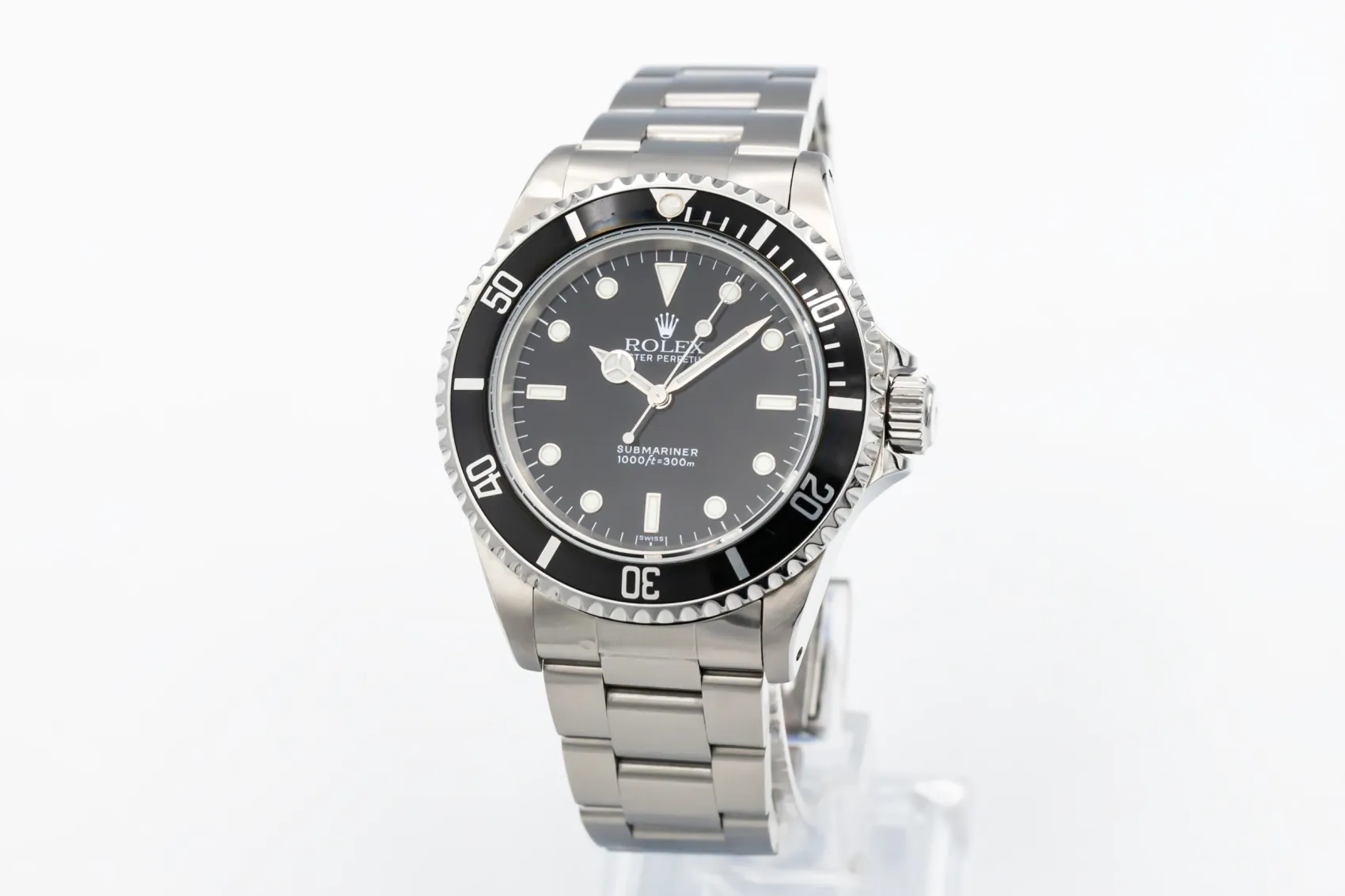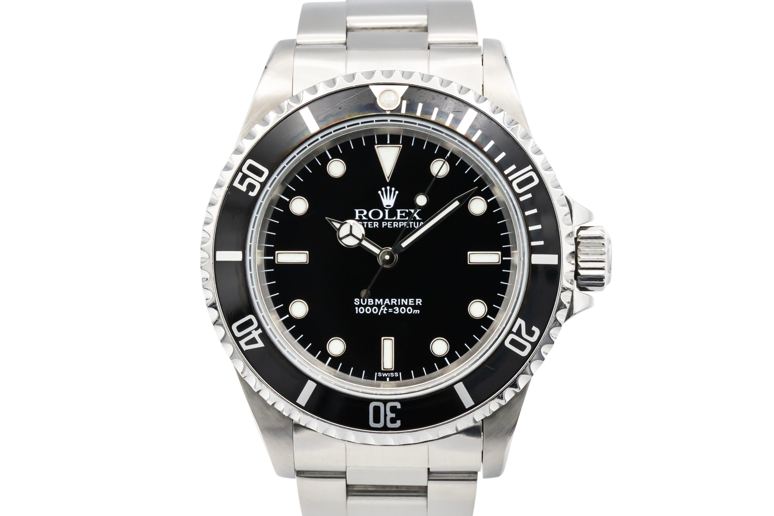 The Submariner 14060 is one of Rolex’s most iconic no-date models. The rare “Swiss Only” dial was produced for a short transitional period around 1998–2000, marking the shift from tritium to Luminova lume.