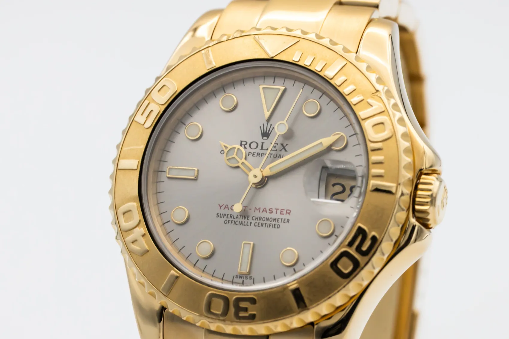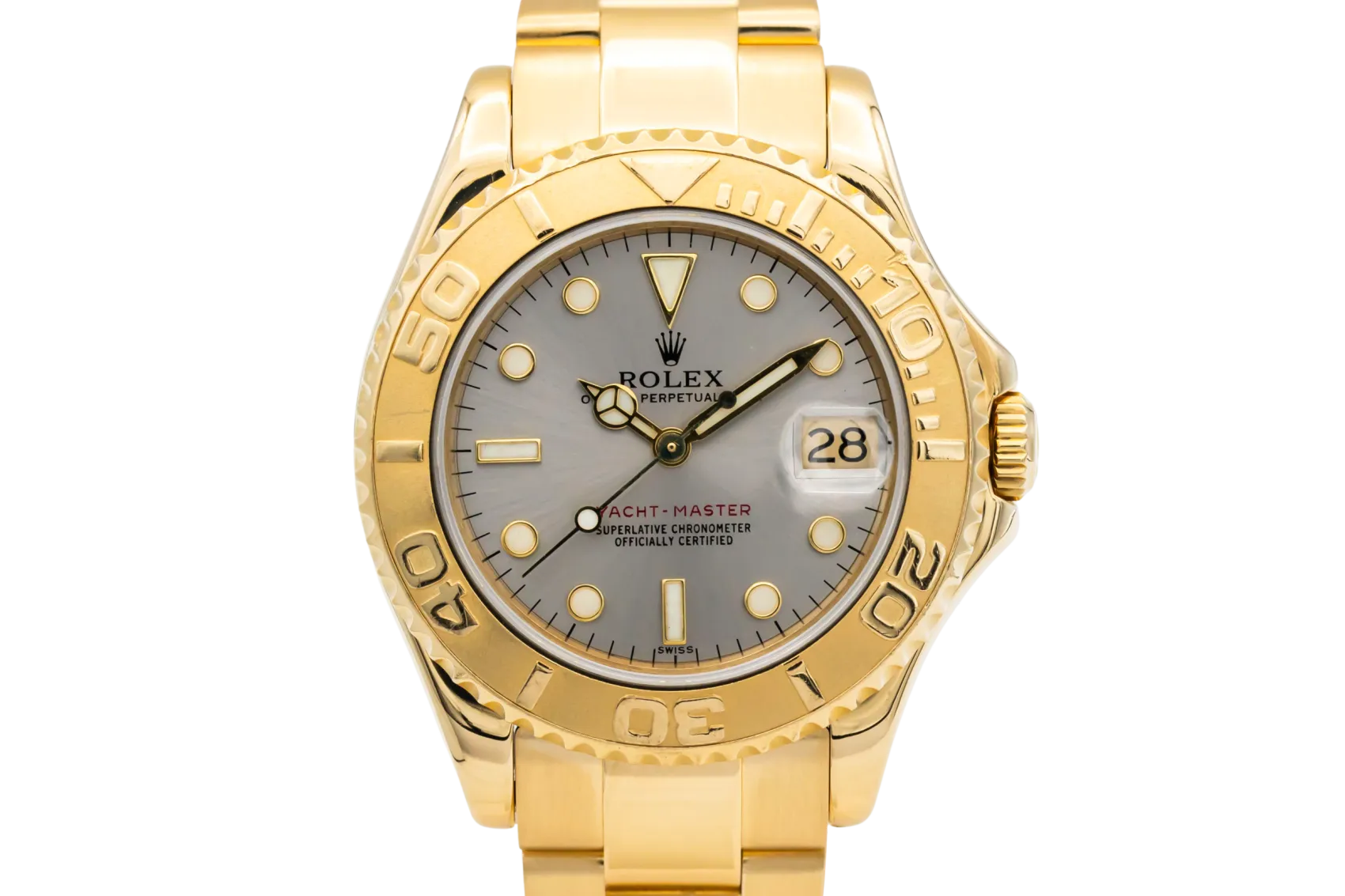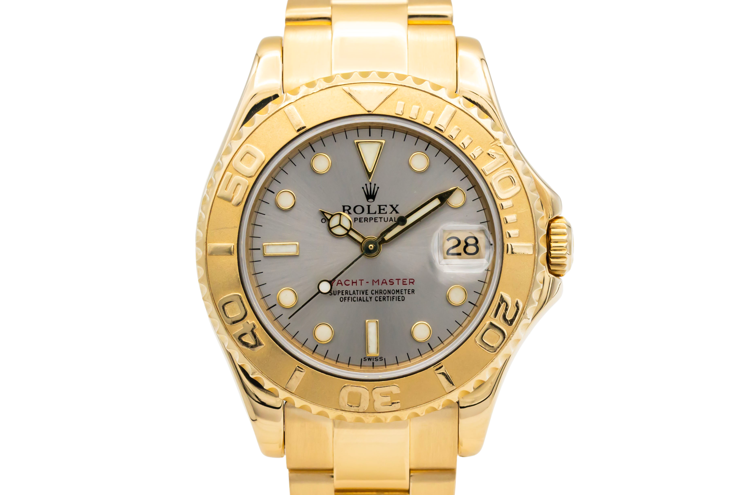 finance this from £211.05 p/m call the shop Read about our Limited Lifetime WarrantyThis 1996 Rolex Yacht-Master 35mm is a luxurious sports watch crafted entirely in 18ct yellow gold. The elegant grey dial features luminous hour markers and Mercedes hands for excellent legibility, complemented by the distinctive yellow gold bidirectional bezel with raised polished numerals. Finished on the solid 18ct yellow gold Oyster bracelet.