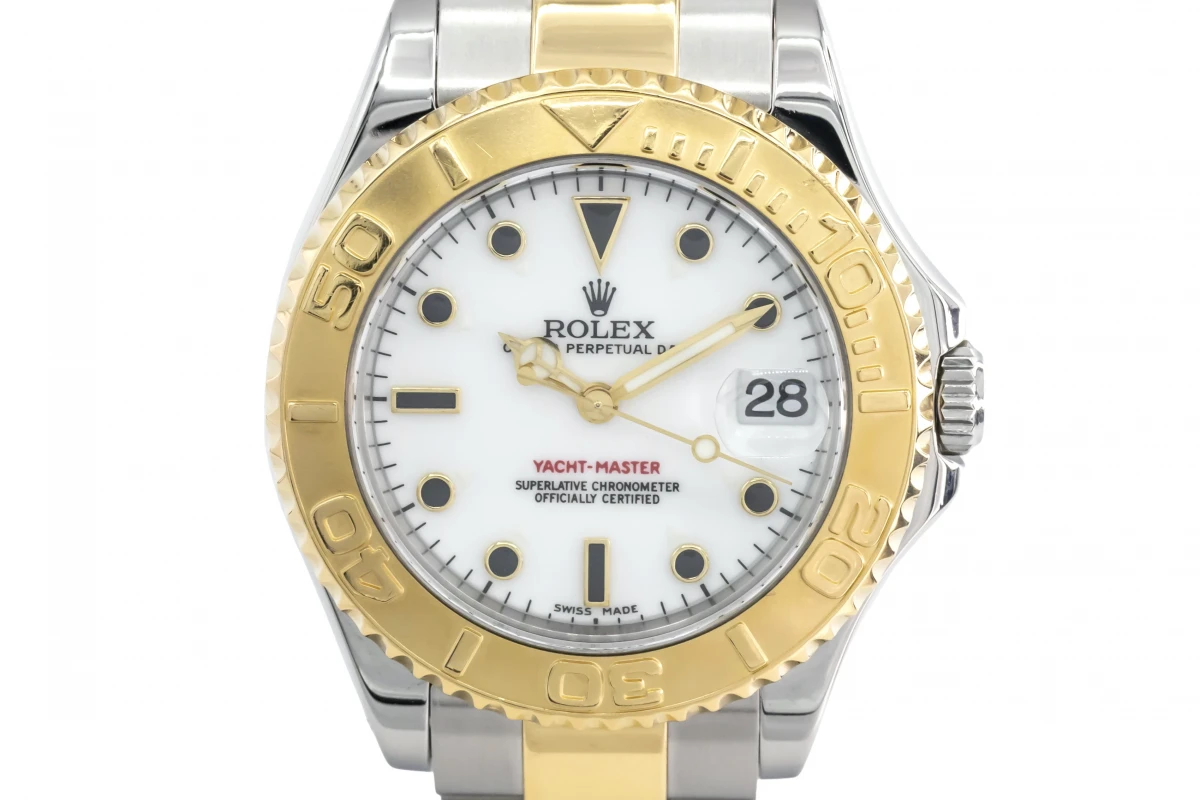 This 2004 Rolex Yacht-Master Features A 35mm White Round Index Dial, A Stainless Steel And 18ct Yellow Gold Oyster Bracelet And A Gold Bidirectional Rotatable Bezel.