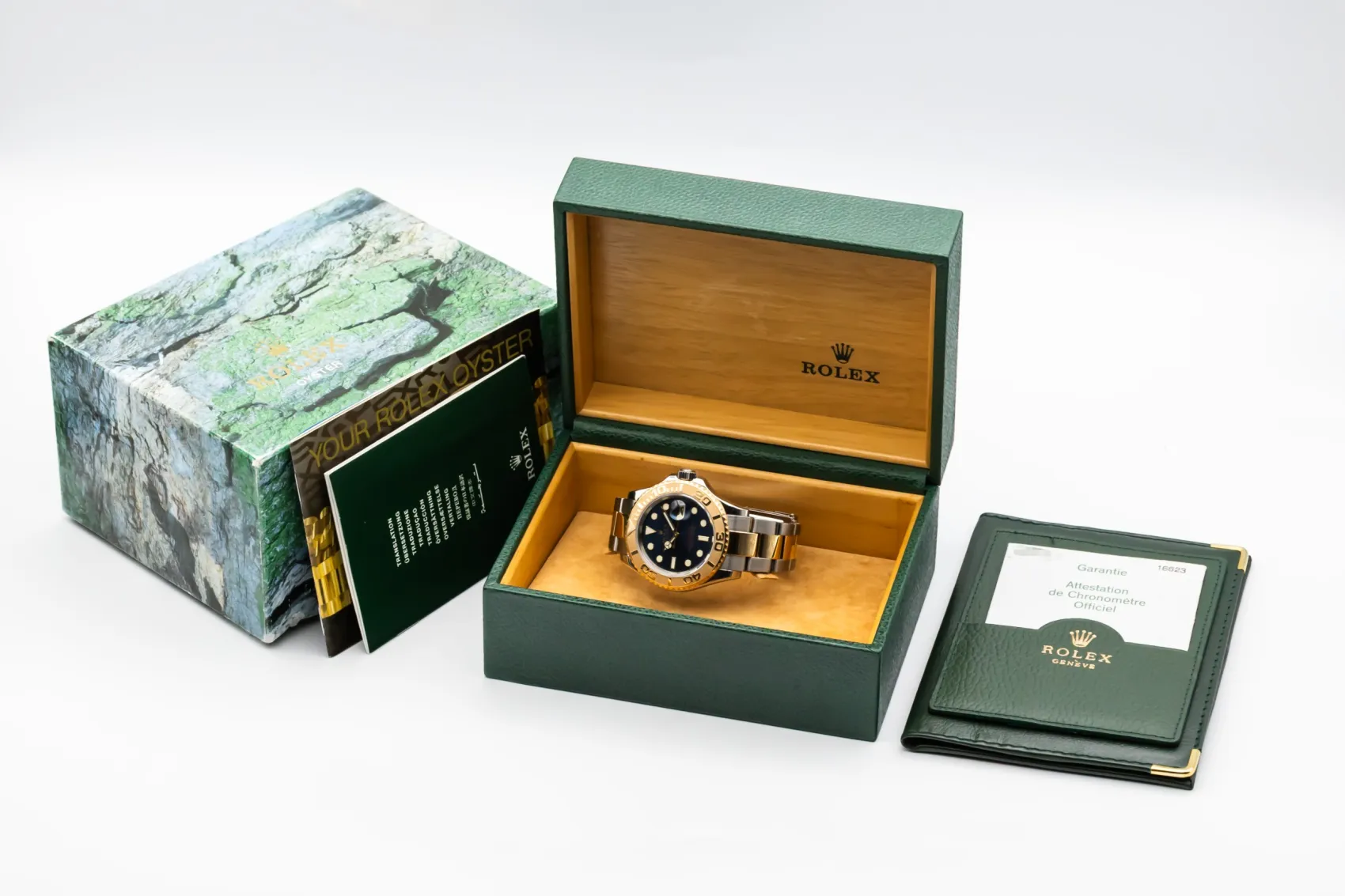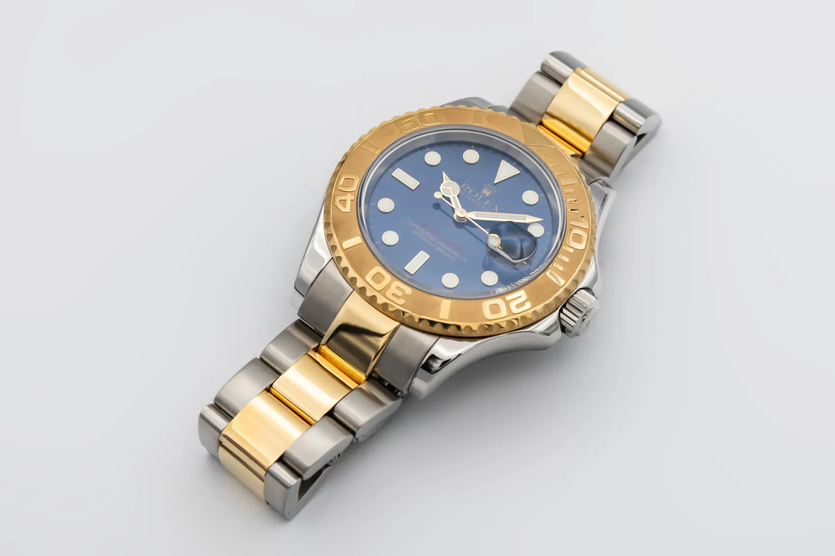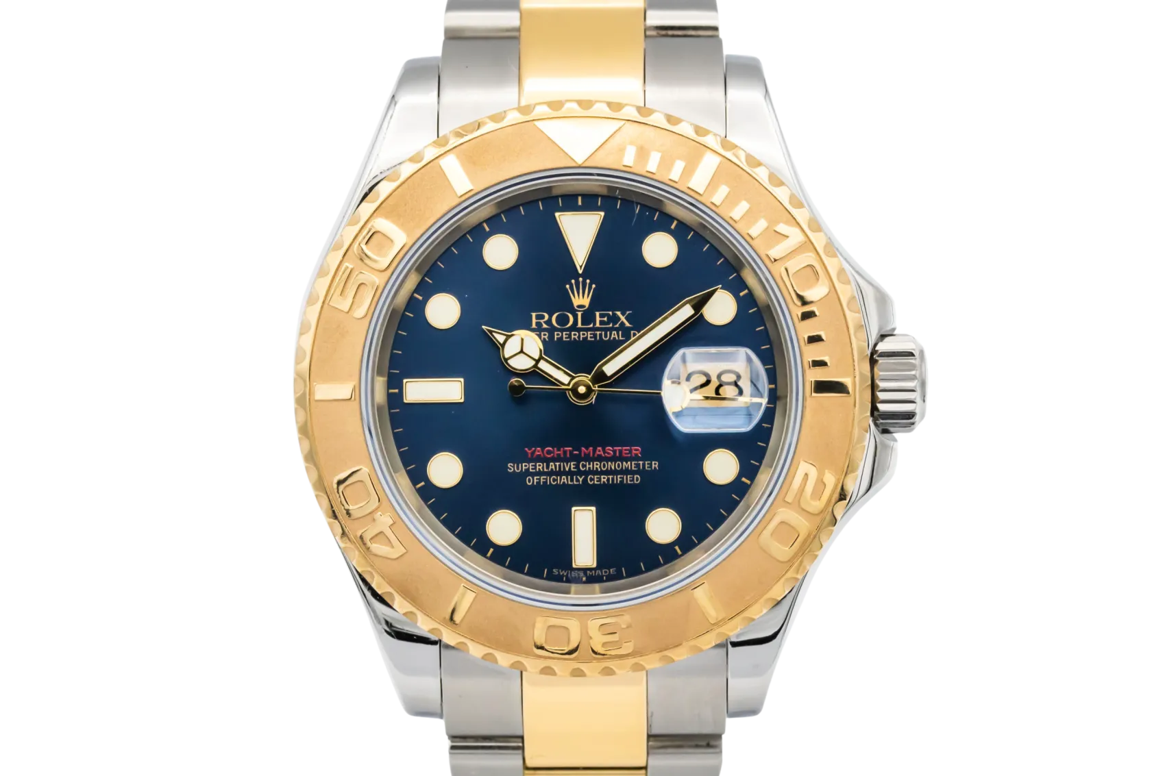 finance this from £153.19 p/m call the shop Read about our Limited Lifetime WarrantyThis 2006 Rolex Yacht-Master 40mm is a luxurious sports watch crafted from stainless steel and 18ct yellow gold. The blue dial features luminous hour markers and Mercedes hands for excellent legibility, alongside the signature date window at 3 o’clock with Rolex’s Cyclops lens. The distinctive yellow gold bidirectional bezel with raised numerals adds the iconic Yacht-Master aesthetic, finished on the classic steel and gold Oyster bracelet.