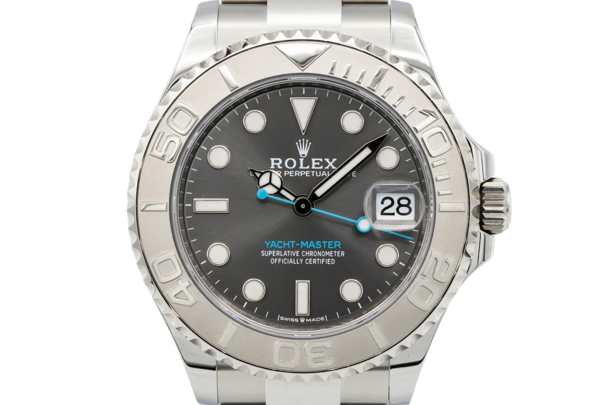 This 2023 Rolex YachtMaster 40mm features a rhodium dial with round index markers and a stainless steel oyster bracelet. It also features a platinum bidirectional rotatable bezel.