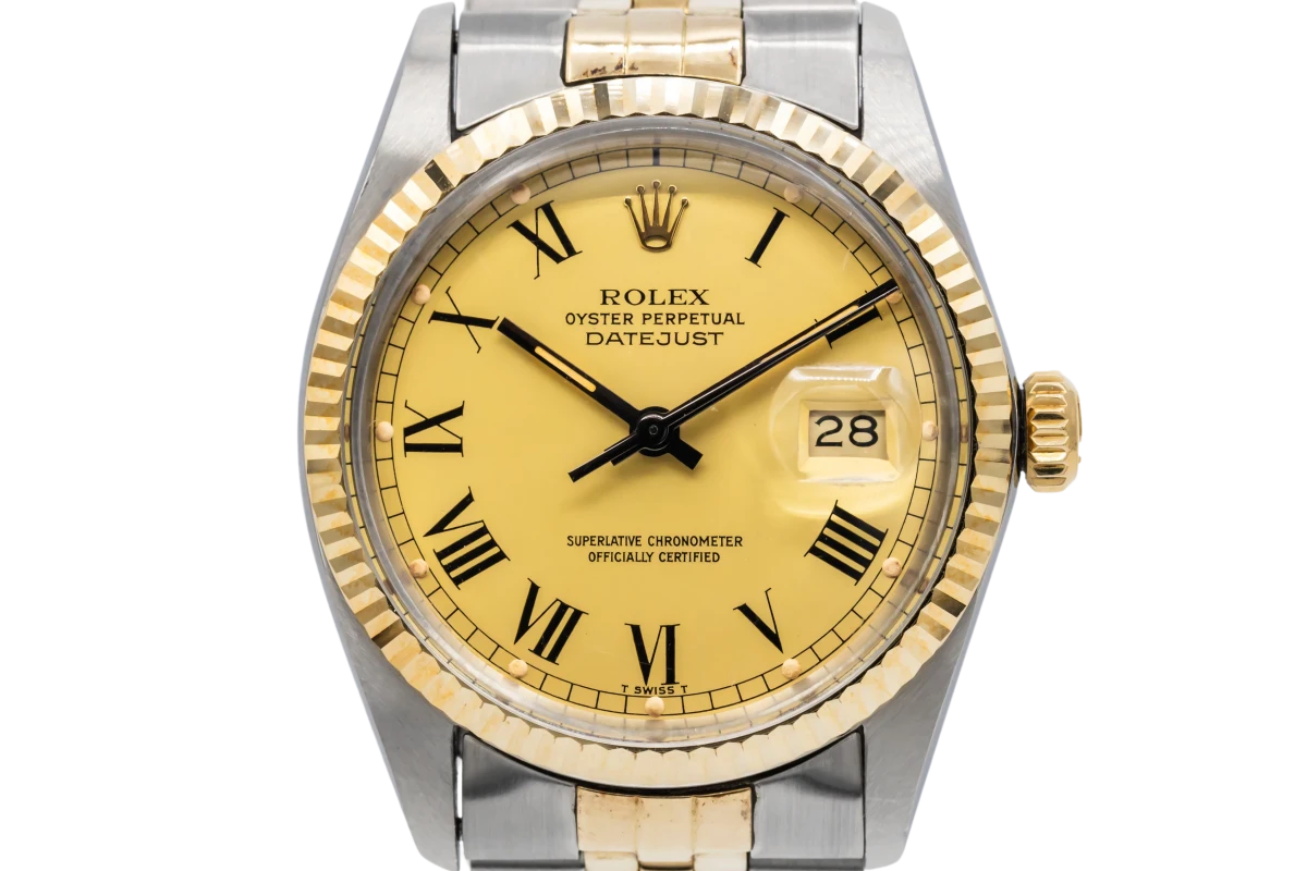 This 1984 Rolex DateJust 36mm features a champagne 'Buckley Dial' with roman numerals and a stainless steel and 18ct yellow gold jubilee bracelet. It also features a 18ct yellow gold fluted bezel.