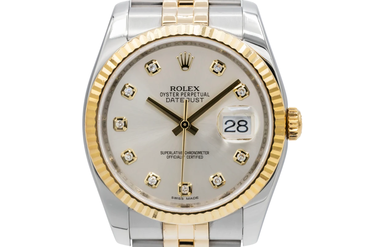 This 2014 Rolex DateJust 36mm features a silver dial with factory diamond markers and a stainless steel and a 18ct yellow gold jubilee bracelet. It fitted with a 18ct yellow gold fluted bezel.