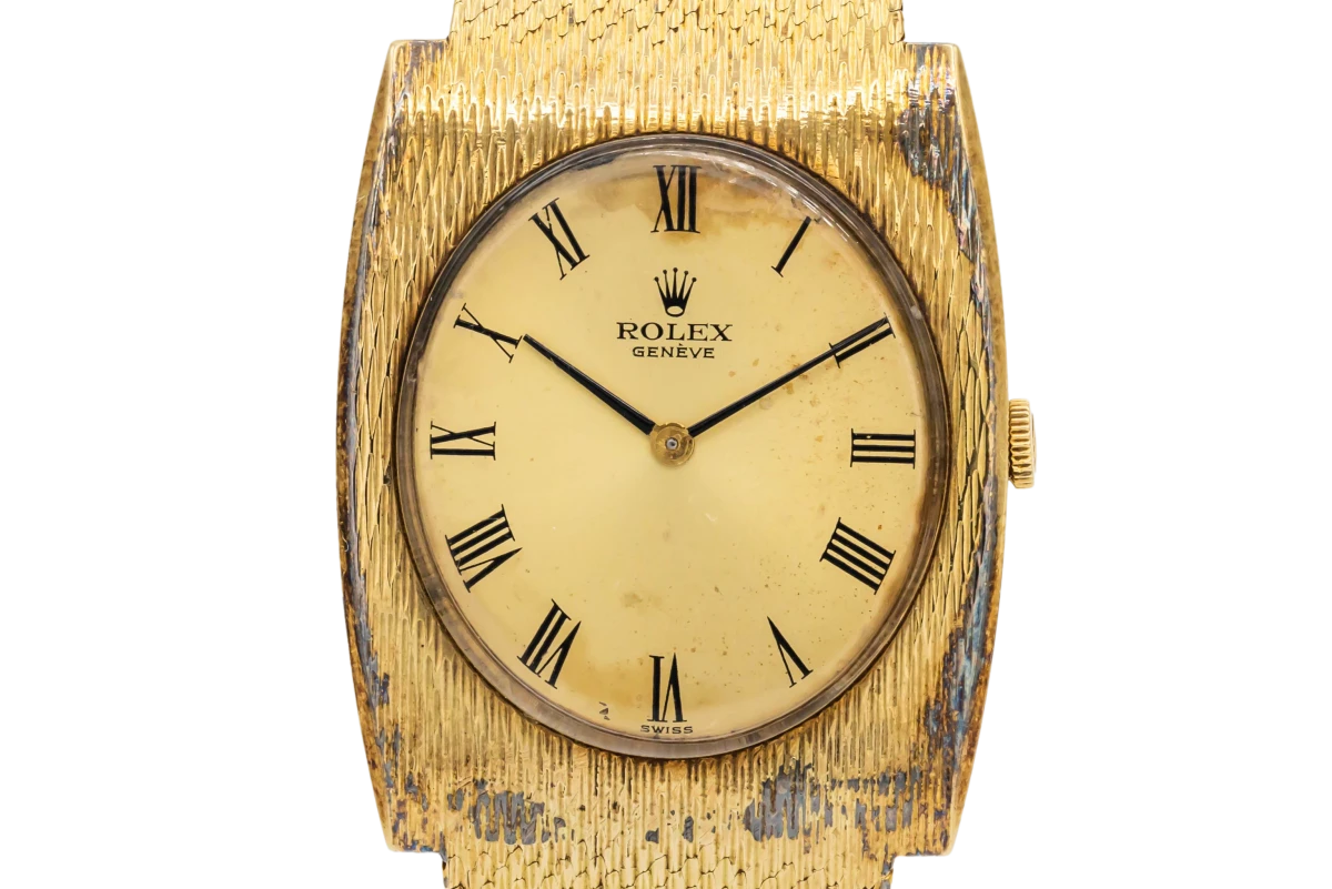This Rolex Pre Cellini Vintage 27mm a champagne dial with roman numerals and a 14ct solid yellow gold.