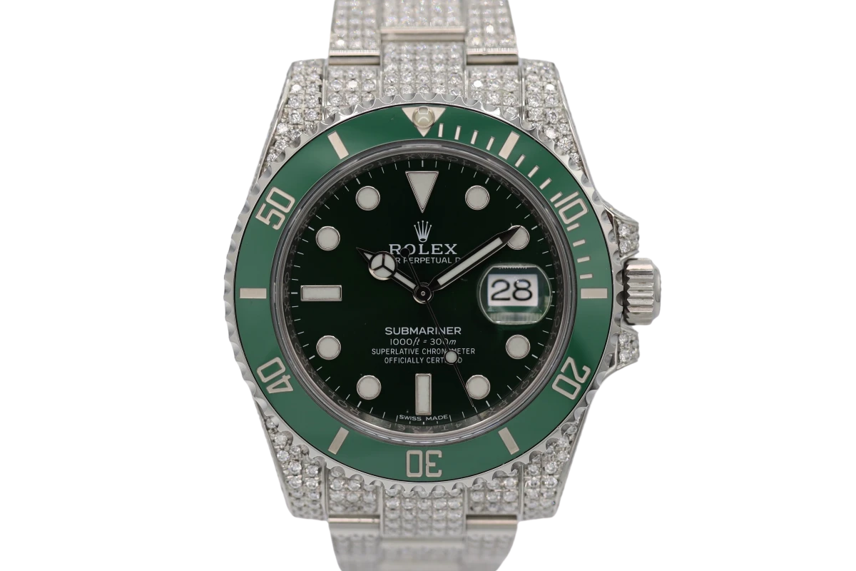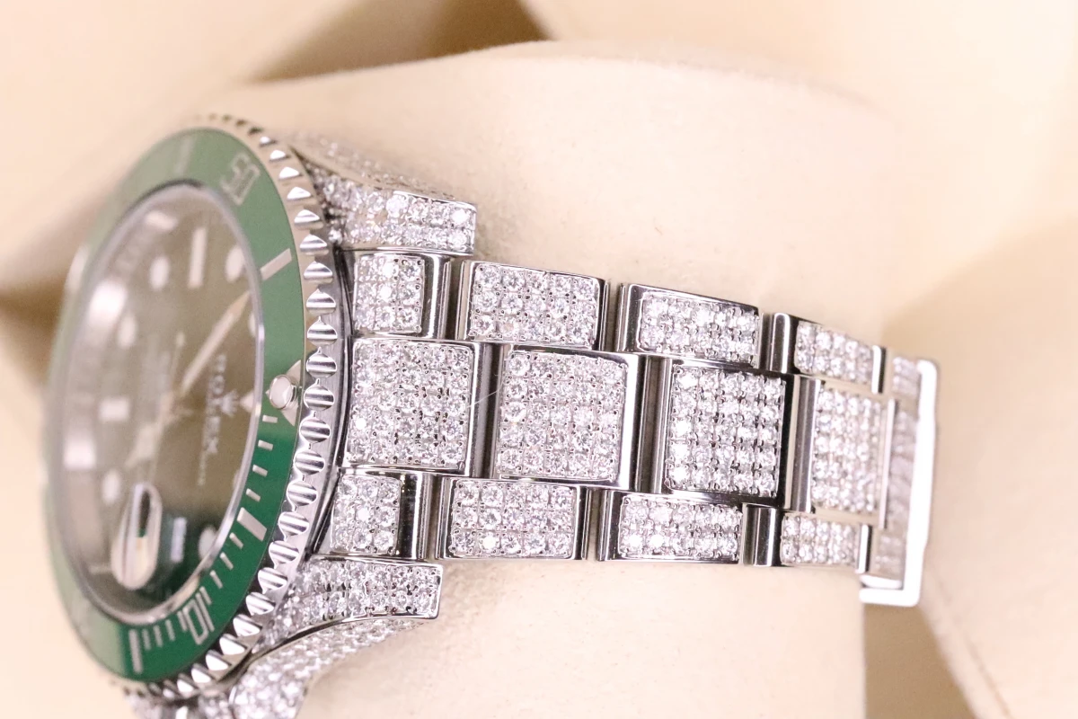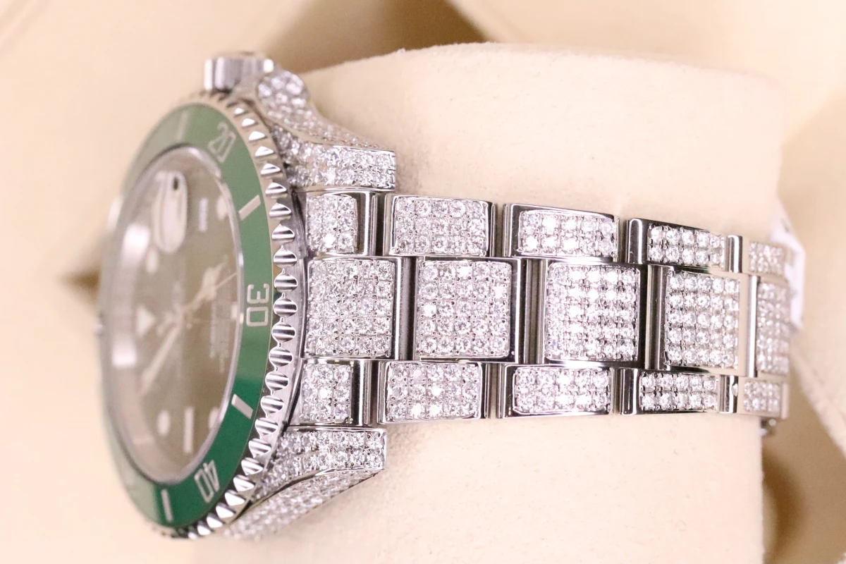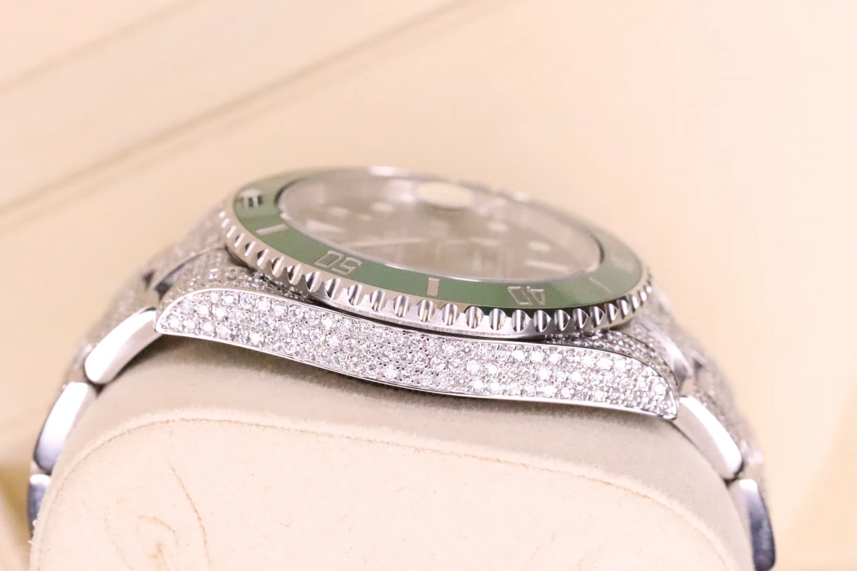 This Rolex Submariner comes with a 40mm case diameter, a Green index dial, a stainless steel bezel and stainless steel bracelet, and custom diamond decorations.