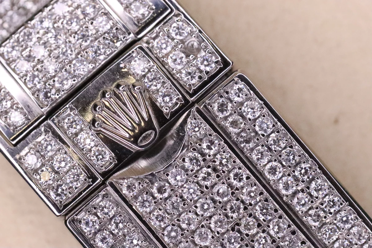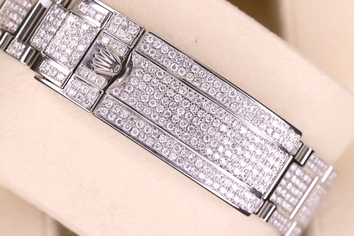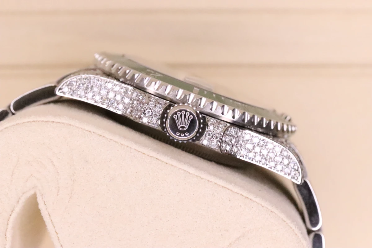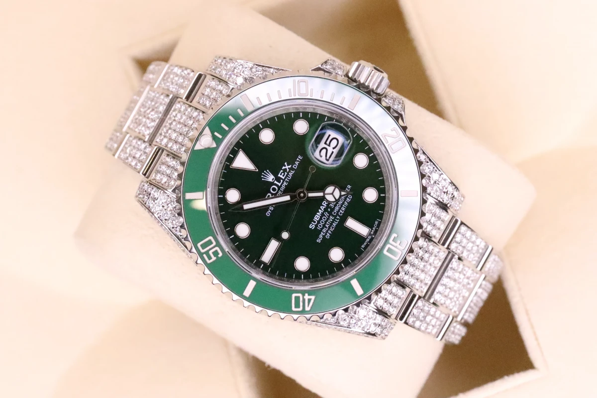 This Rolex Submariner comes with a 40mm case diameter, a Green index dial, a stainless steel bezel and stainless steel bracelet, and custom diamond decorations.