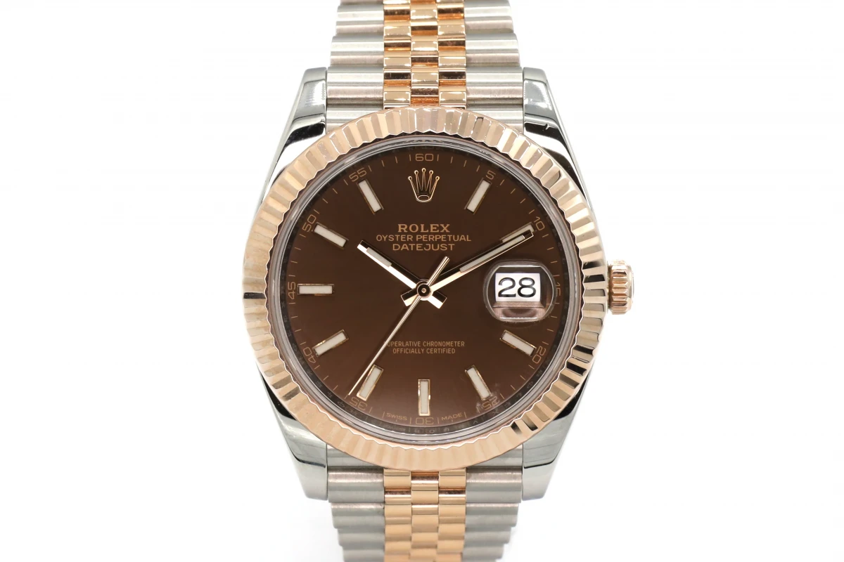 This Rolex Datejust comes with a 41mm case diameter, Chocolate baton dial, 18ct rose gold bezel and 18ct Rose Gold and Stainless Steel bracelet.