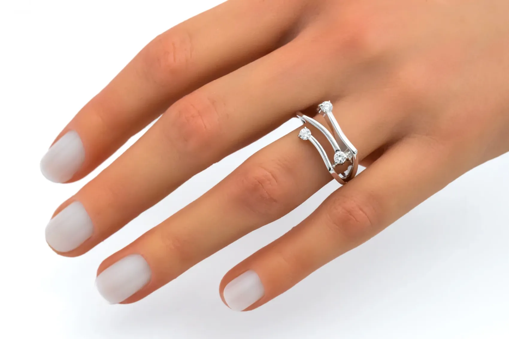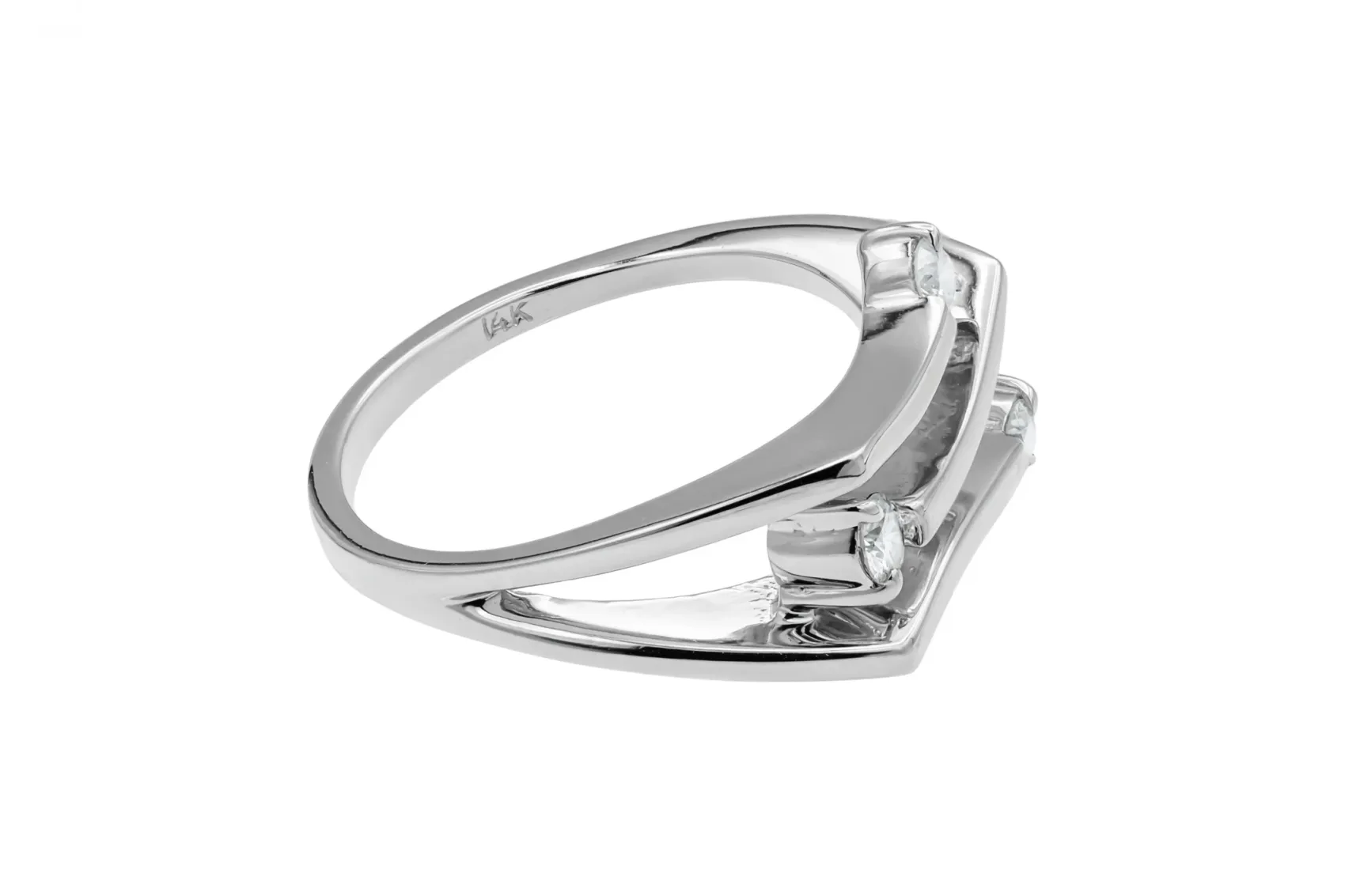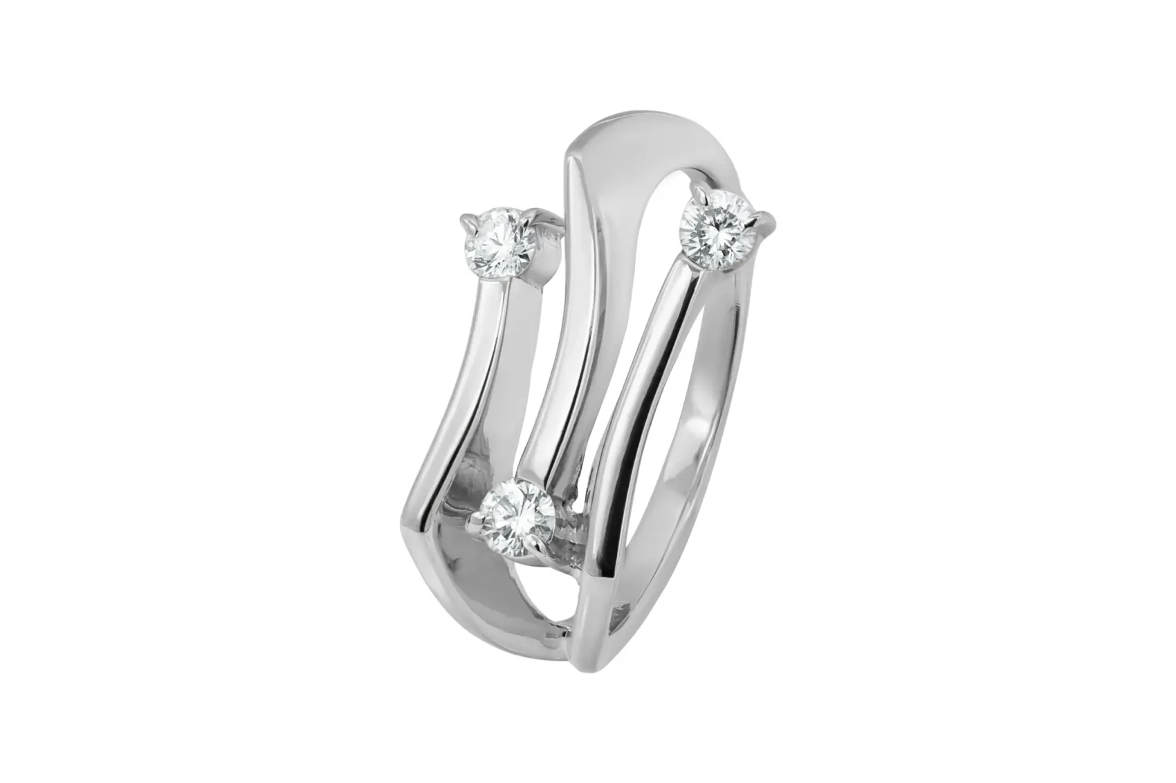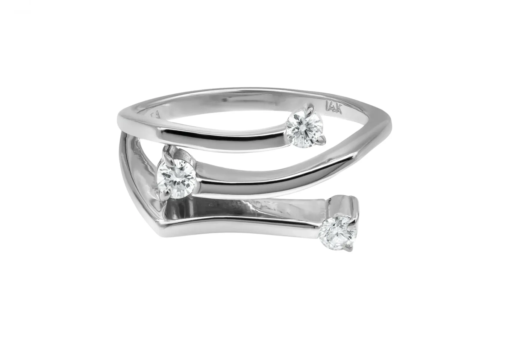A 14ct white gold diamond ring, featuring a split shank that curves fluidly, creating an open, sculptural effect. Set within the open spaces are three round brilliant-cut diamonds, each held securely in a classic four-prong setting.