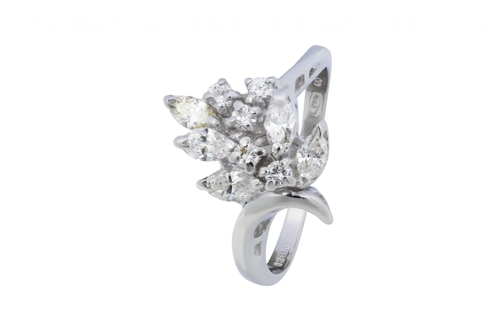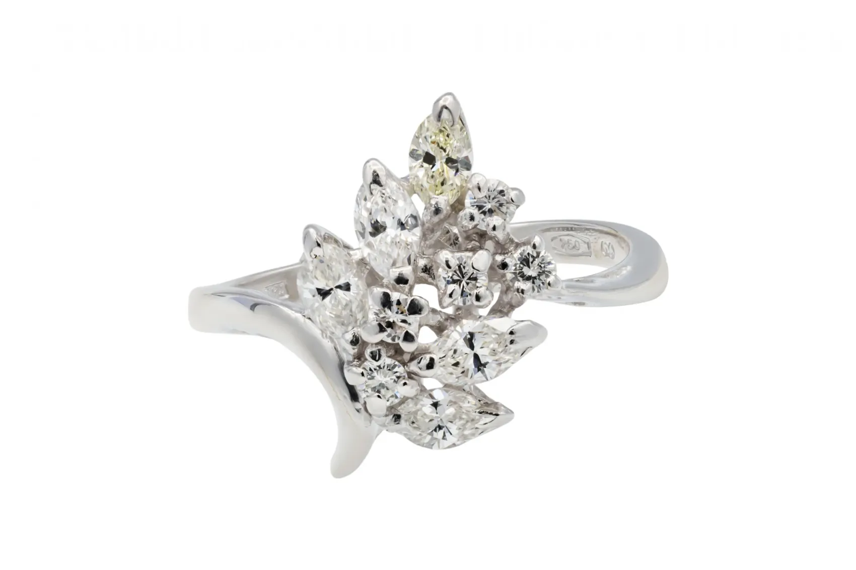This sophisticated 18ct white gold leaf design ring showcases round brilliant cut diamonds totalling 0.75ct.
