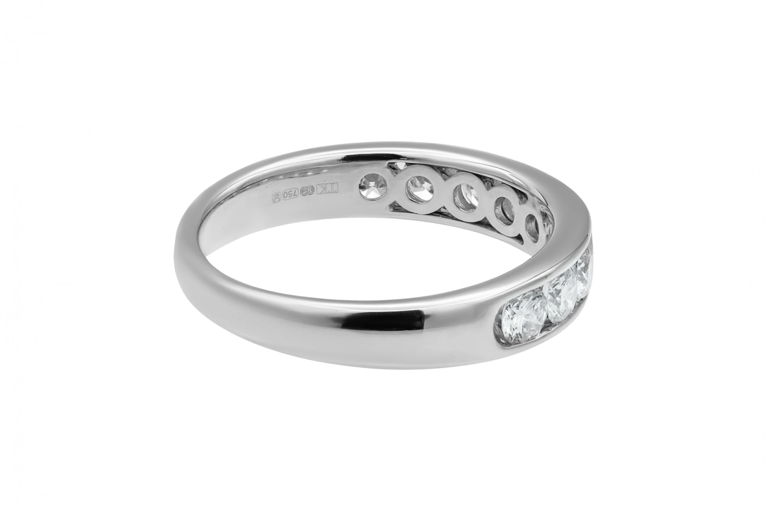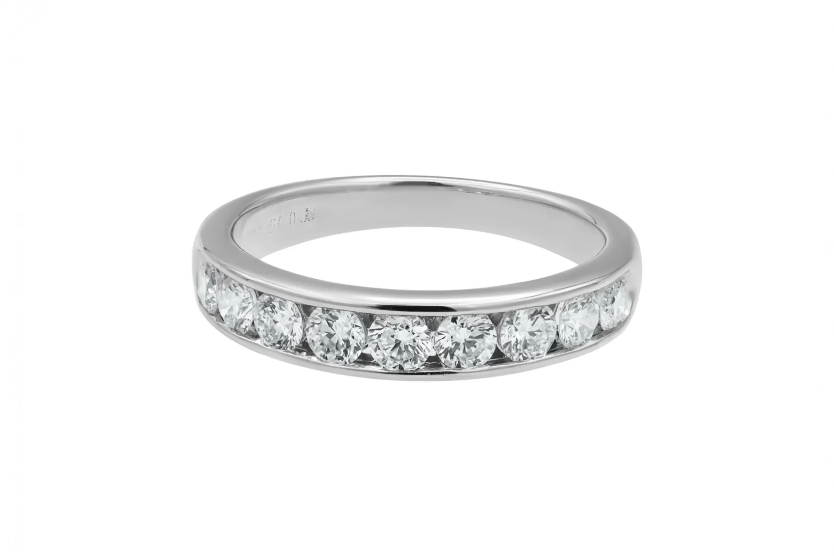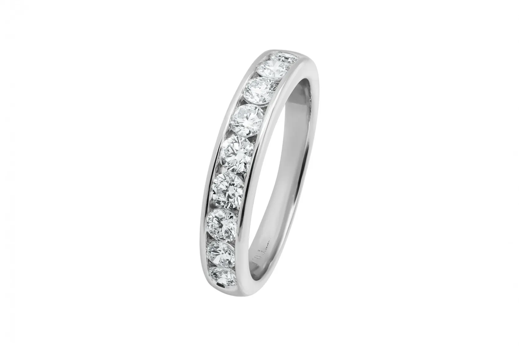 This refined 18ct white gold ring features 1.08ct of round brilliant cut diamonds set in a clean channel setting, graded H colour with VS clarity for crisp, continuous sparkle.