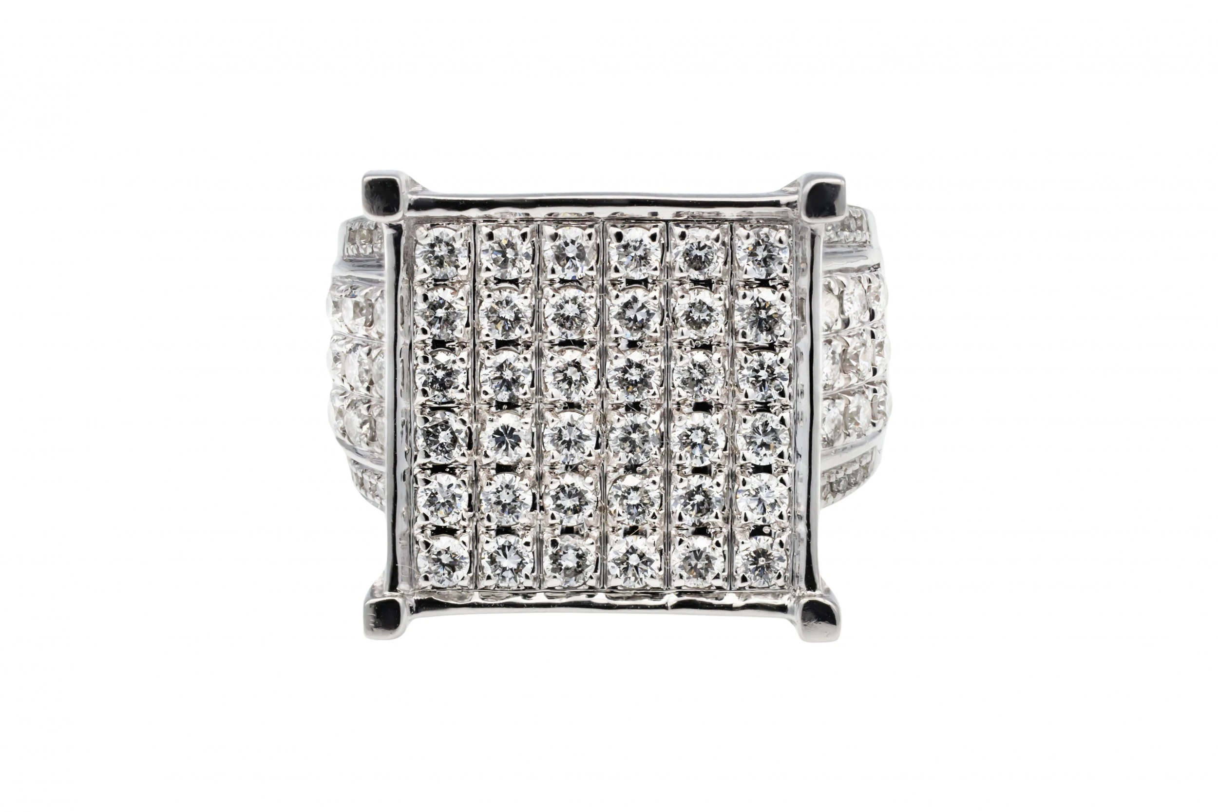 This striking 14ct white gold ring is set with an impressive 2.25ct of round brilliant cut diamonds, graded H colour with SI clarity for strong brilliance and visual impact.