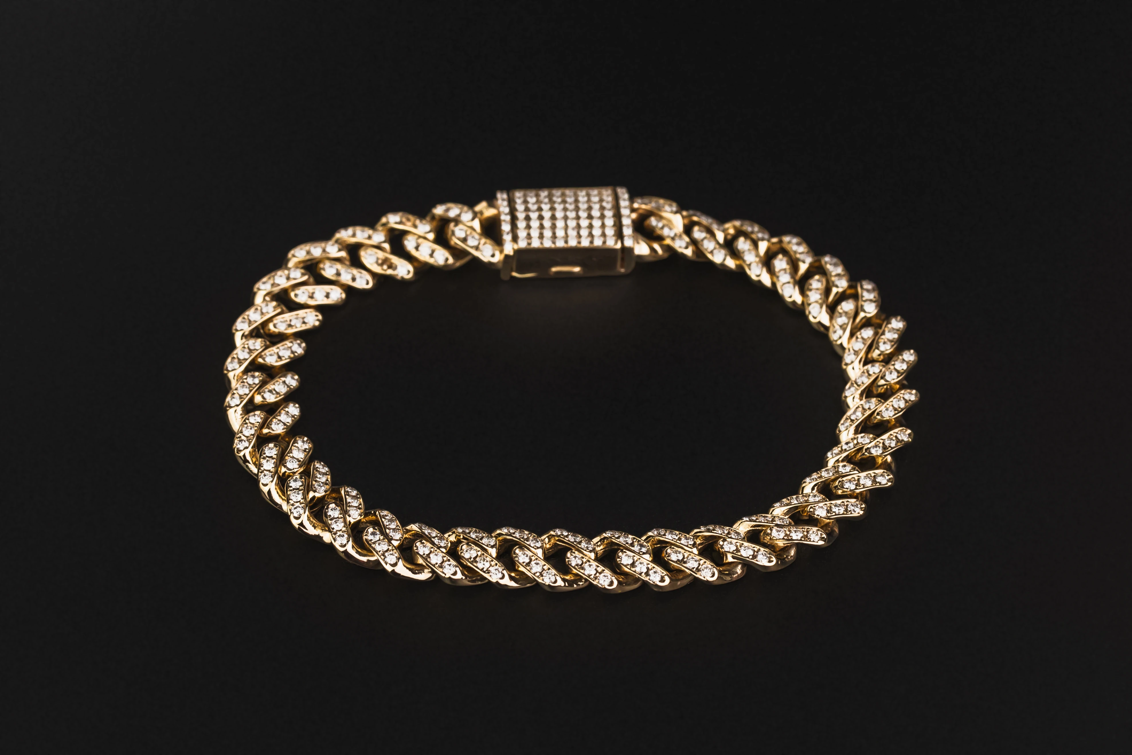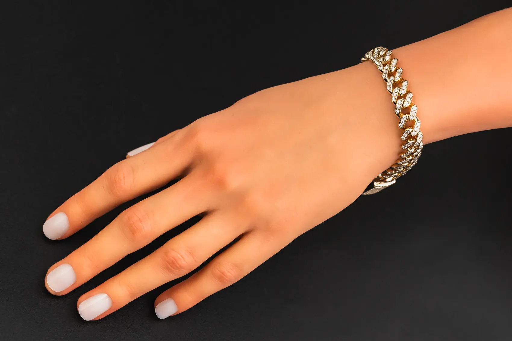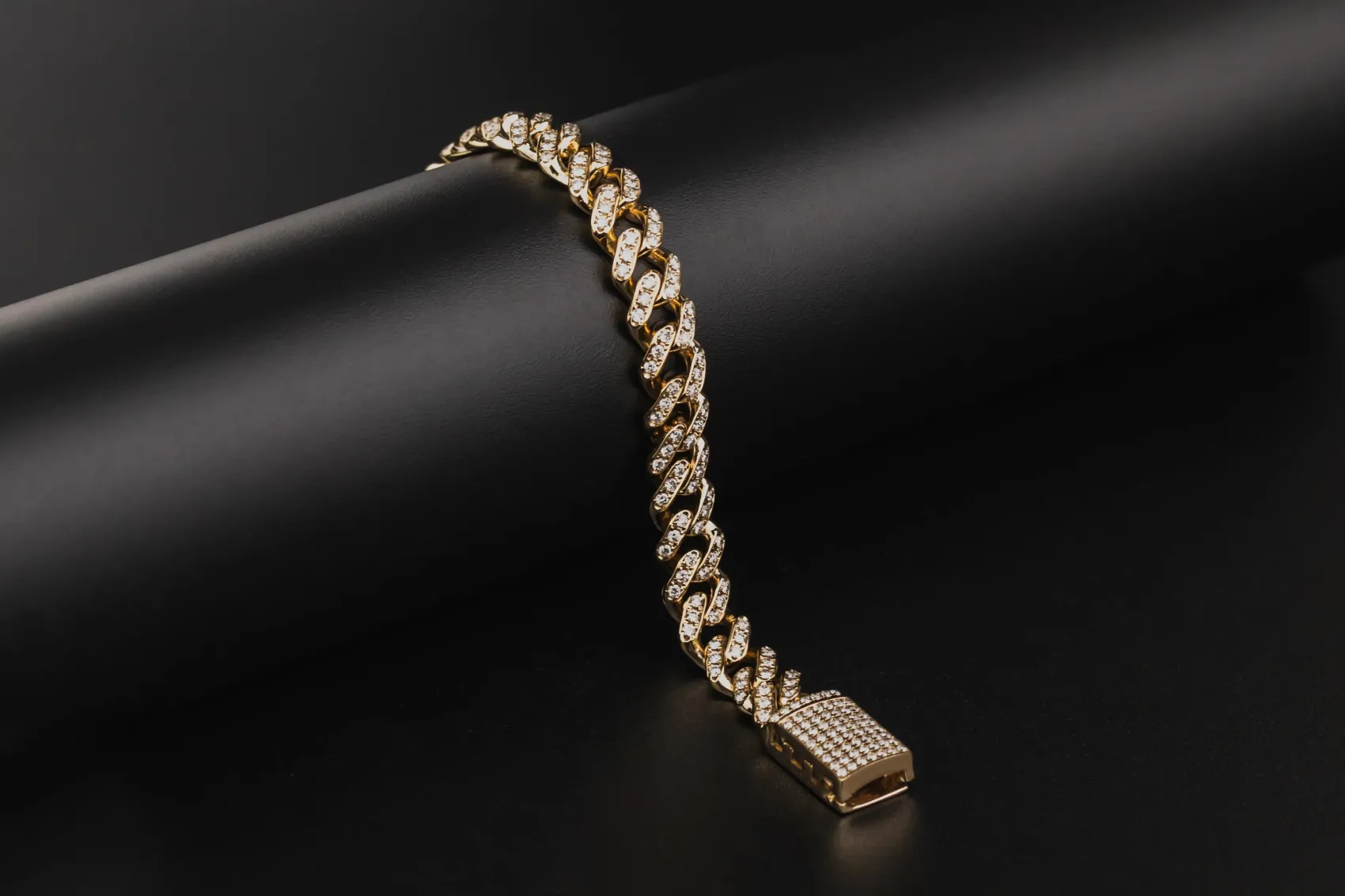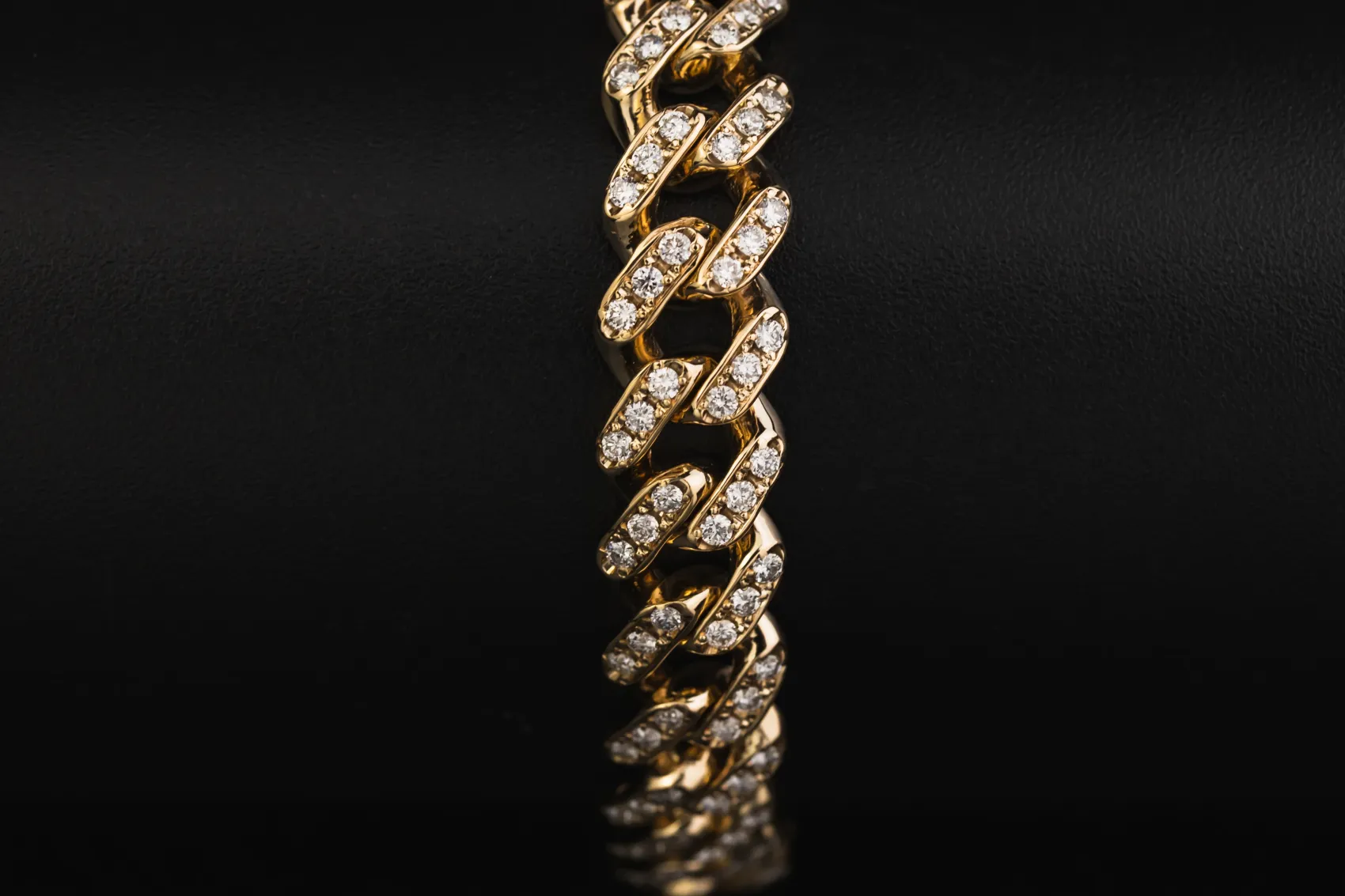 This striking 9ct yellow gold diamond Cuban bracelet measures 8.5 inches and weighs an impressive 42.1g, offering a bold and luxurious presence on the wrist. The classic Cuban link design is elevated with sparkling diamonds, adding refined brilliance to its substantial, high-quality construction.