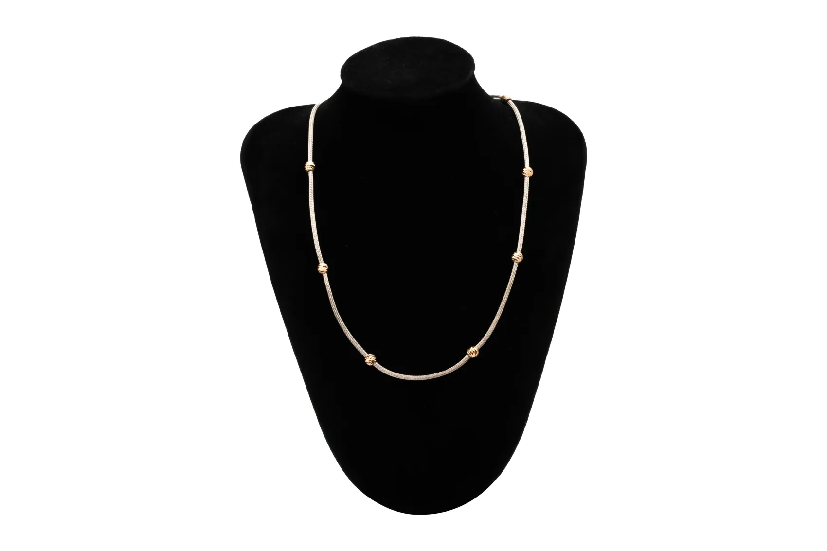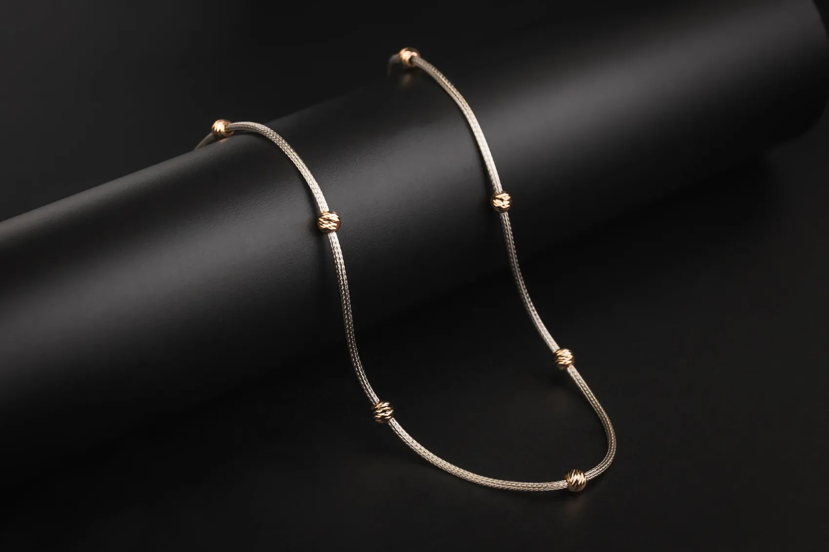 This elegant 18ct white and rose gold necklace measures 18 inches and weighs 9.4g, showcasing a beautiful blend of warm rose gold and sleek white gold for a refined, contemporary look. Its smooth, luxurious finish and balanced two-tone design make it a versatile piece that transitions effortlessly from everyday wear to special occasions.